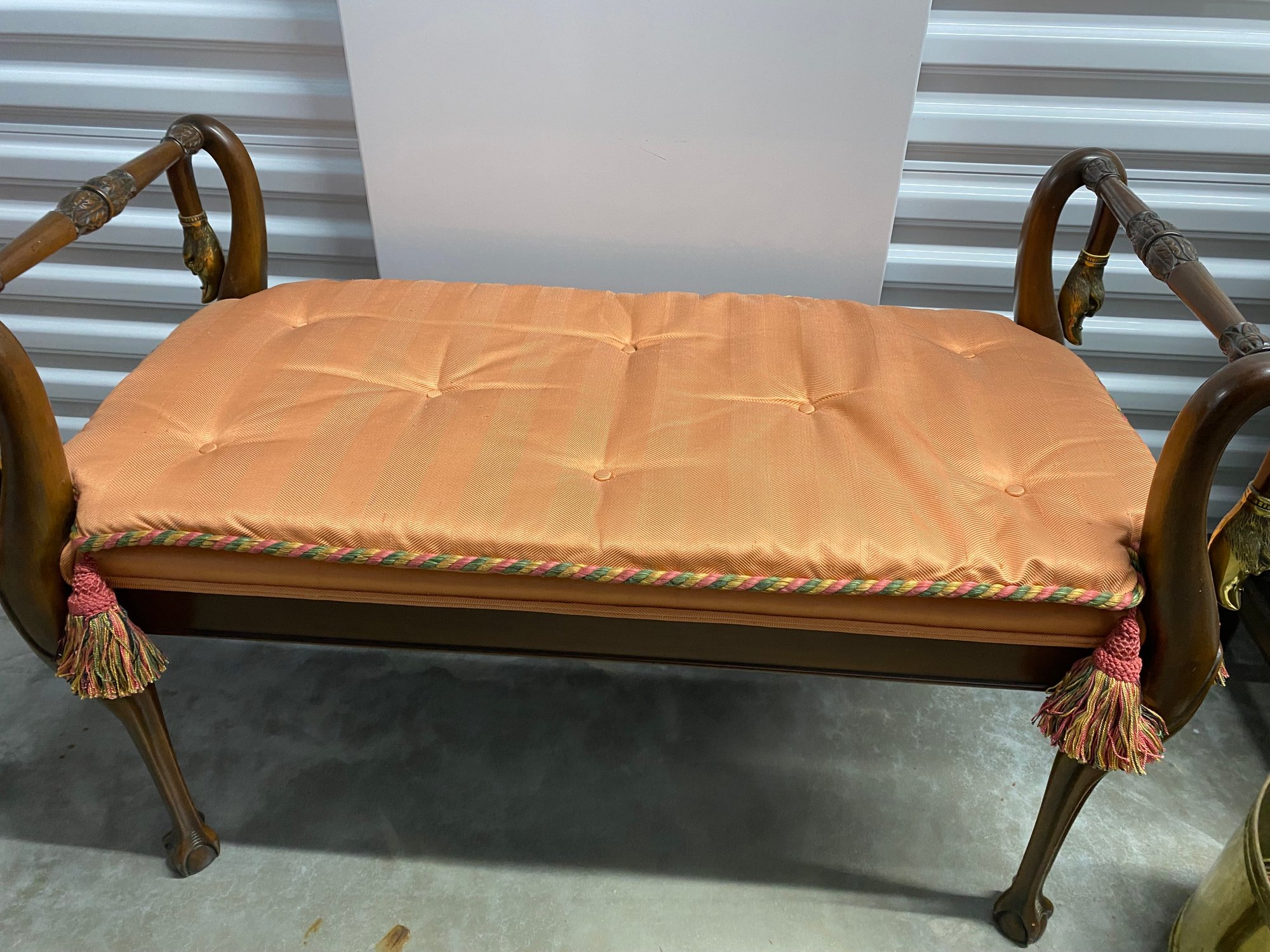 Baker bench with removable cushion. Has swan face and feet measures40”x18” wide x 27” tall good condition no rips soft melon color