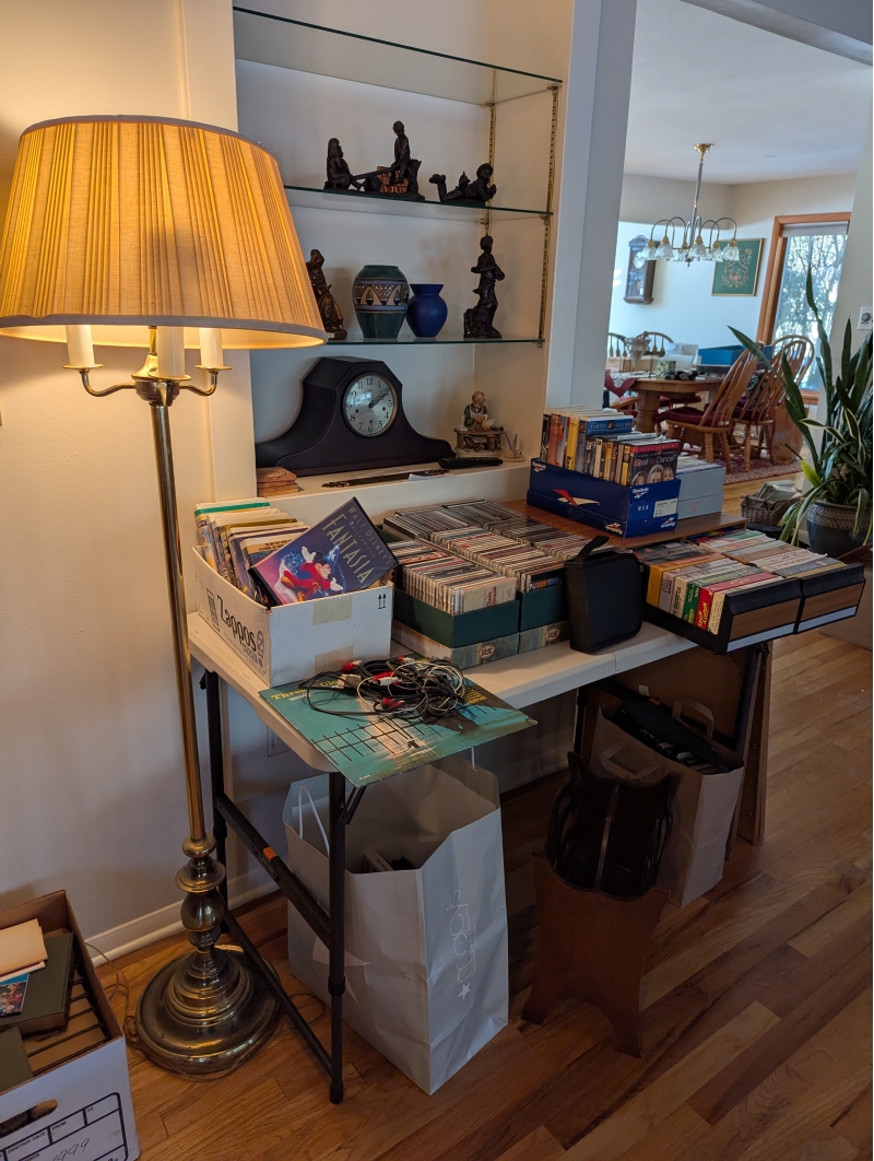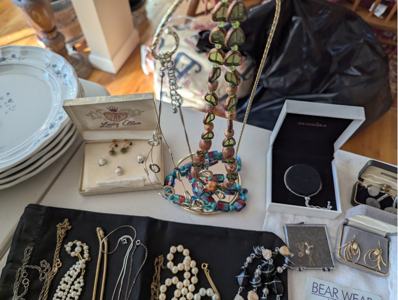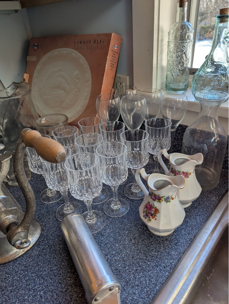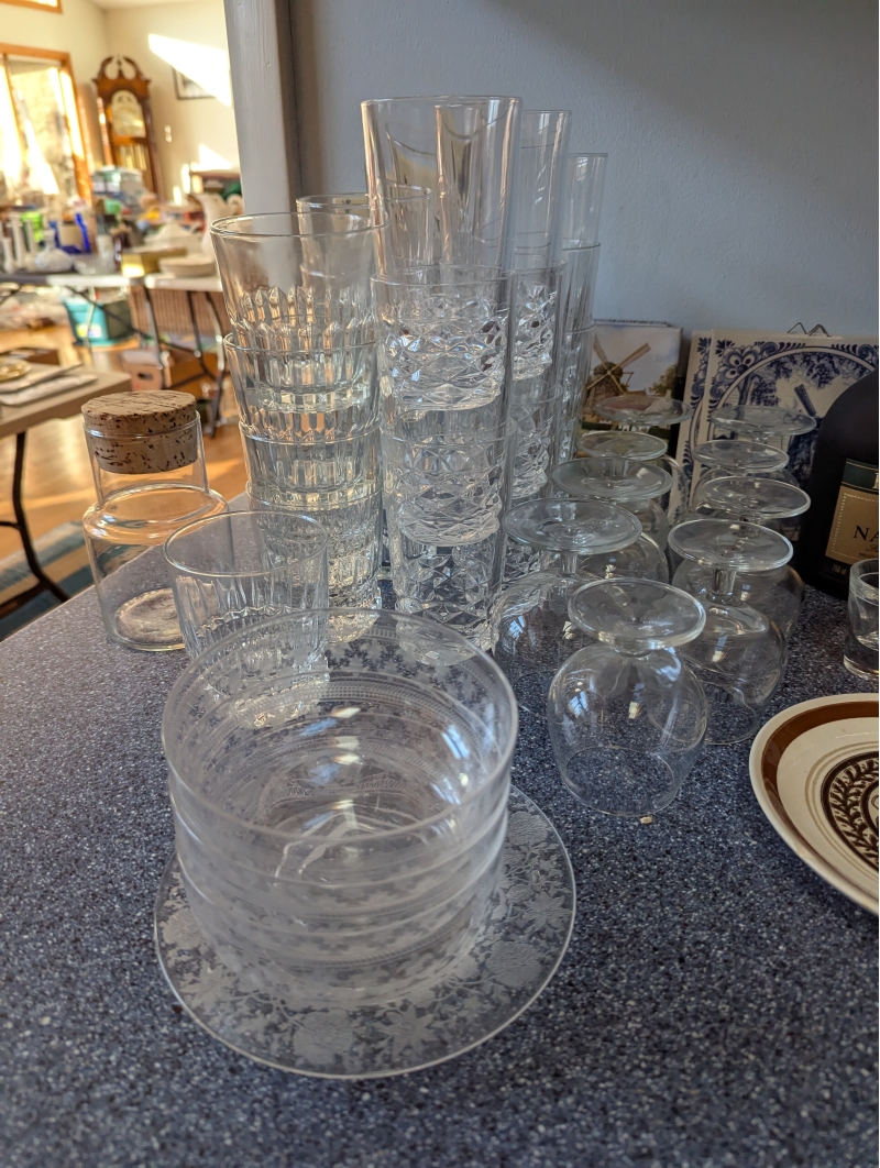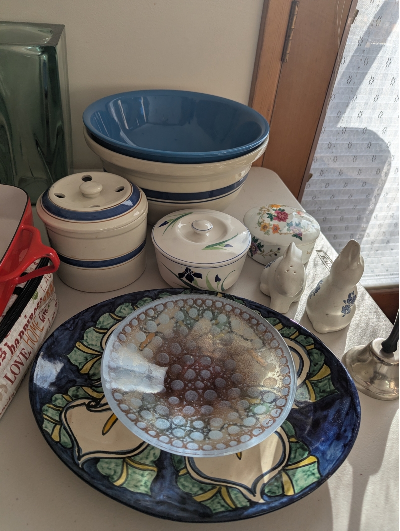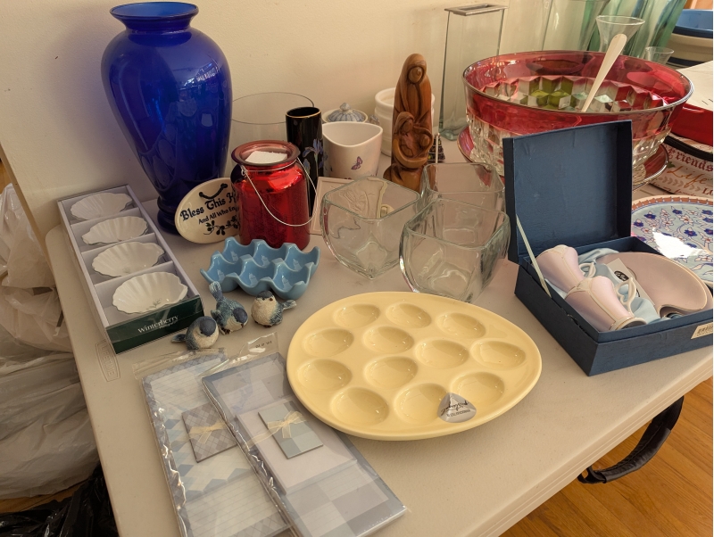Kitchen items, Fine China, huge red glass collection, serving dishes and bowls, flatware, baskets, bags, Art, CDs, books, VHS, kids games and toys, clocks, and cameras