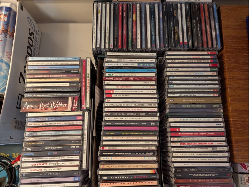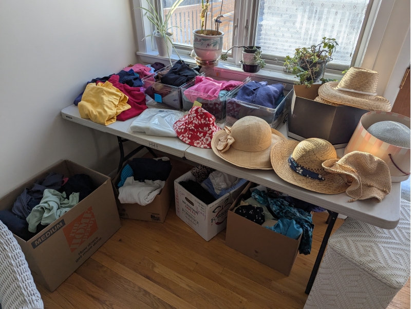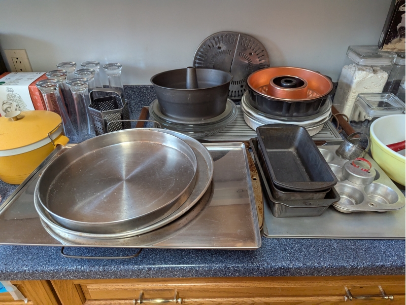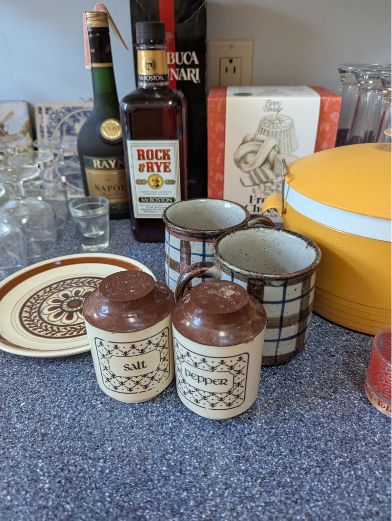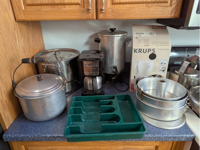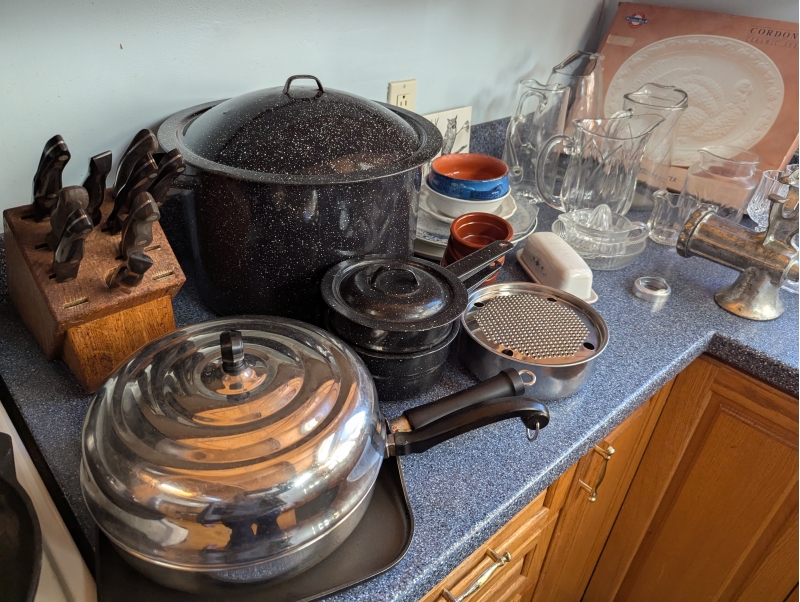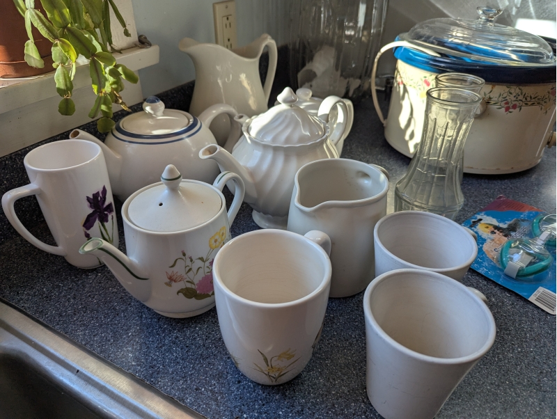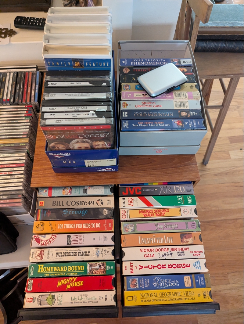 Kitchen items, Fine China, huge red glass collection, serving dishes and bowls, flatware, baskets, bags, Art, CDs, books, VHS, kids games and toys, clocks, and cameras