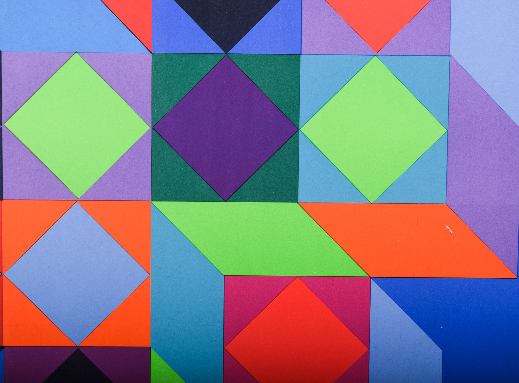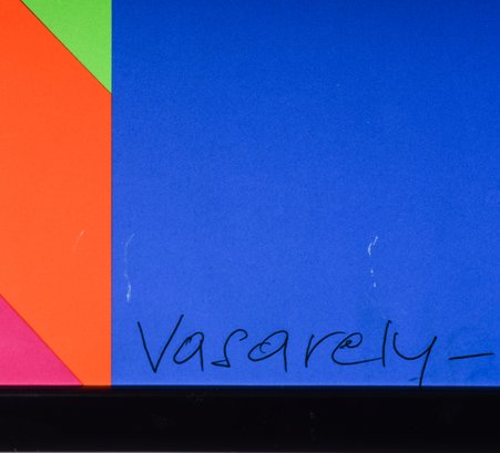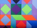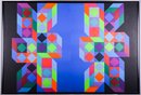 Known as the Father of Op Art, Vasarely's complex geometric work was designed to fool the eye with impossible constructions. Vaserely was commissioned by The World Olympics Committee to create this image for the1972 Olympics promotion. Two serigraph posters are mounted and framed , side-by-side, with the right poster flipped, and creating a single dynamic image. Both posters are signed in the plate.
