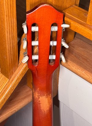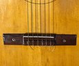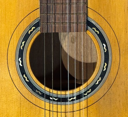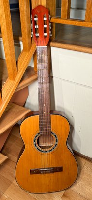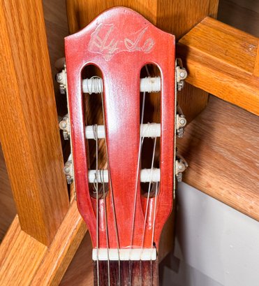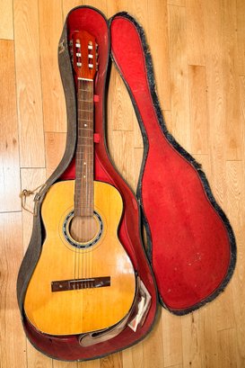 A vintage 60's Hy-Lo classical guitar. Hy-Lo guitars were budget-friendly, Japanese-made instruments produced by Hoshino Gakki—the company behind Ibanez—in their Tama factory during the mid-to-late 1960s, good vintage condition with honest neck wear, comes with leather strap, capo, strings, case, a Pocket Pal harmonice and 2 holders.