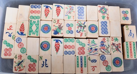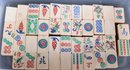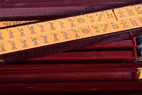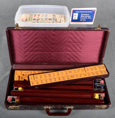 A vintage Bakelite (Catalin) American Mah-jongg set, likely dating from the 1940s to 1950s. Complete sets with this specific marbled, deep burgundy rack style and butterscotch-colored tiles are very desirable. It comes in its original embossed alligator pattern case with a red catalin handle, a group of bamboo-backed tiles and rules from the National Mah-jongg league
