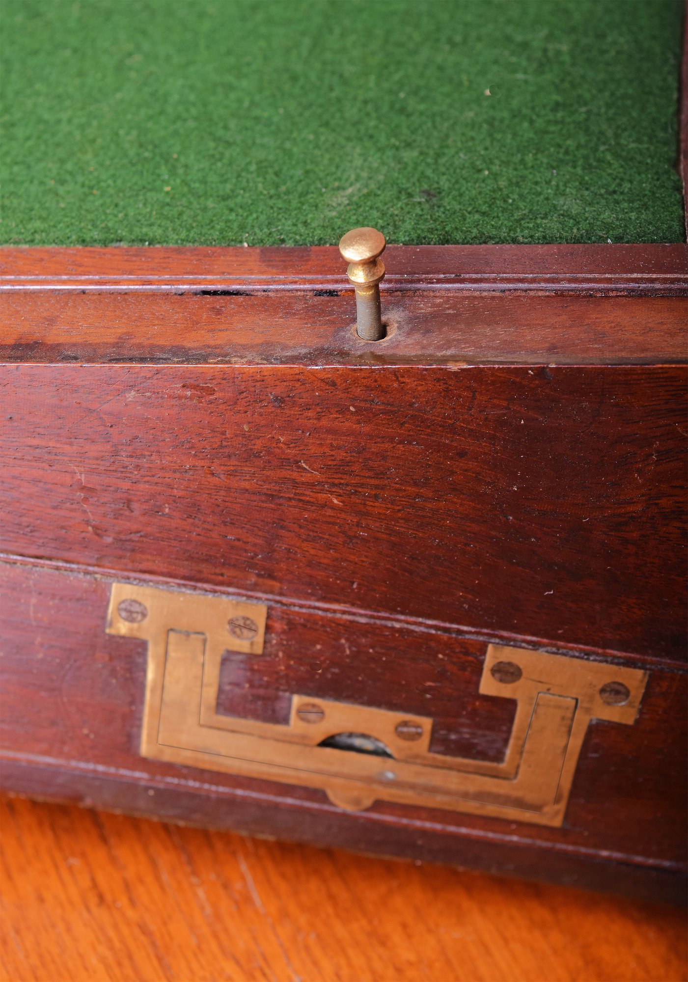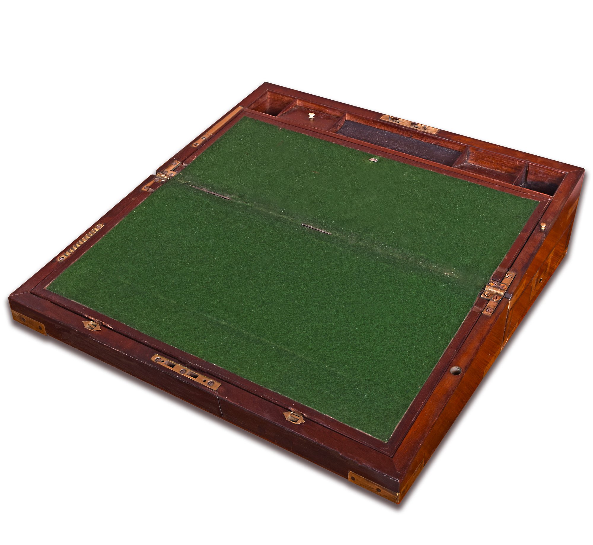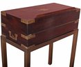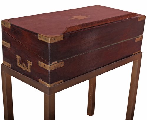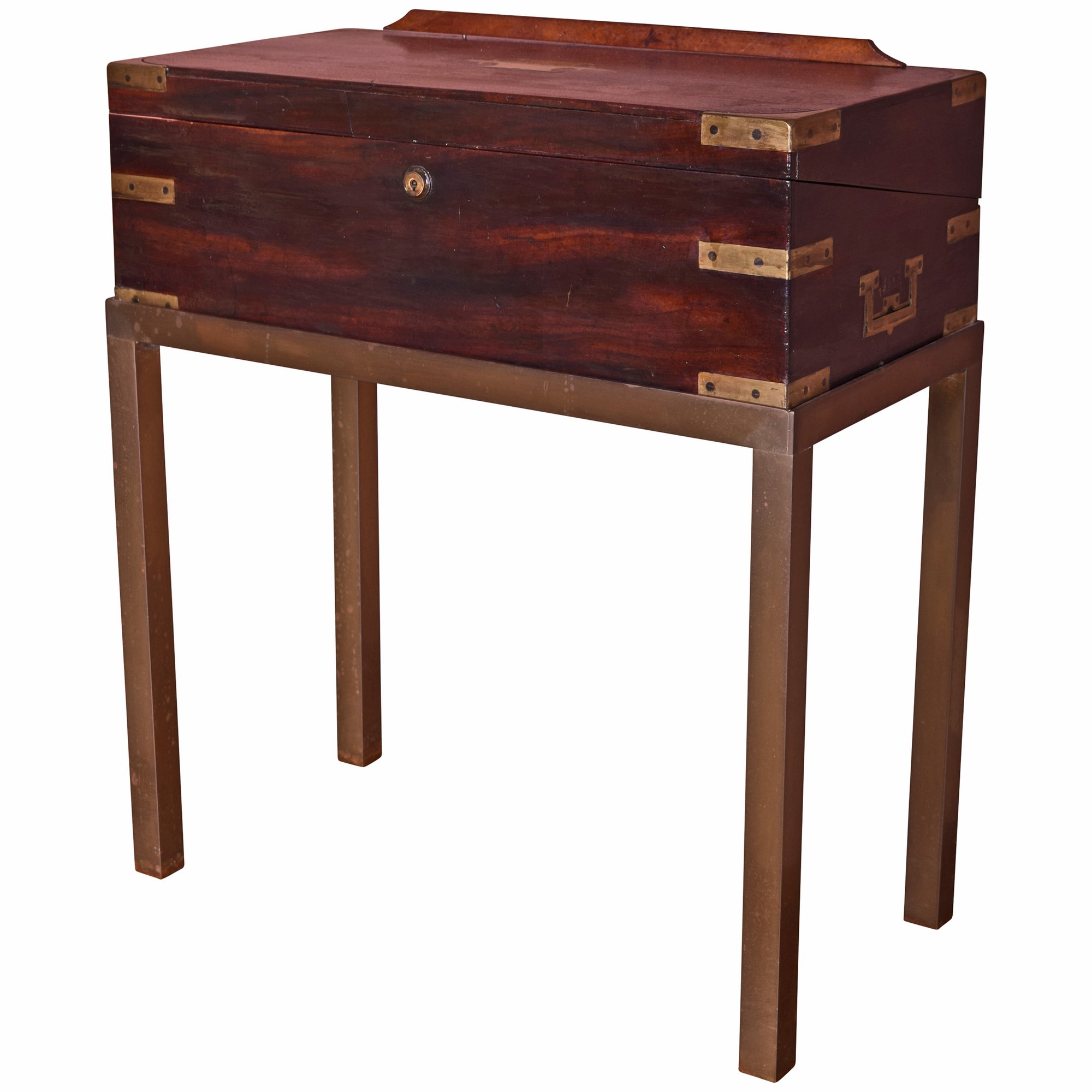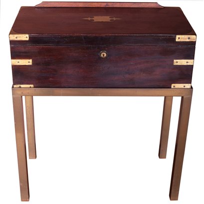 Antique English Mahogany and Brass Campaign Desk/Portable Writing Desk (C. 1800-1815) on brass stand by J. Bramah of Picadilly, legendary locksmith, engineer and one of the most prolific inventors of the Industrial Revolution. (J. Bramah also invented the hydraulic press, the first flushable toilet, a beer engine and a quill sharpener!) This unique campaign desk features multi-level compartments for writing, storage, pens, inkwells and accoutrements. Intricately complicated locking hardware and hidden compartments are accessed by combination rod (included) and key (missing). Solid brass stand not original. Recessed handles, brass inlays and rare coromandel veneer contribute to the appearance. Own this extremely well-made example of ingenuity and craftsmanship--It will surely be a conversation piece for your home or office!