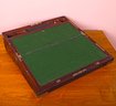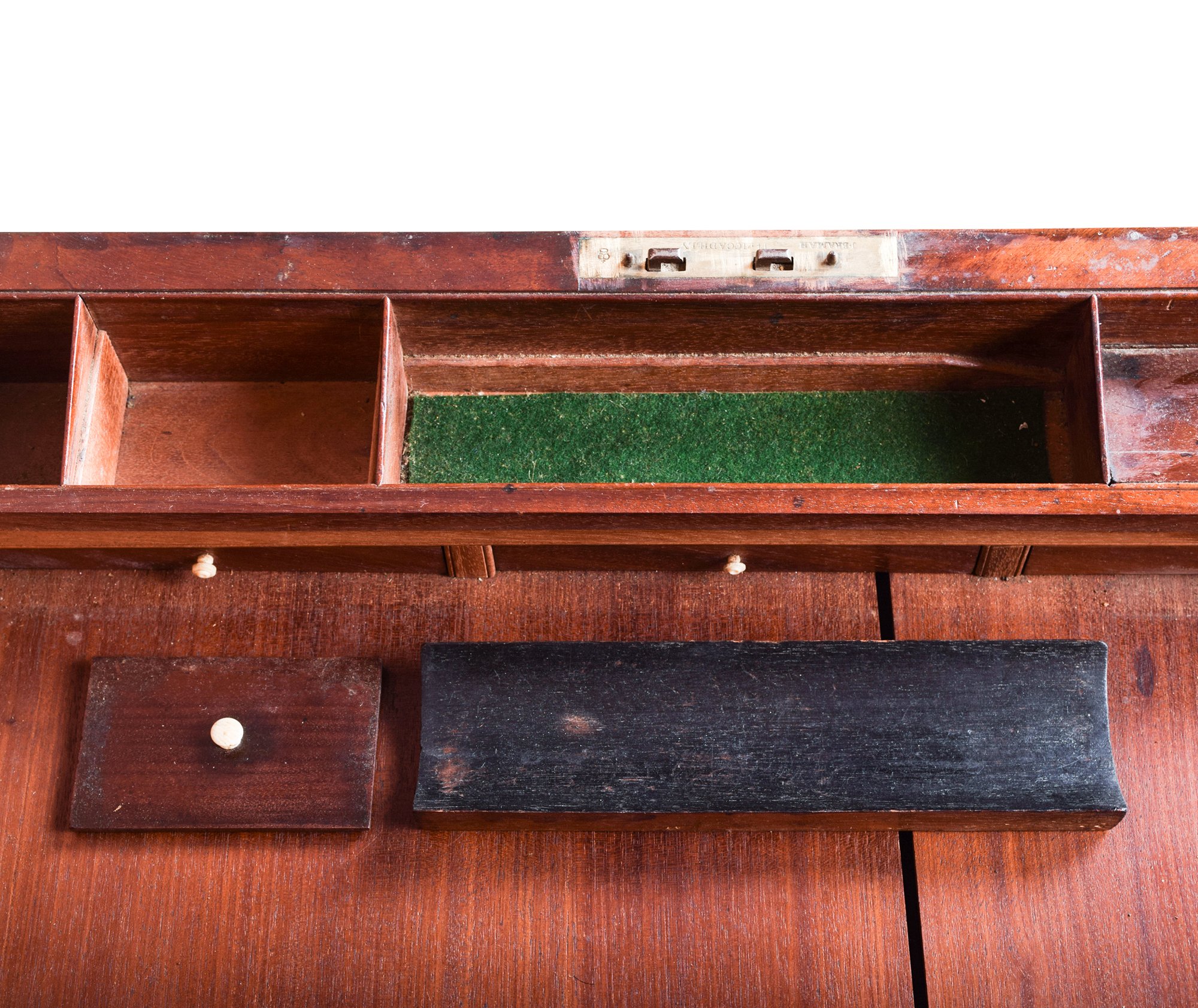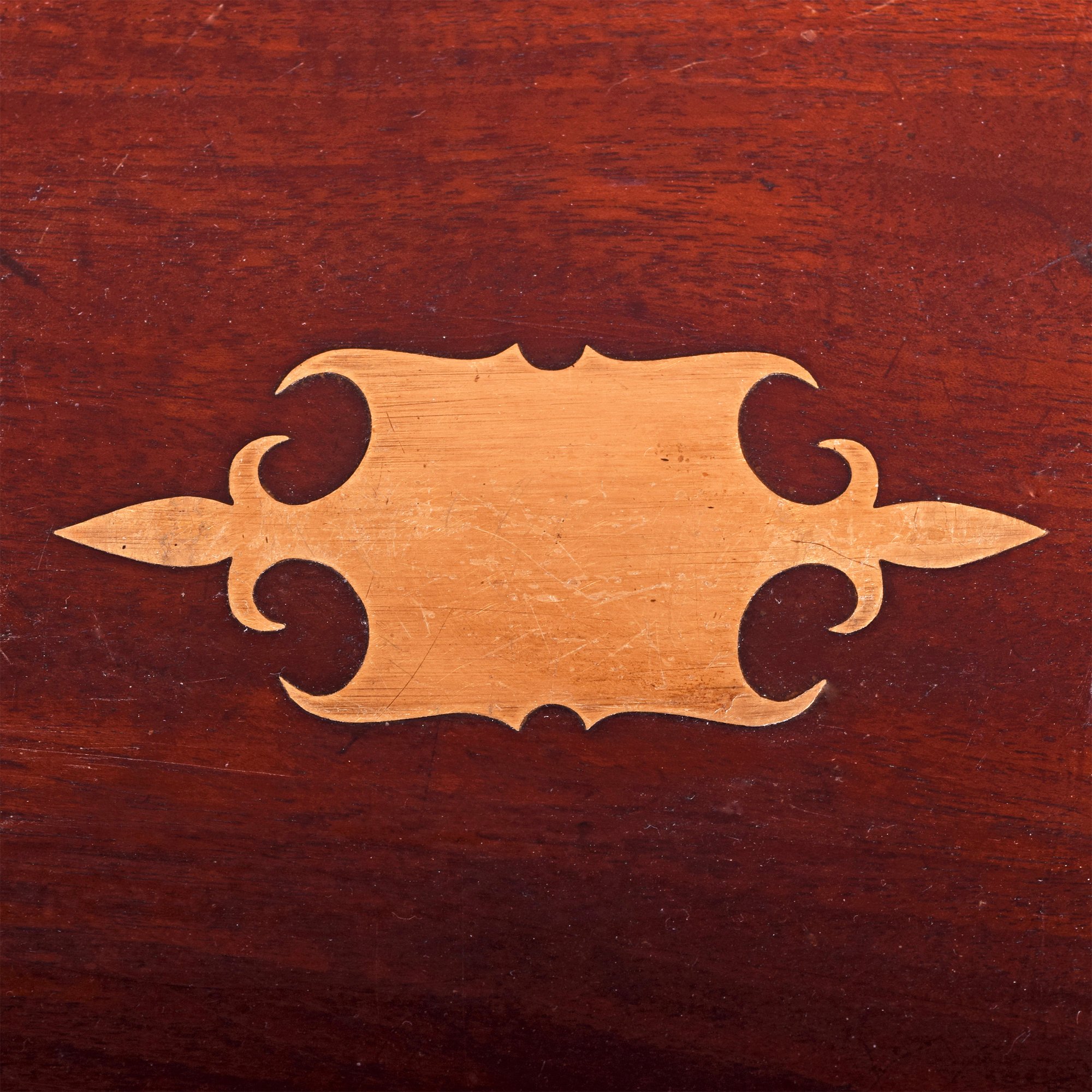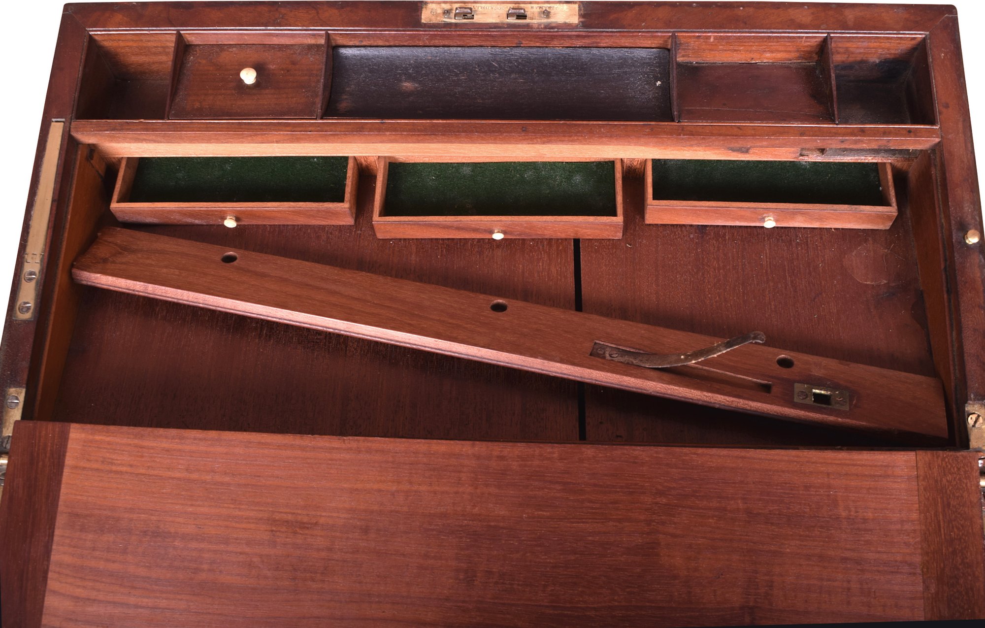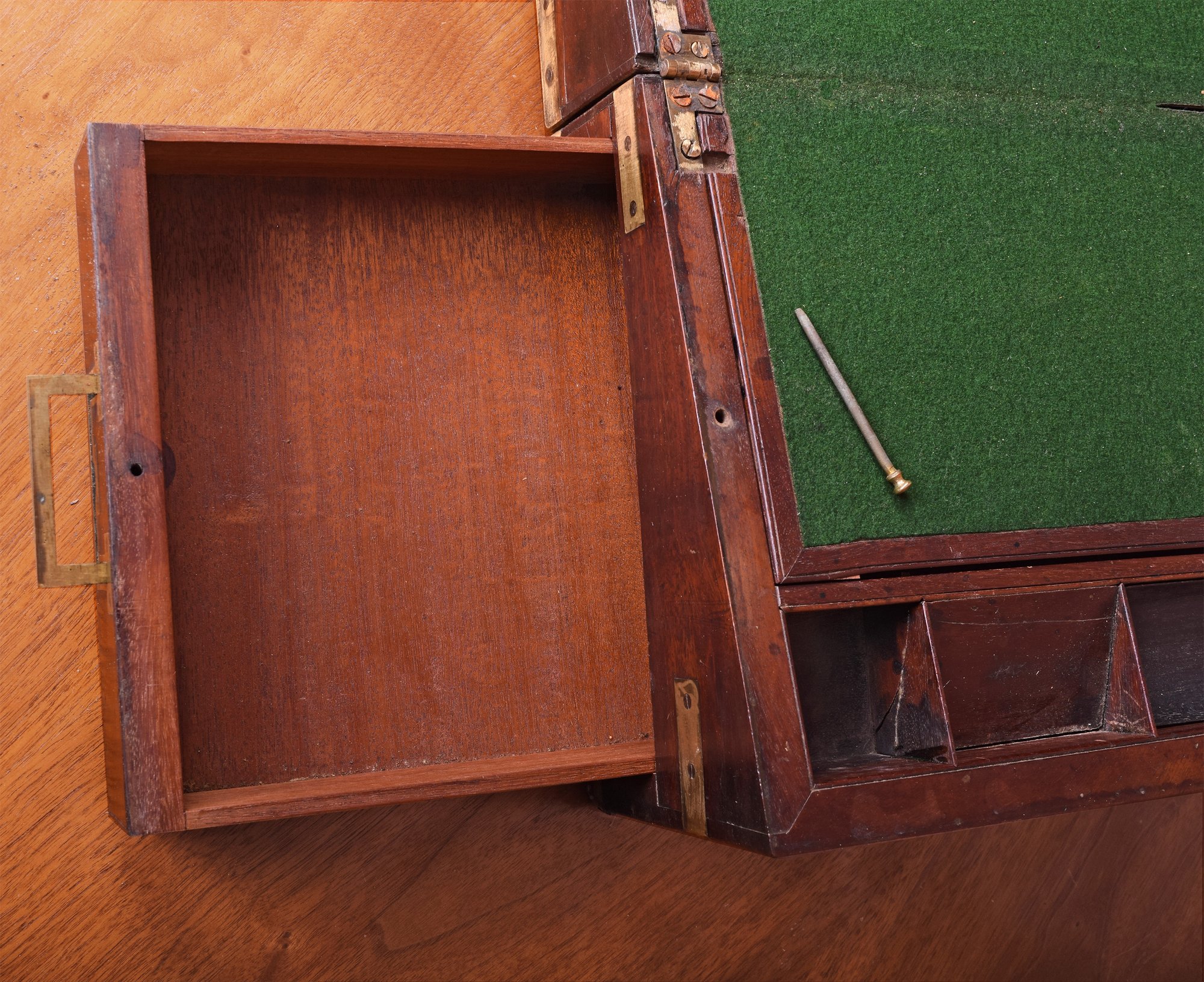 Antique English Mahogany and Brass Campaign Desk/Portable Writing Desk (C. 1800-1815) on brass stand by J. Bramah of Picadilly, legendary locksmith, engineer and one of the most prolific inventors of the Industrial Revolution. (J. Bramah also invented the hydraulic press, the first flushable toilet, a beer engine and a quill sharpener!) This unique campaign desk features multi-level compartments for writing, storage, pens, inkwells and accoutrements. Intricately complicated locking hardware and hidden compartments are accessed by combination rod (included) and key (missing). Solid brass stand not original. Recessed handles, brass inlays and rare coromandel veneer contribute to the appearance. Own this extremely well-made example of ingenuity and craftsmanship--It will surely be a conversation piece for your home or office!