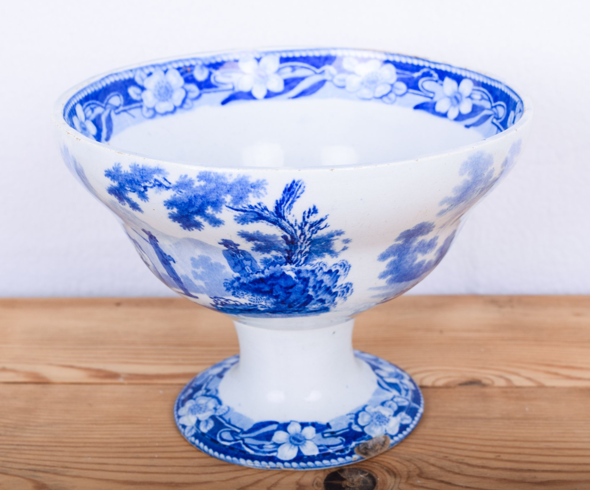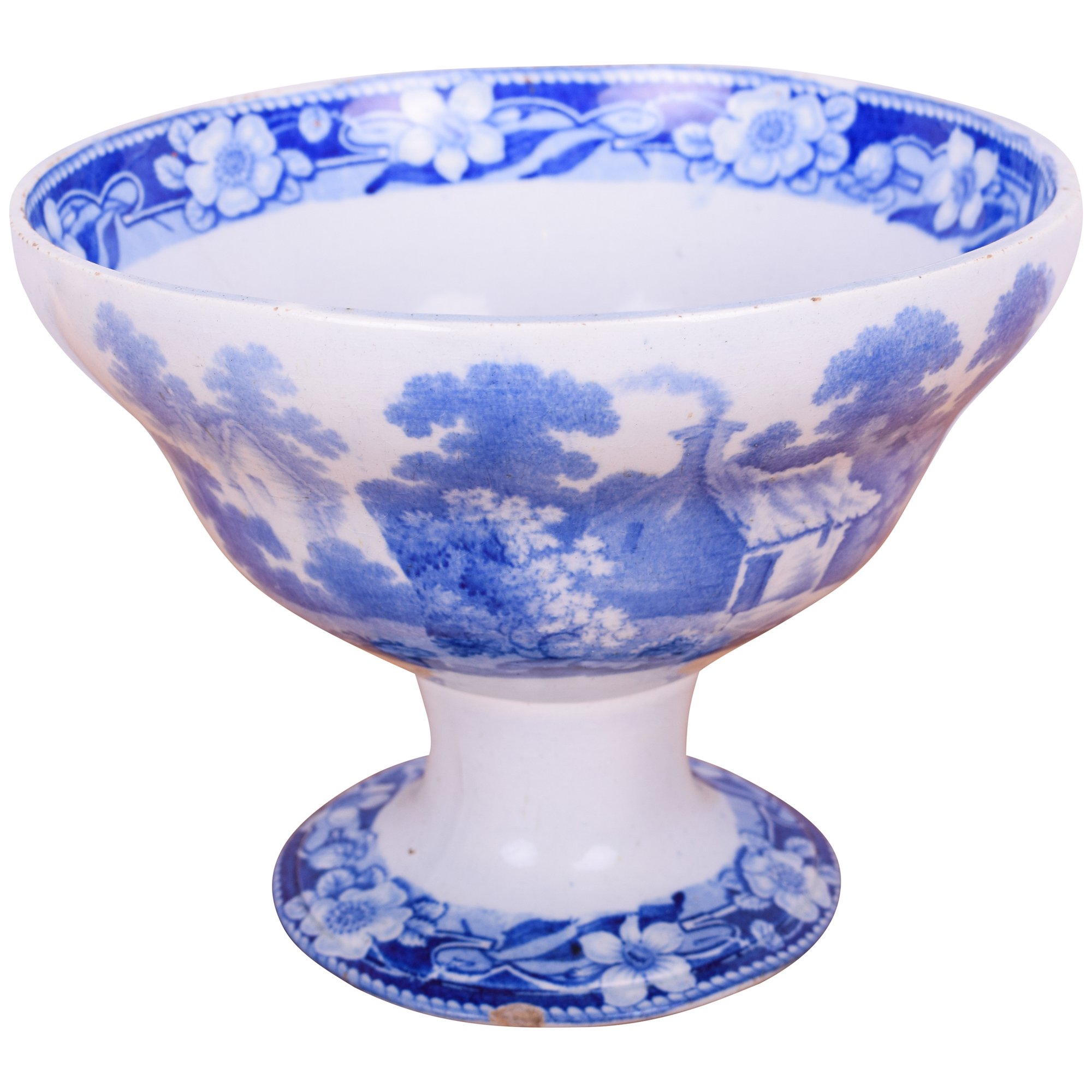 (1) 7"x5" Footed Compote, transferware, rural scenes of cows, cottage, people with floral border (tiny chip on base)