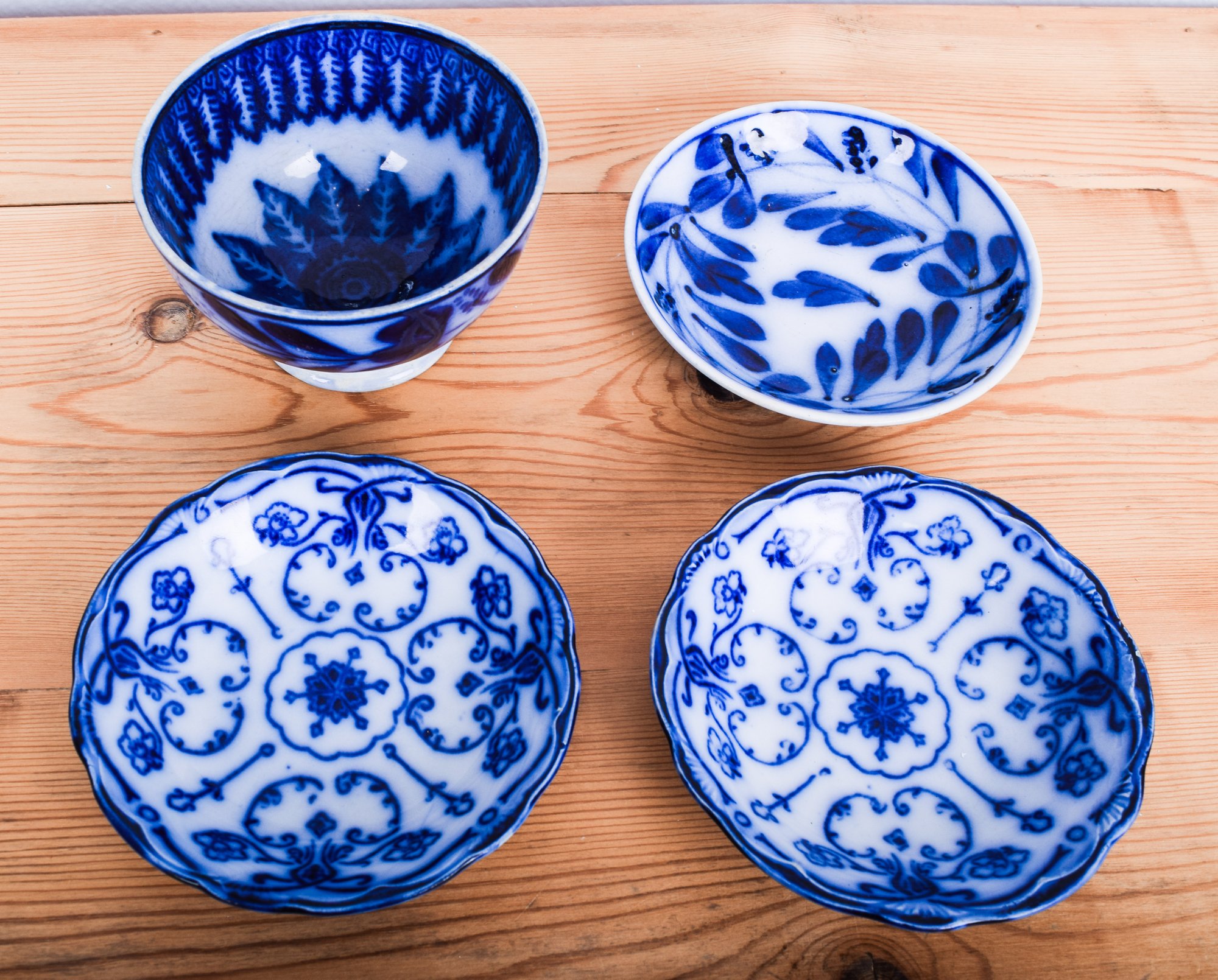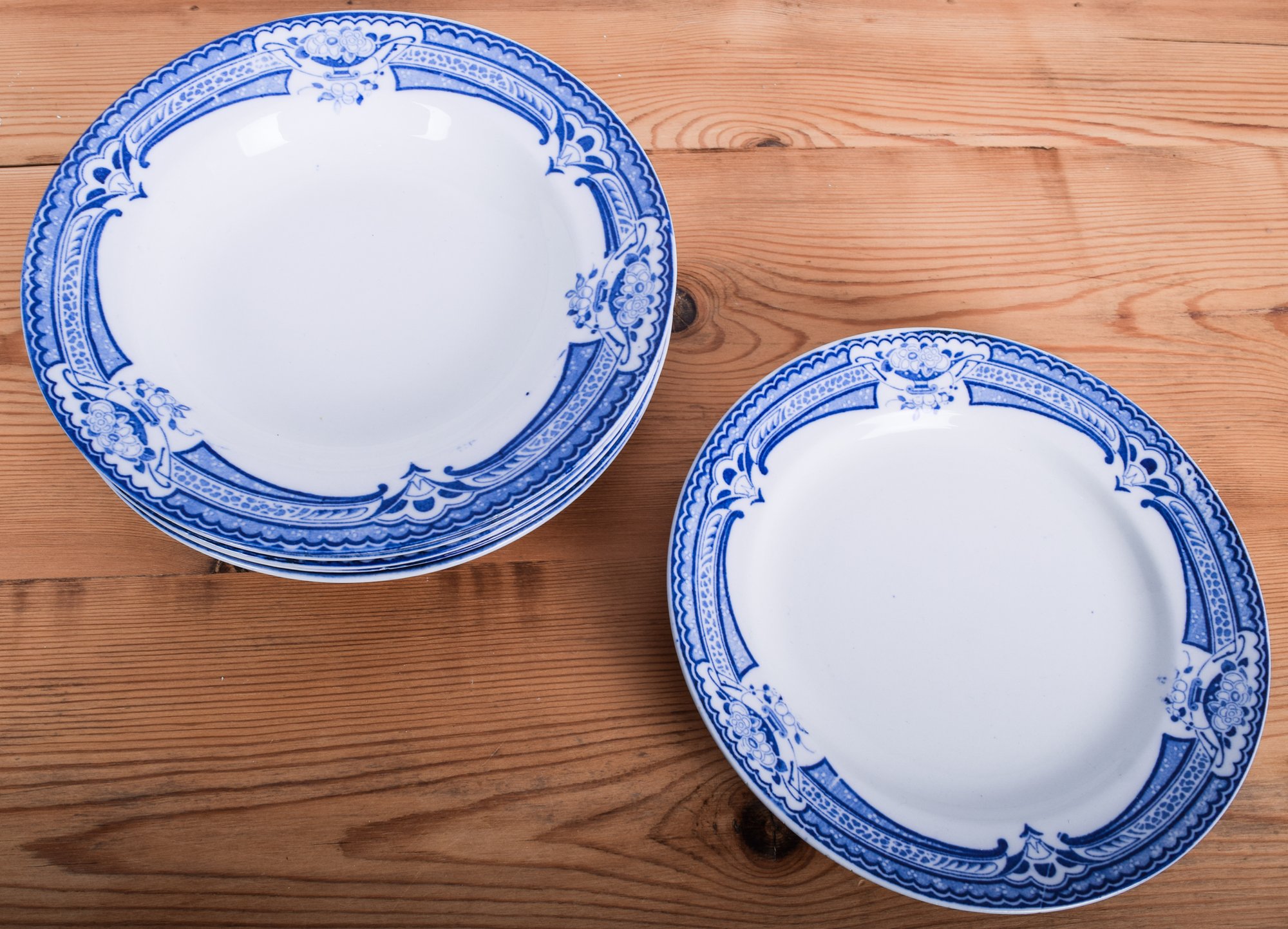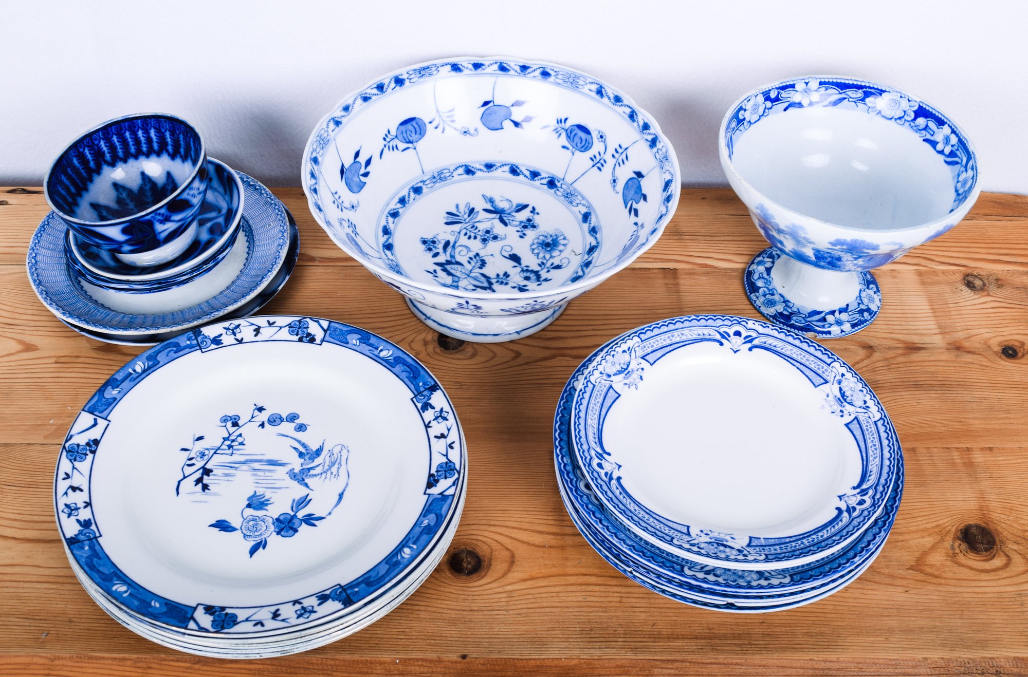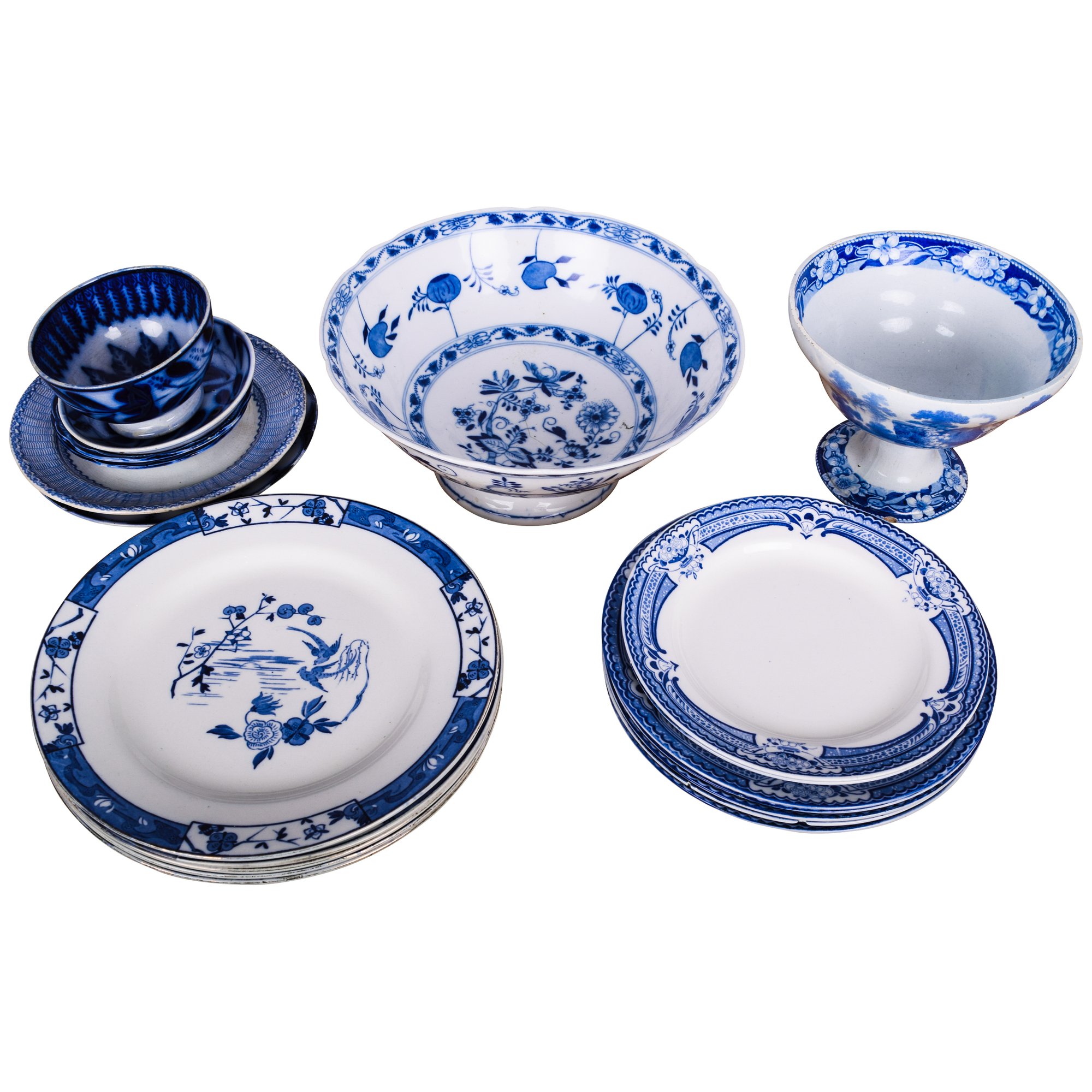 Notes: Minor defects, won't distract from display, but perhaps not all safe for food. Large bowl and compote have a single tiny nick in the base. All in remarkably good condition considering their age and use.