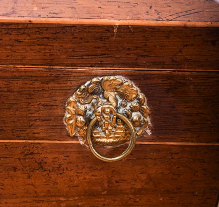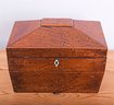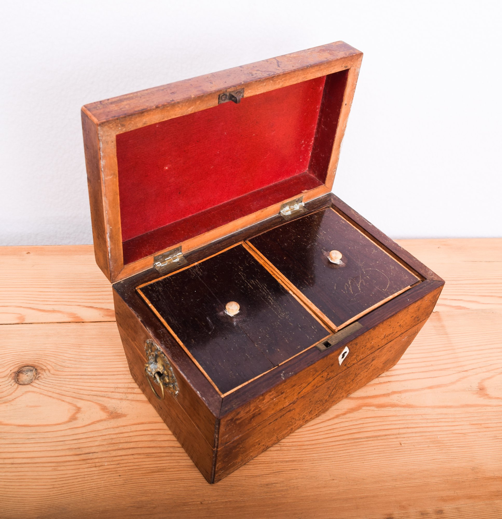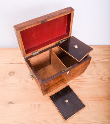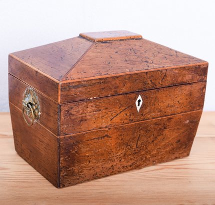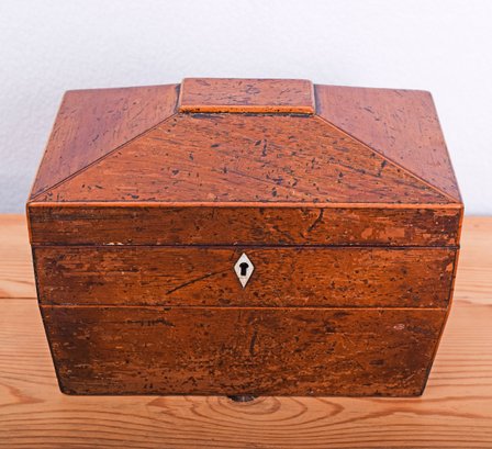 19th century English Tea Caddy in the shape of a sarcophagus, with diminutive brass grape-basket handles opens to 2 interior lidded compartments, side by side. Lovely tiny hardware on the little antique treasure chest.
