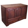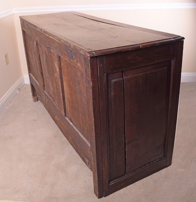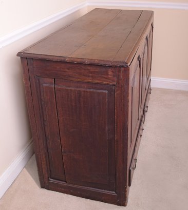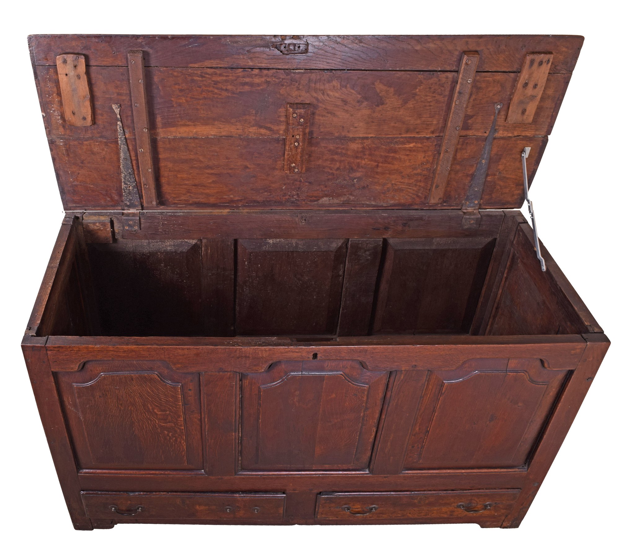 Antique, massive top-opening chest with 3 incised panels facing front, one square panel incised on each side, 2 roomy drawers with brass handles below, on bracketed feet. Wooden peg construction, hand-cut irregular country-style dovetail joints, strait-saw cuts and wide planking on top suggests 17th C. construction.