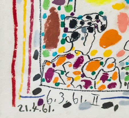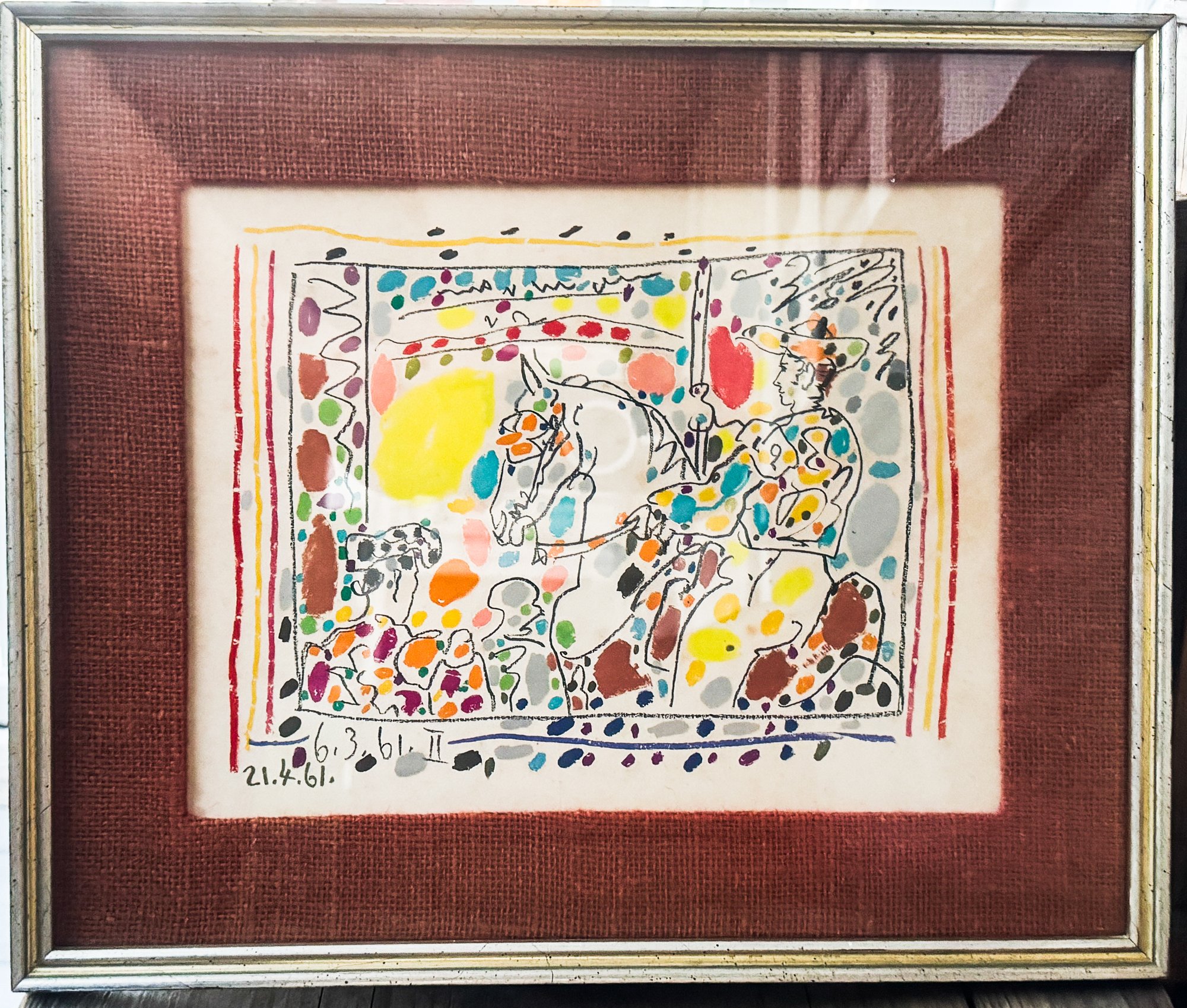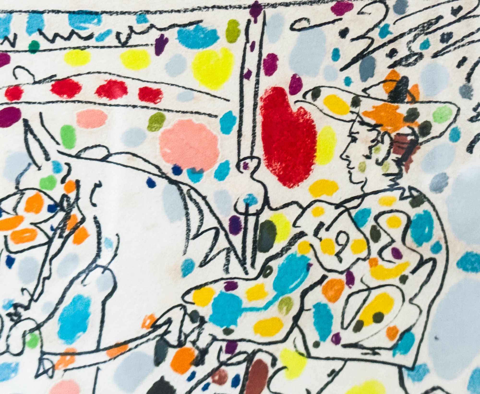 Picasso lithograph "Le Picador II" from 1961 series by Picasso about bullfighting and Spanish culture. Printed on wove paper, dated in plate. Paper has been glued to matting, some foxing and discoloration (yellowing) of paper.