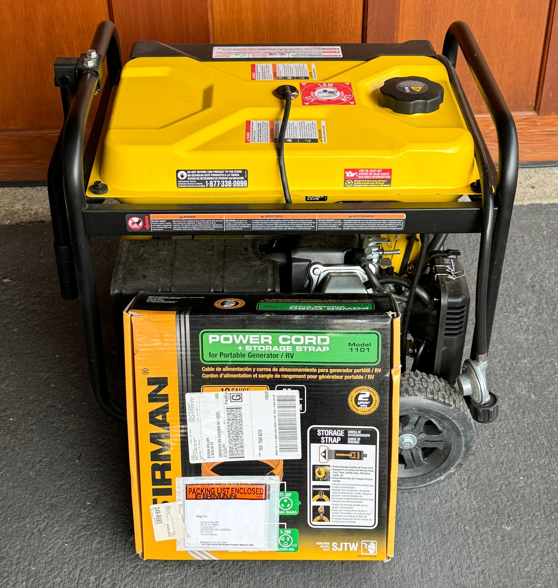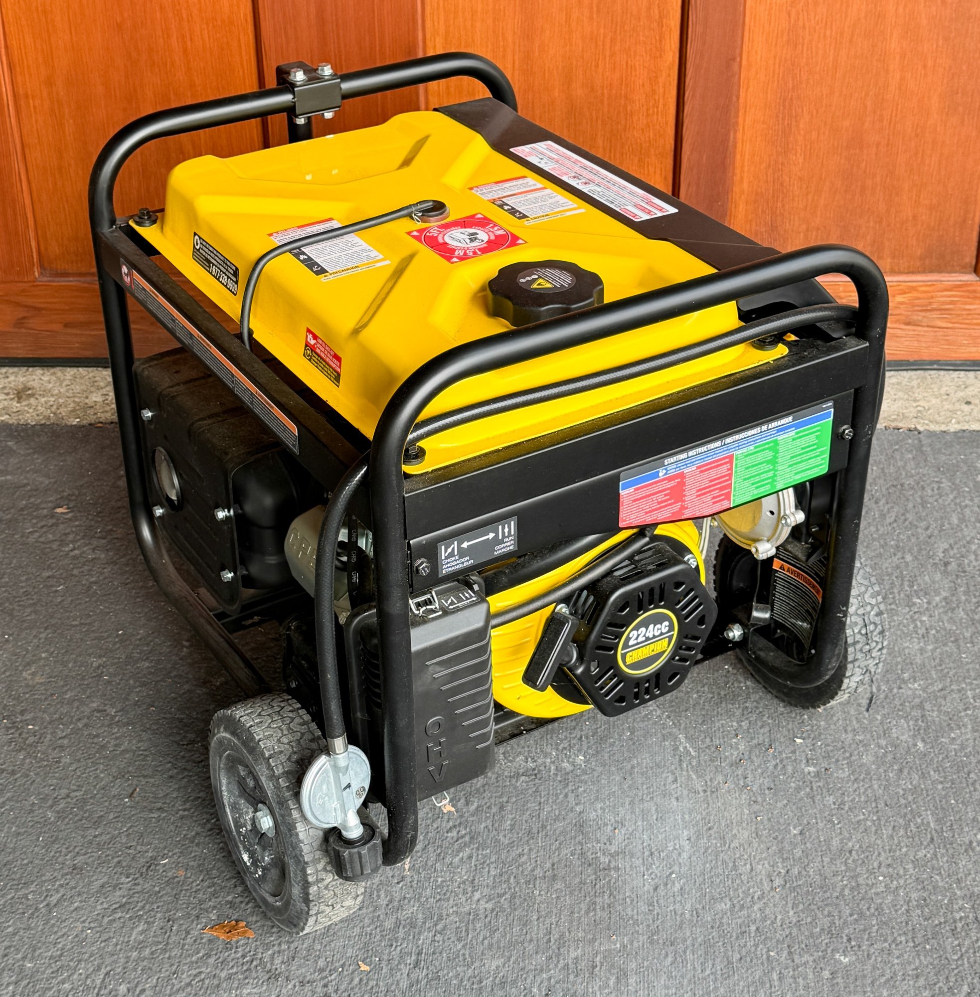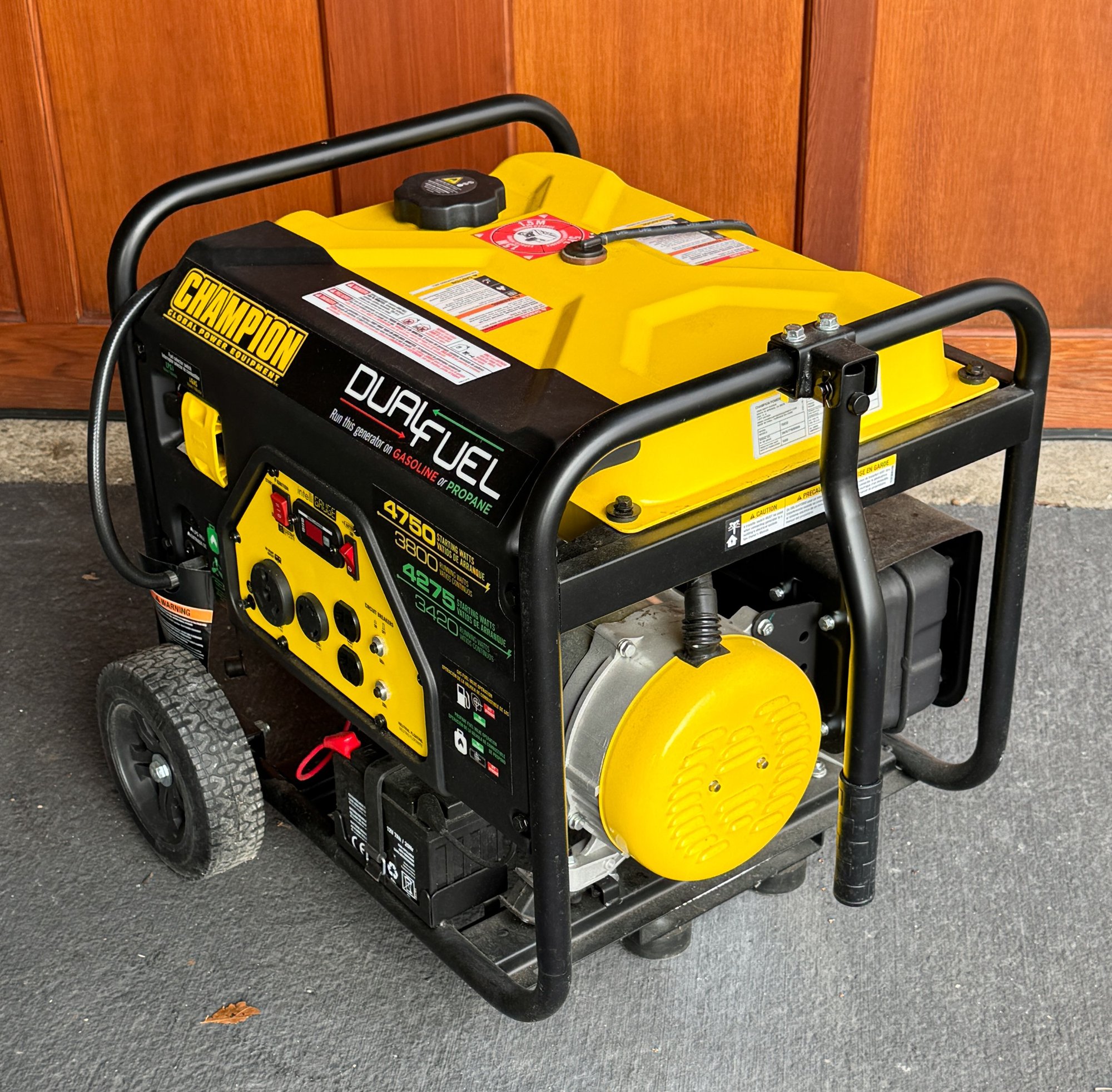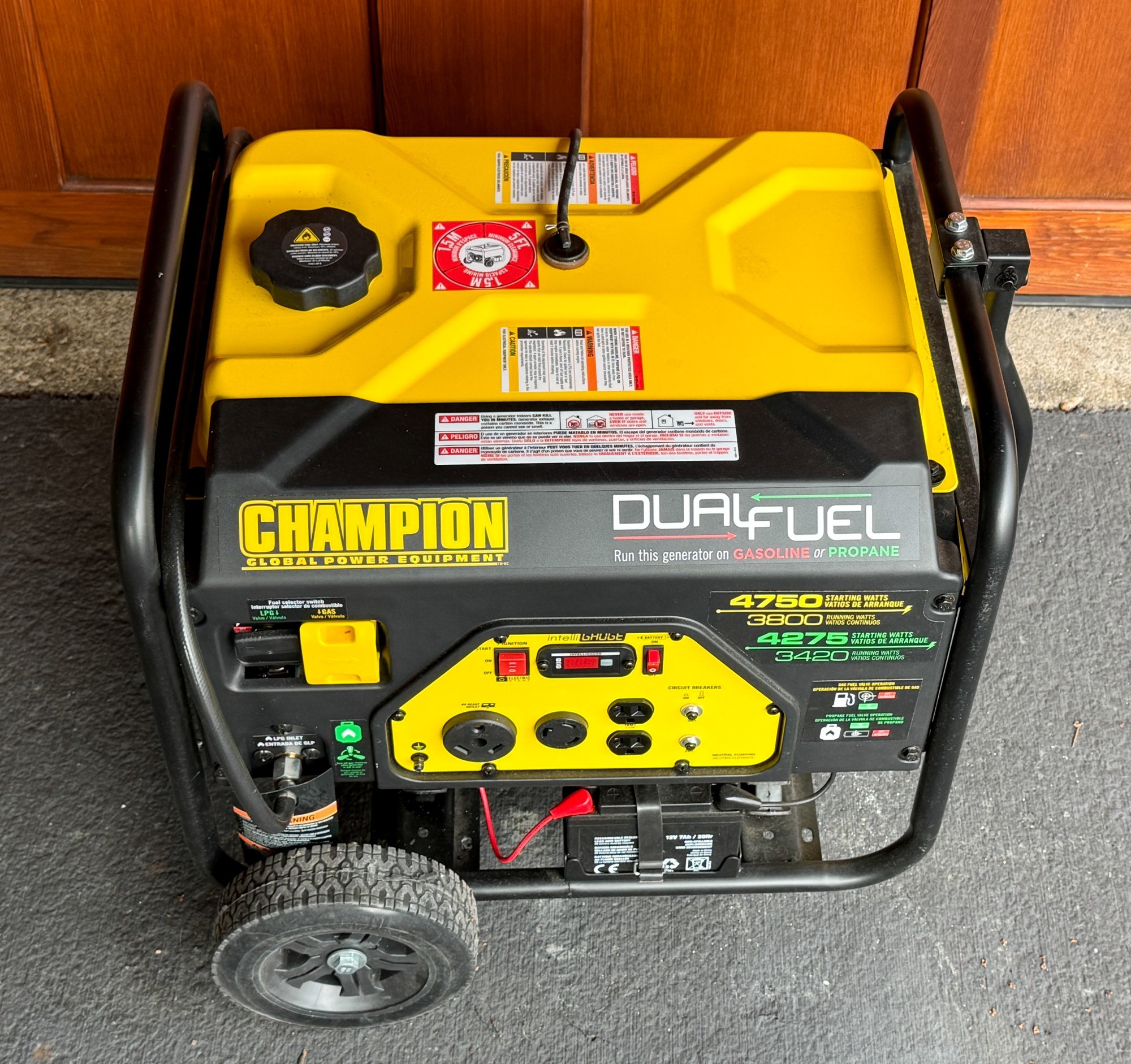 Champion Power Equipment 3800-Watt Dual Fuel Portable Generator. Produces 4750 starting watts and 3800 running watts on gasoline; 4275 starting watts and 3420 running watts on propane. Powered by a 224cc Champion engine featuring an electric start toggle switch with the battery included. Offers up to 9 hours of runtime on gasoline at 50% load, or 10.5 hours on a 20 lb. propane tank at 50% load.