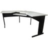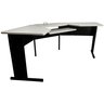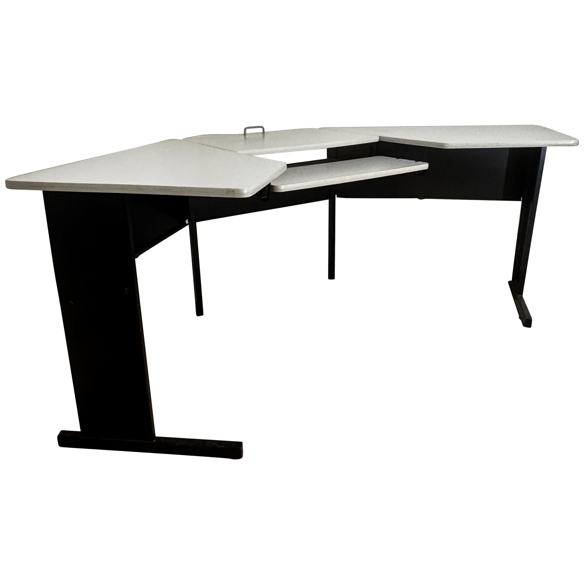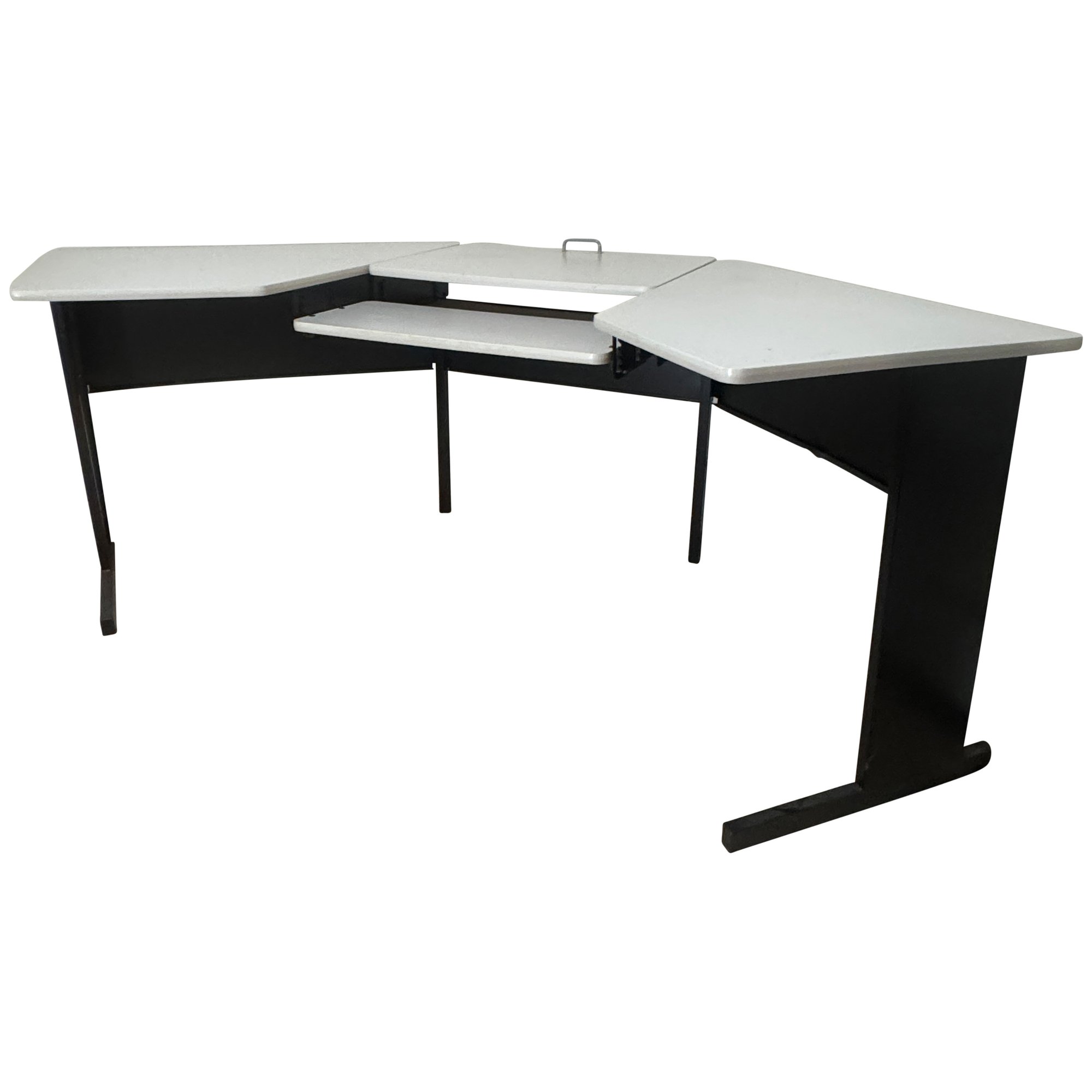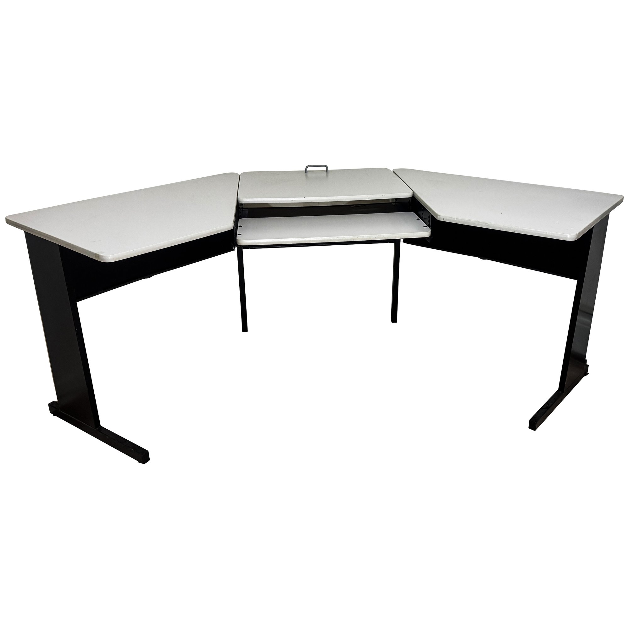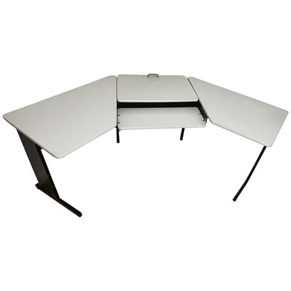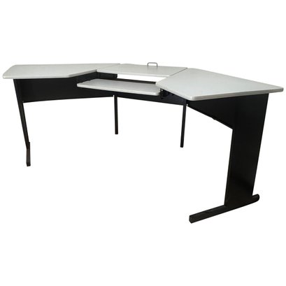 Early flat-pack corner computer desk, unidentified maker, C.1970s-80s. Exceptionally sturdy with recessed level for keyboard. Sturdy with metal brackets and leg supports. Can be disassembled and reassembled for transport. Measures 60" both sides, to corner. Corner section is 23 deep, height is adjustable, approx 34"