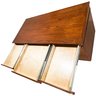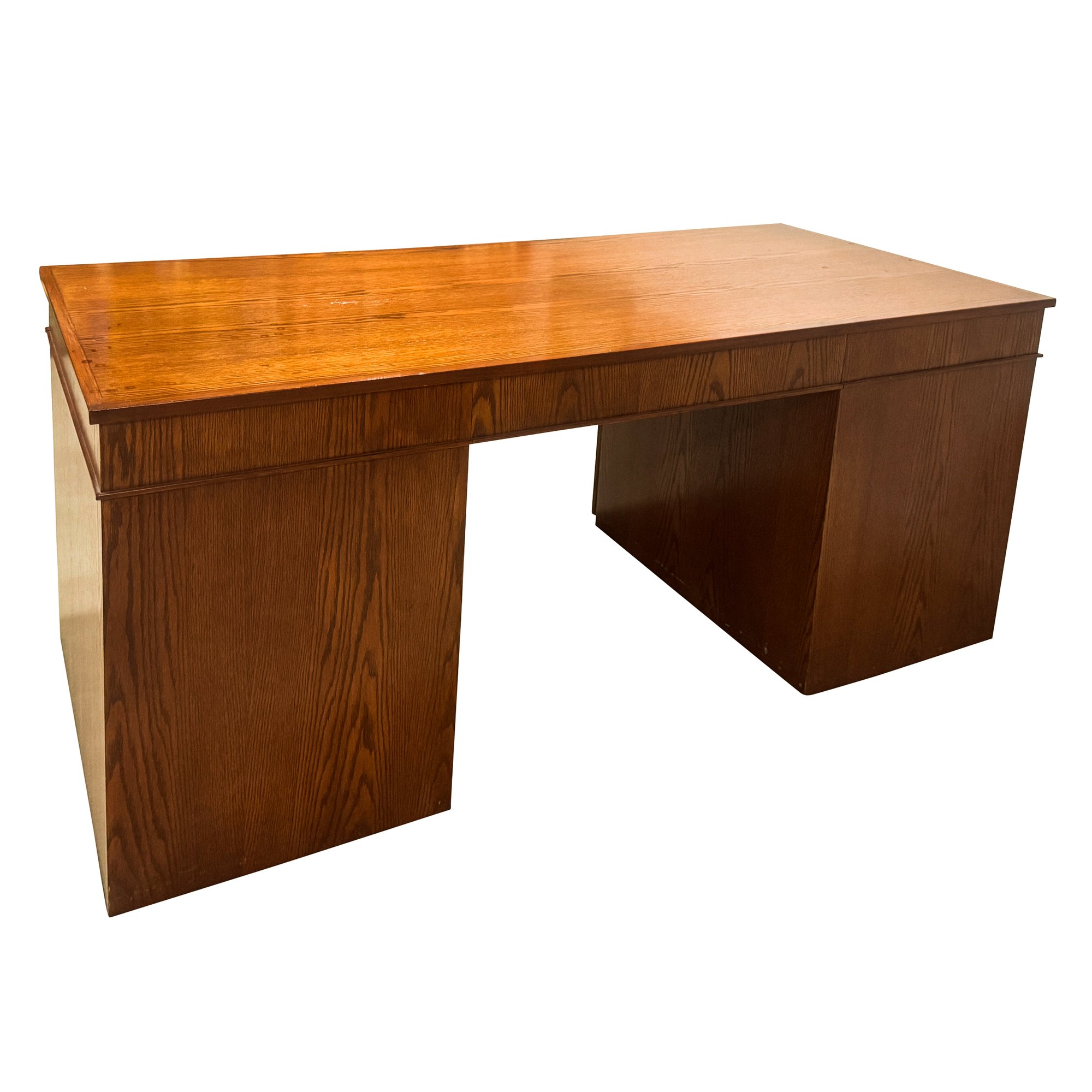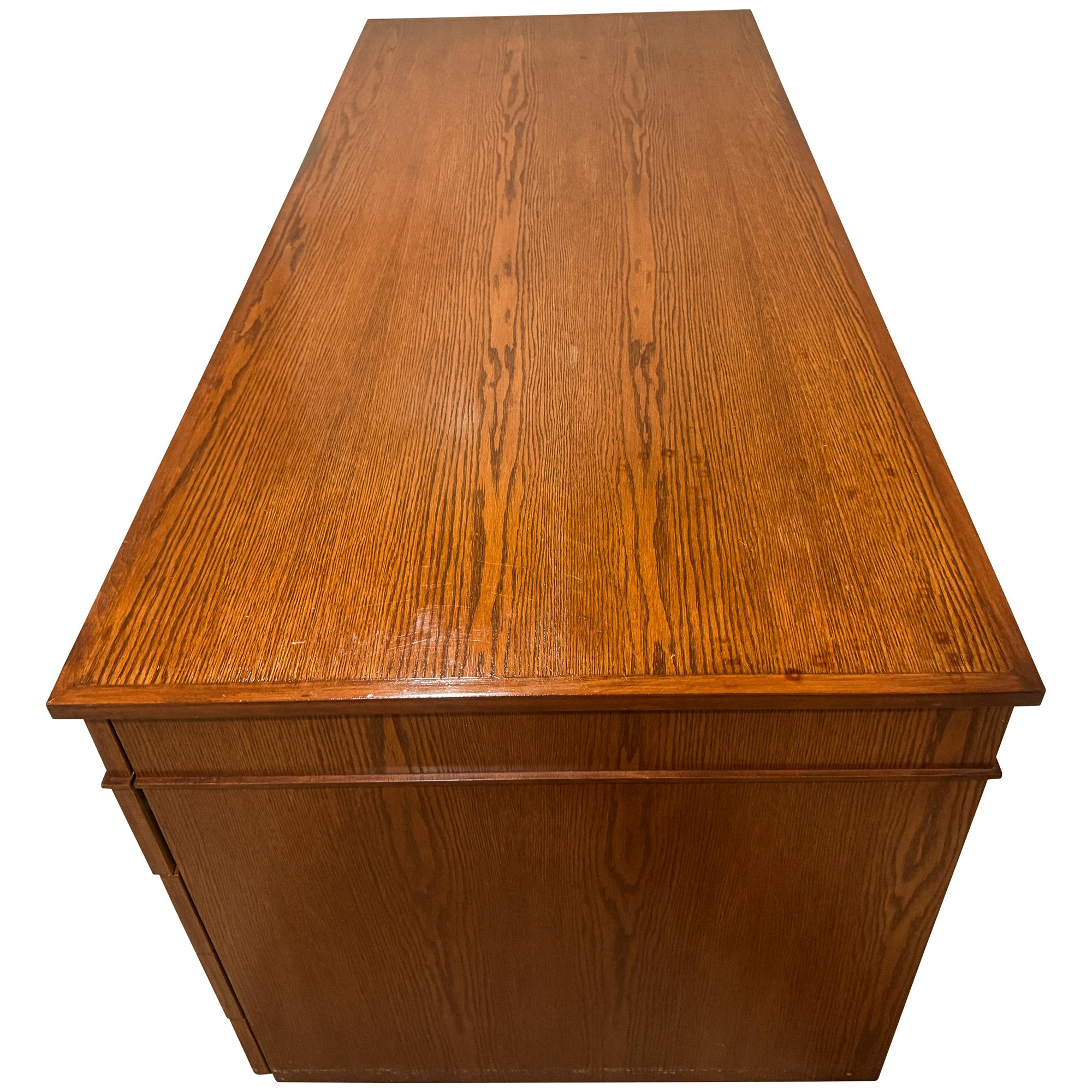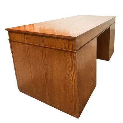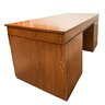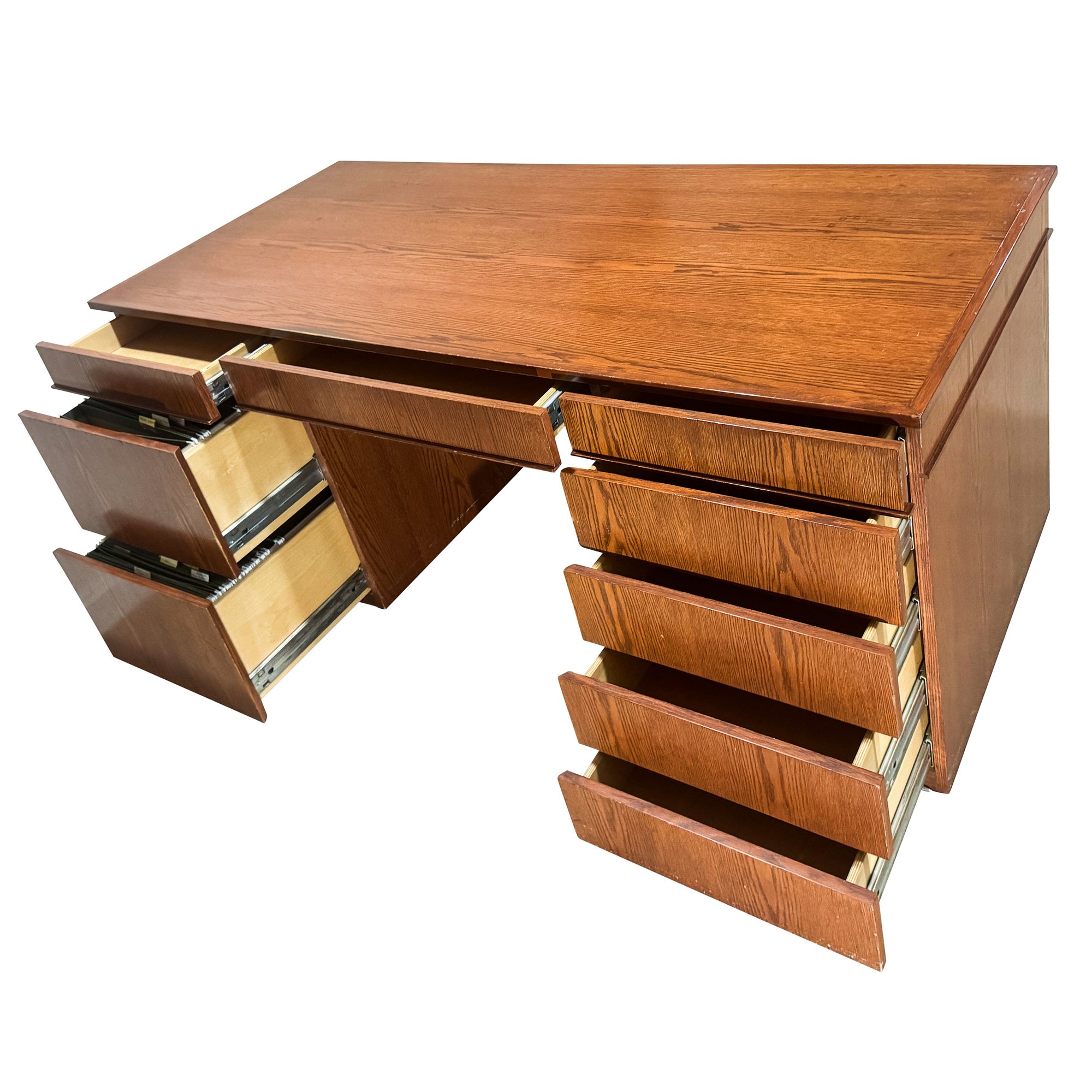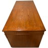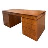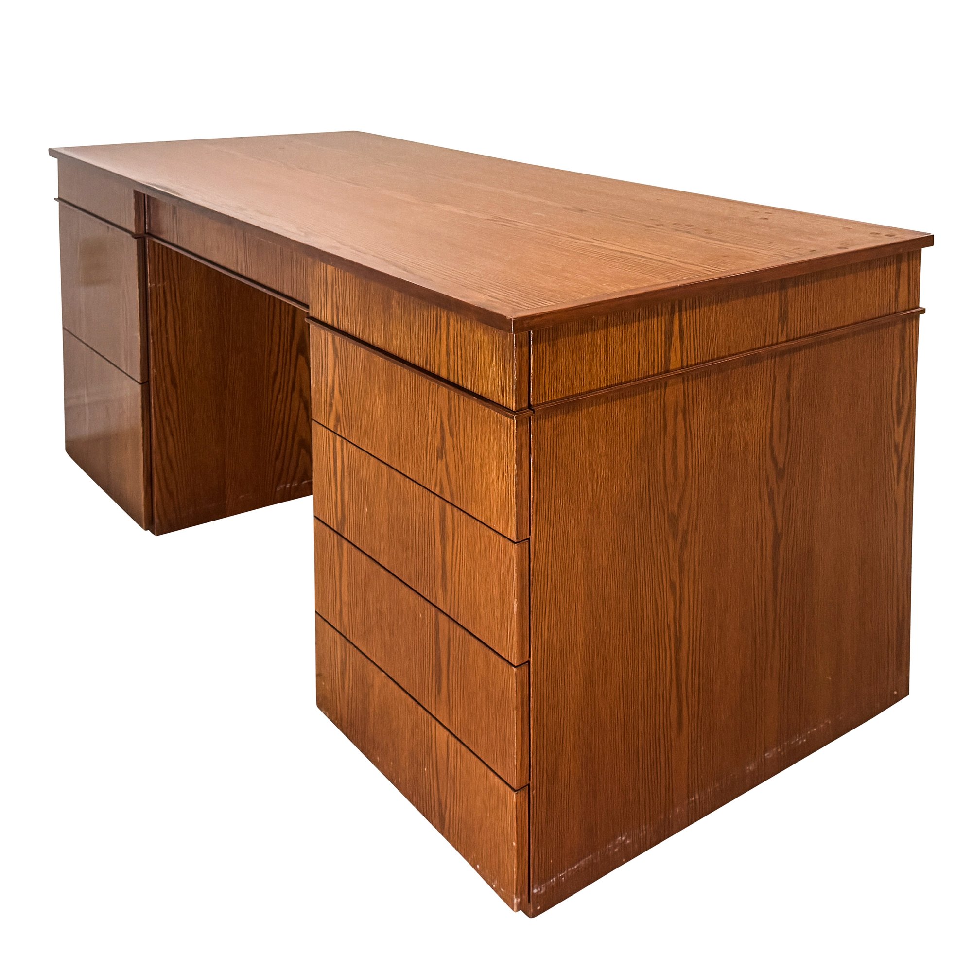 This is a large executive teak veneered desk with sober modernist lines. All nine drawers offer a lot of storage and its solid plywood construction will stand the test of time.