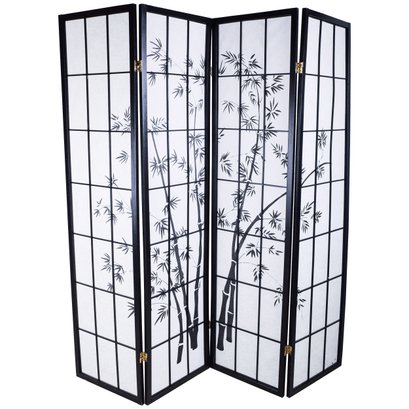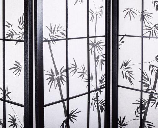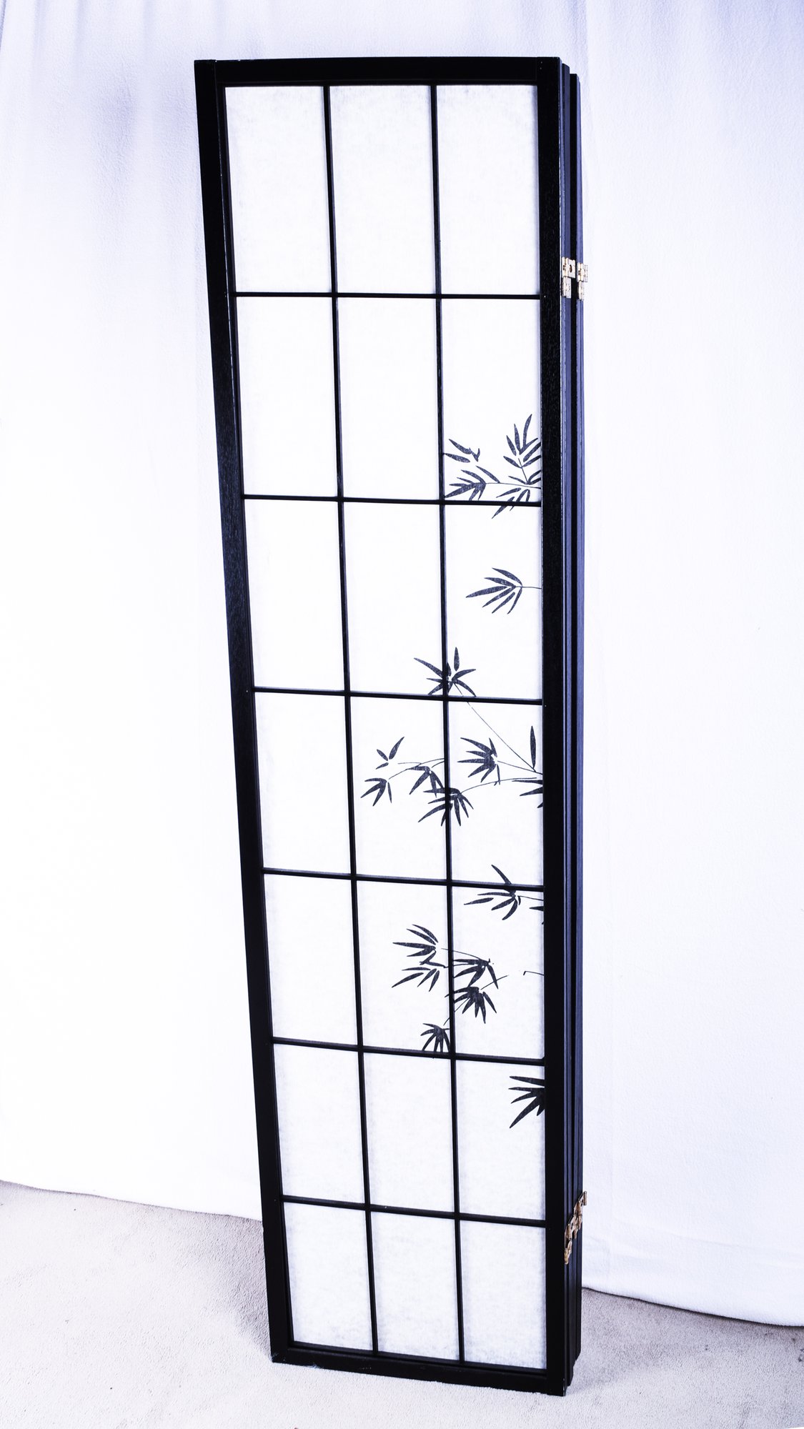 A black frame, four panels shoji screen with an attractive bamboo pattern.