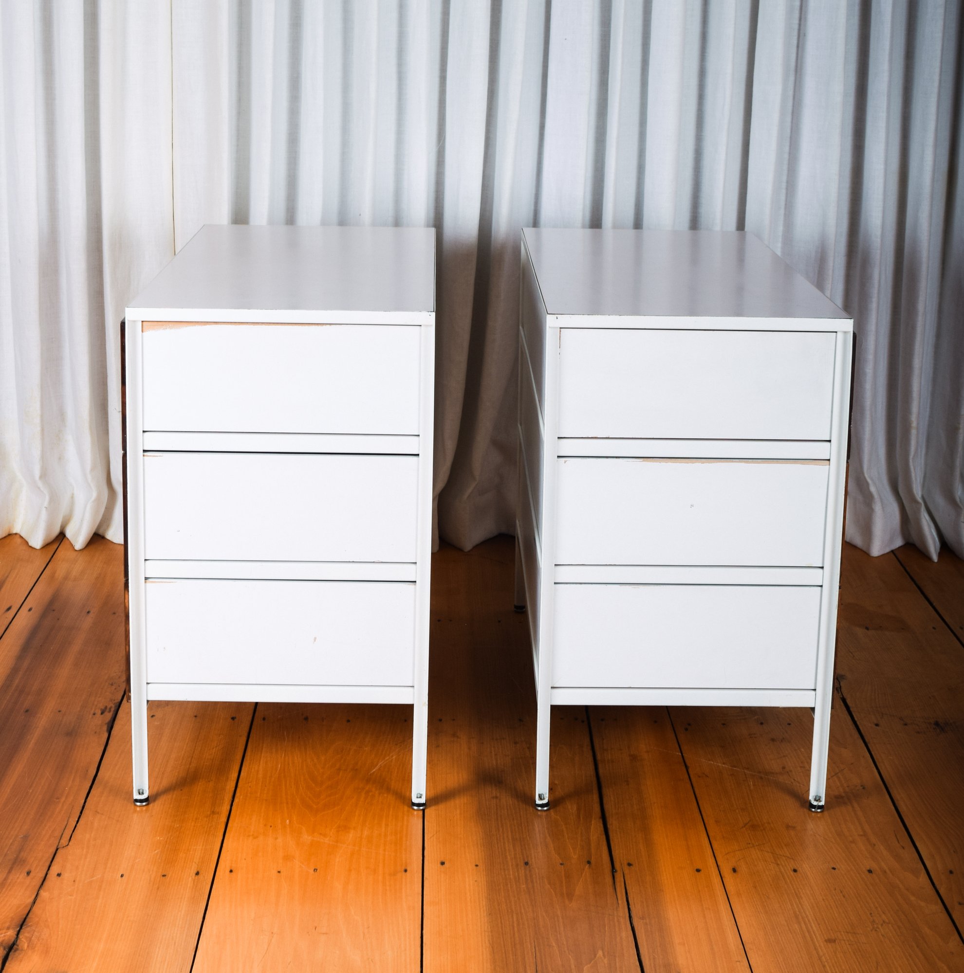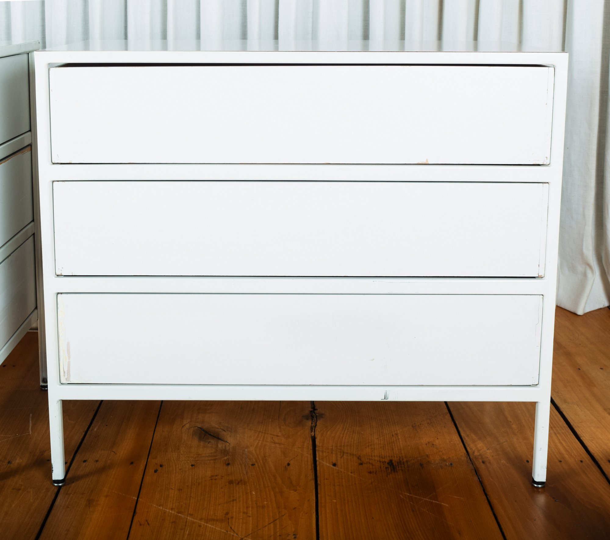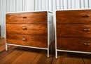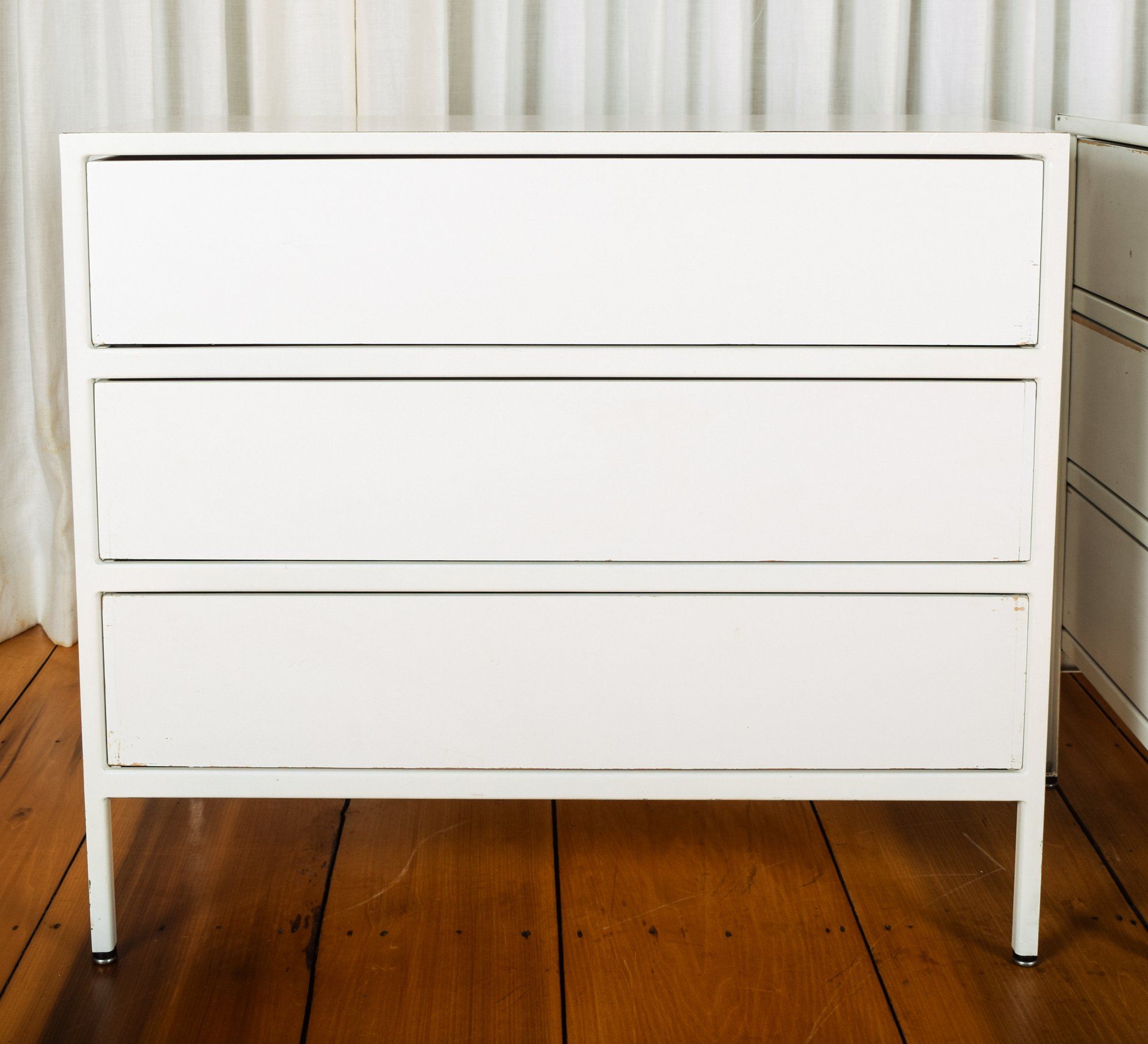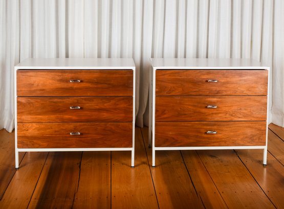 Two enameled steel frame three-drawer cabinets #4012, a 1950 George Nelson design for Herman Miller. Chrome plated oval pulls on walnut front drawers.