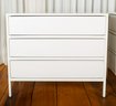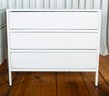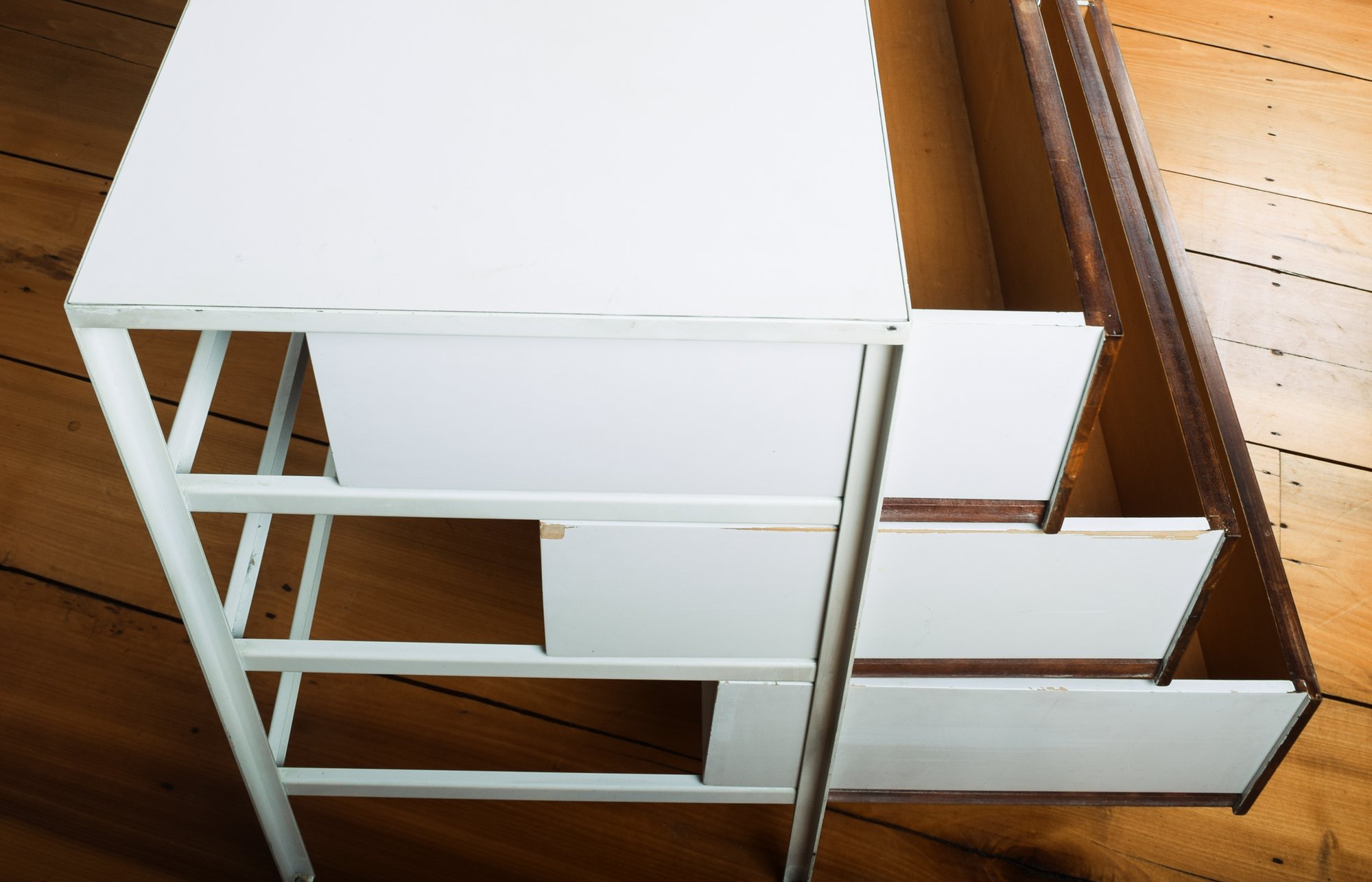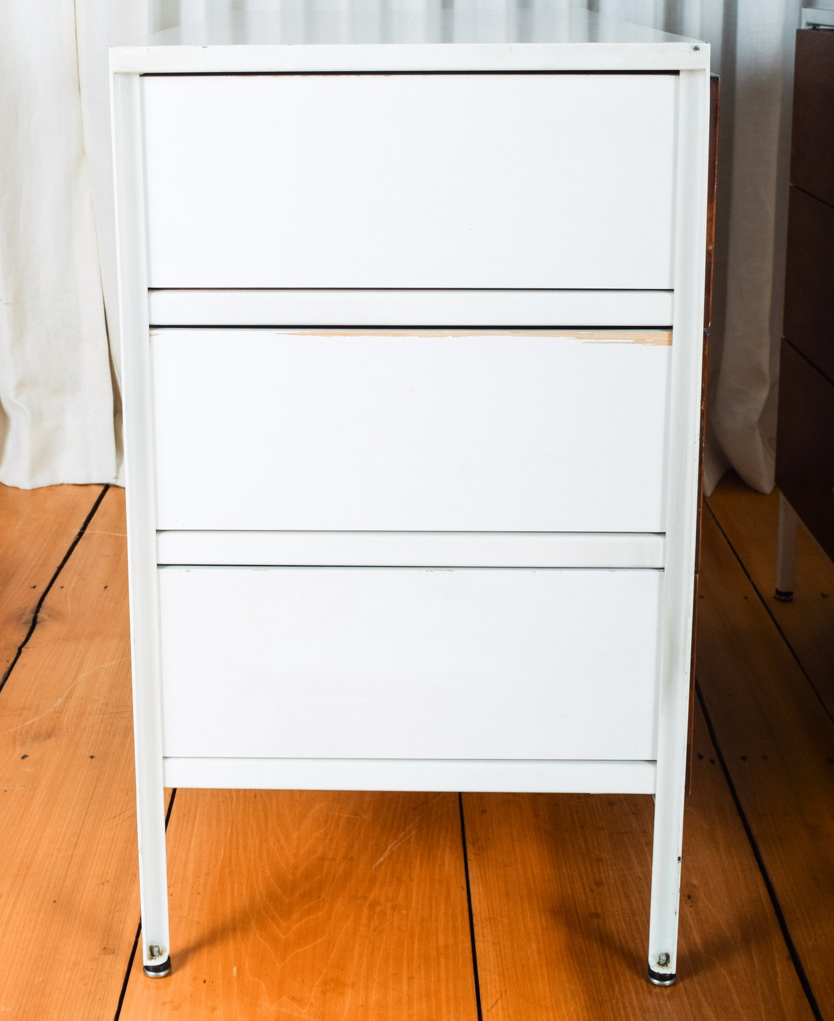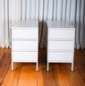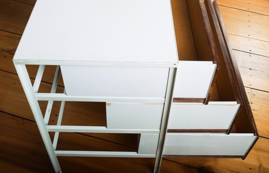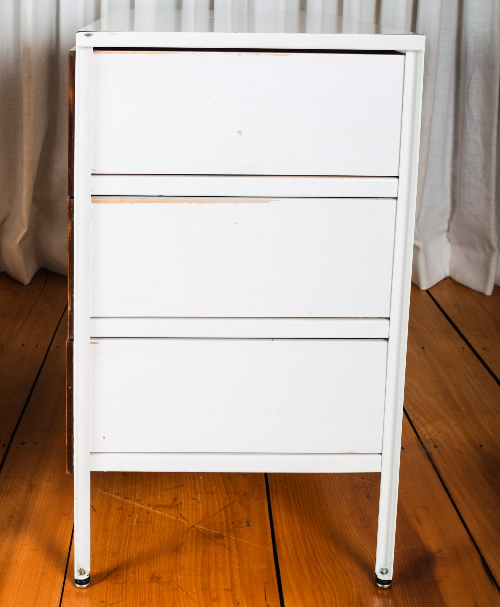 Two enameled steel frame three-drawer cabinets #4012, a 1950 George Nelson design for Herman Miller. Chrome plated oval pulls on walnut front drawers.