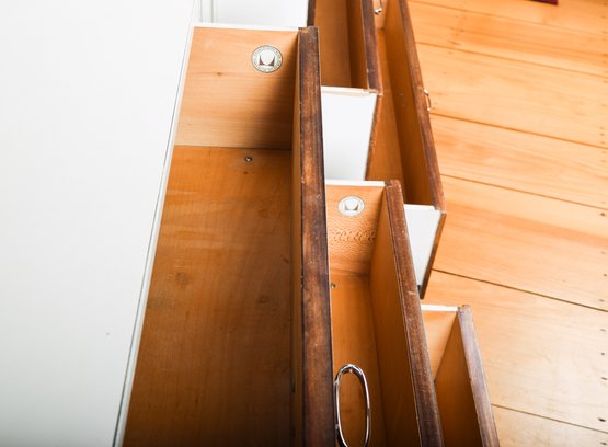 Notes: good condition, normal wear due to age and use. Some wood showing on drawerrs sides