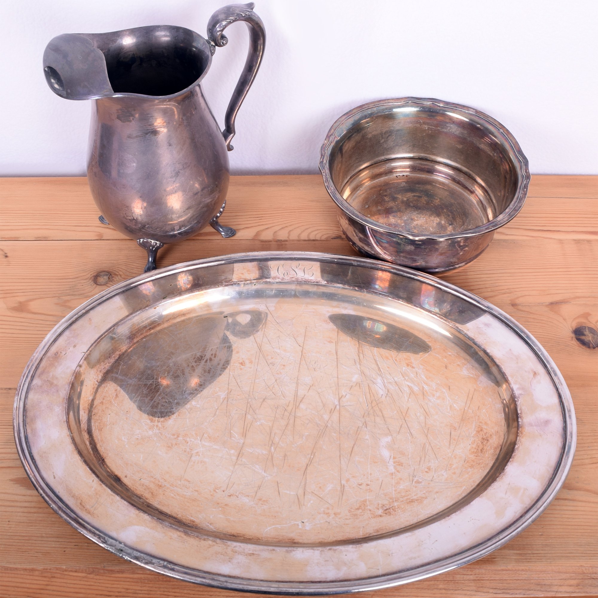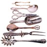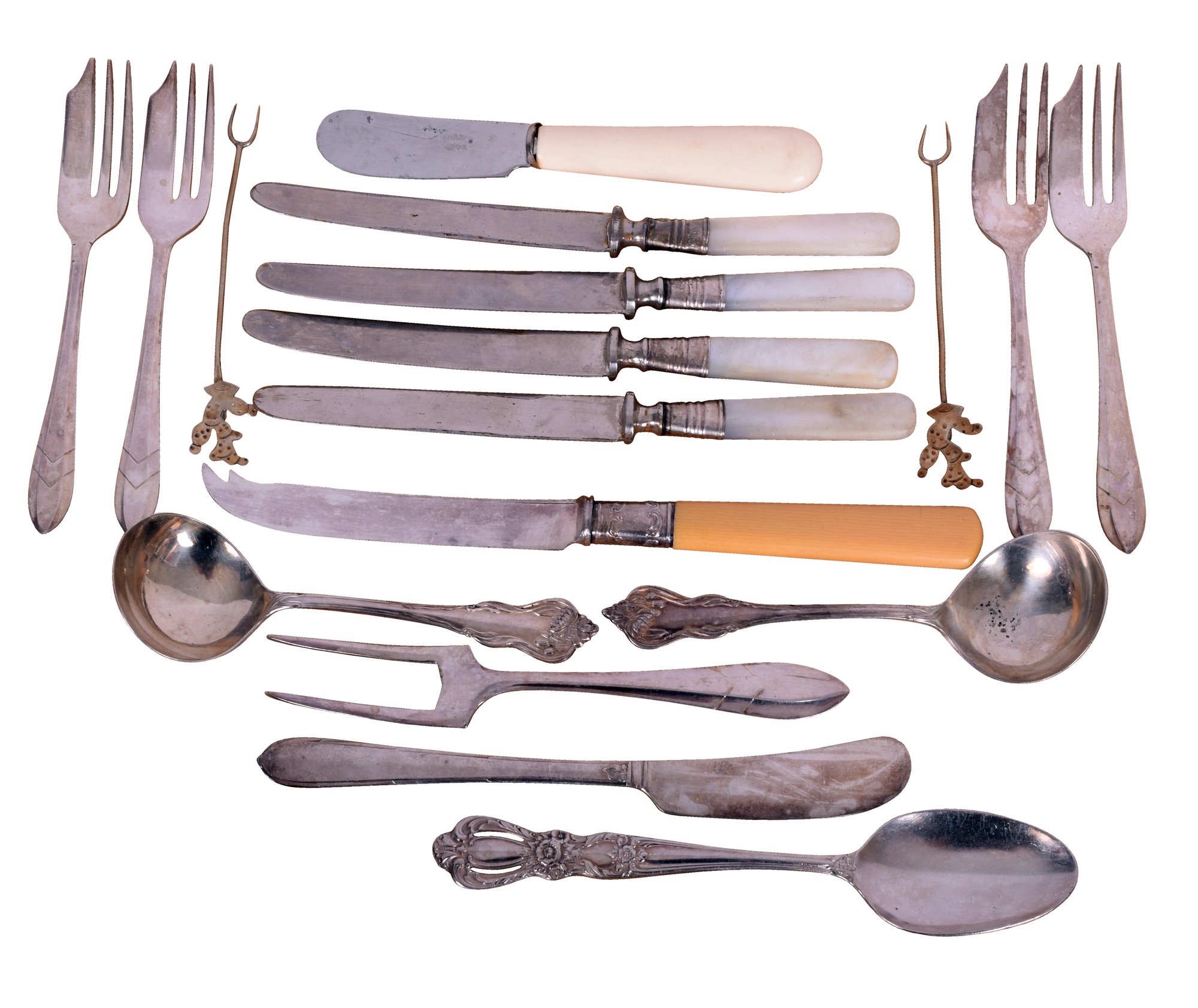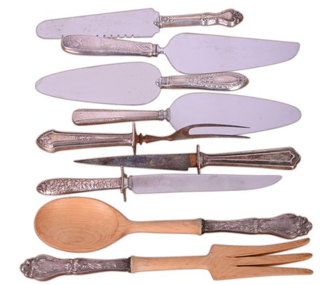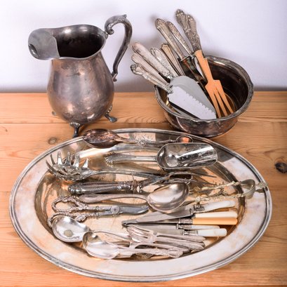 Large lot of assorted silver-plate: Large oval tray, bowl, water pitcher, (6) serving utensils, inc.a pasta server, tongs, scoop, (2) serving spoons, (4) Mother-of-Pearl knives, assorted flatware, and a Bonus: 9 real silve-handled utensils, inc. 4 pie servers, 1 salad set, and a knife and fork carving set.