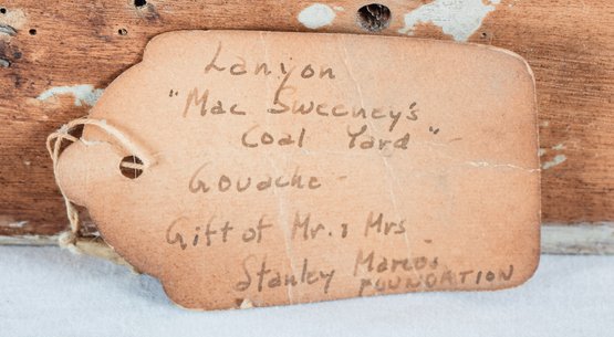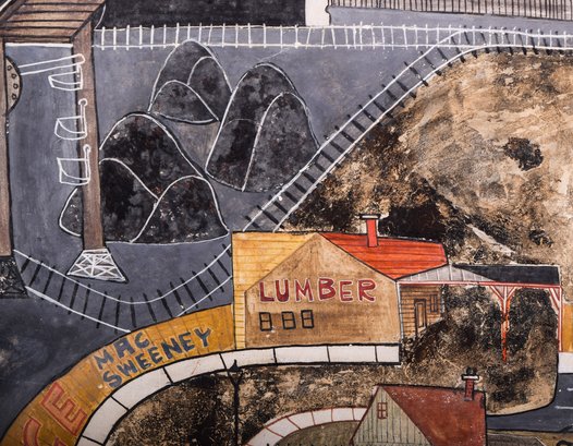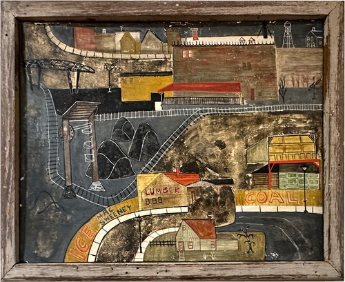 Ellen Lanyon (1926 - 2014) was an American artist associated with the Chicago "Monster Roster," and the Chicago Imagists. This is an early originial "City Scape" of Lanyon's, from the late 1940's/early 50s, depicting an industrial part of a town as seen from above, in tempera paint on a prepared gesso ground. Ellen Lanyon had a long and illustrious career, with over seventy-five solo gallery exhibitions and eleven museum exhibitions, including three major traveling retrospectives. Her work is in the collections of the Art Institute of Chicago; the Museum of Contemporary Art, Chicago; the Brooklyn Museum; the Metropolitan Museum of Art; the National Museum of American Art; among others; and taught at several noteable art institutions.