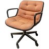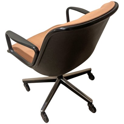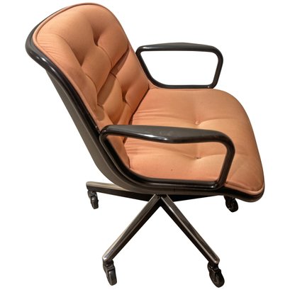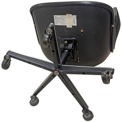 Mid-Century Modern Charles Pollock Executive Desk Chair for Knoll, C. early 1970s. Black colored aluminum with beige upholstered fabric on traditional 5-leg base with casters. The 1250 Series exemplifies Charles Pollock's innovative "Rim technology," with an aluminum band encircling and holding the structure together. Designed in 1948, this iconic chair design is still in production by Knoll.