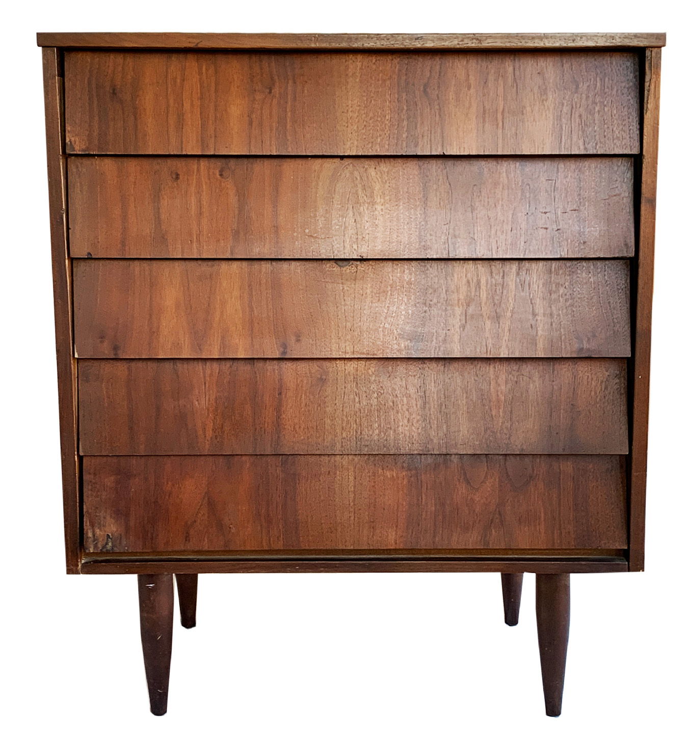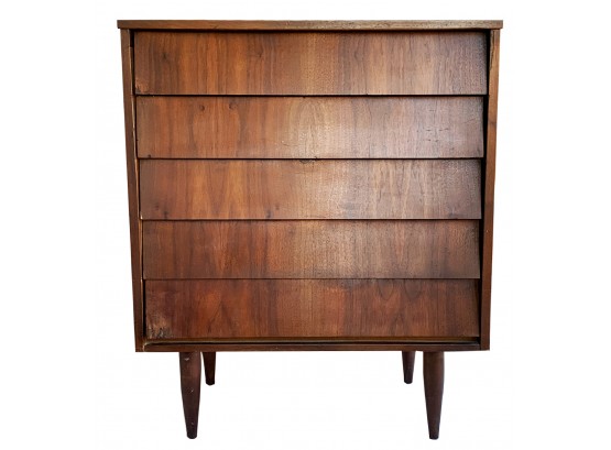 A Mid-Century Brutalist-style dresser, five louvered drawers supported on thin, tapered legs.