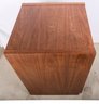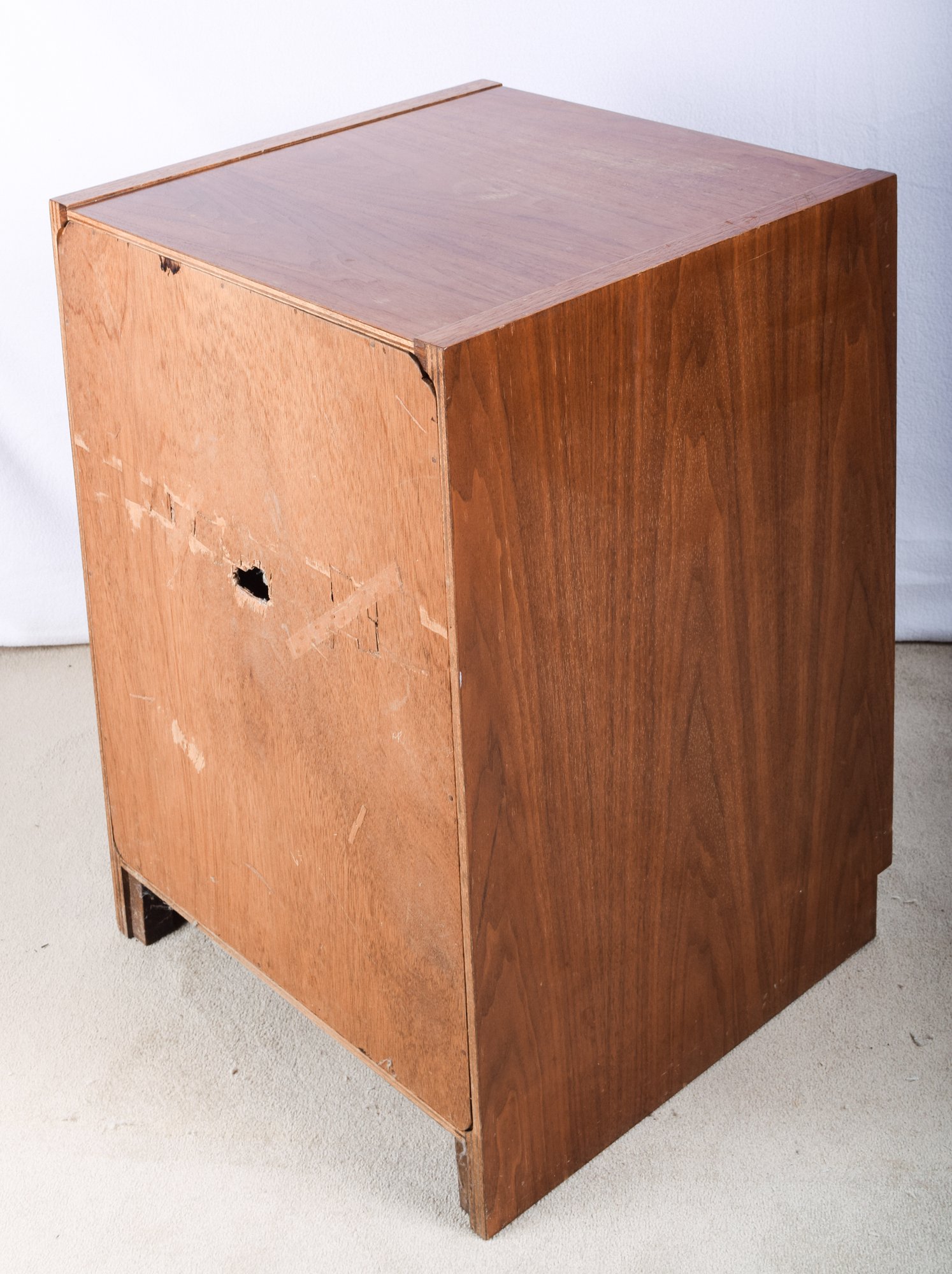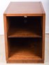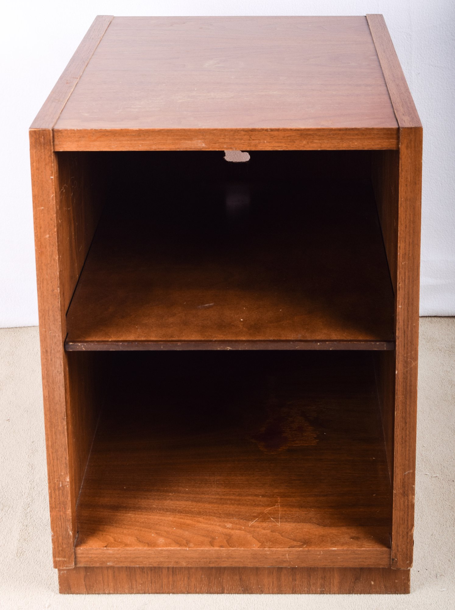 A teak veneer two shelf cabinet that was used to store electronic components, with a hole in back for wires to exit.