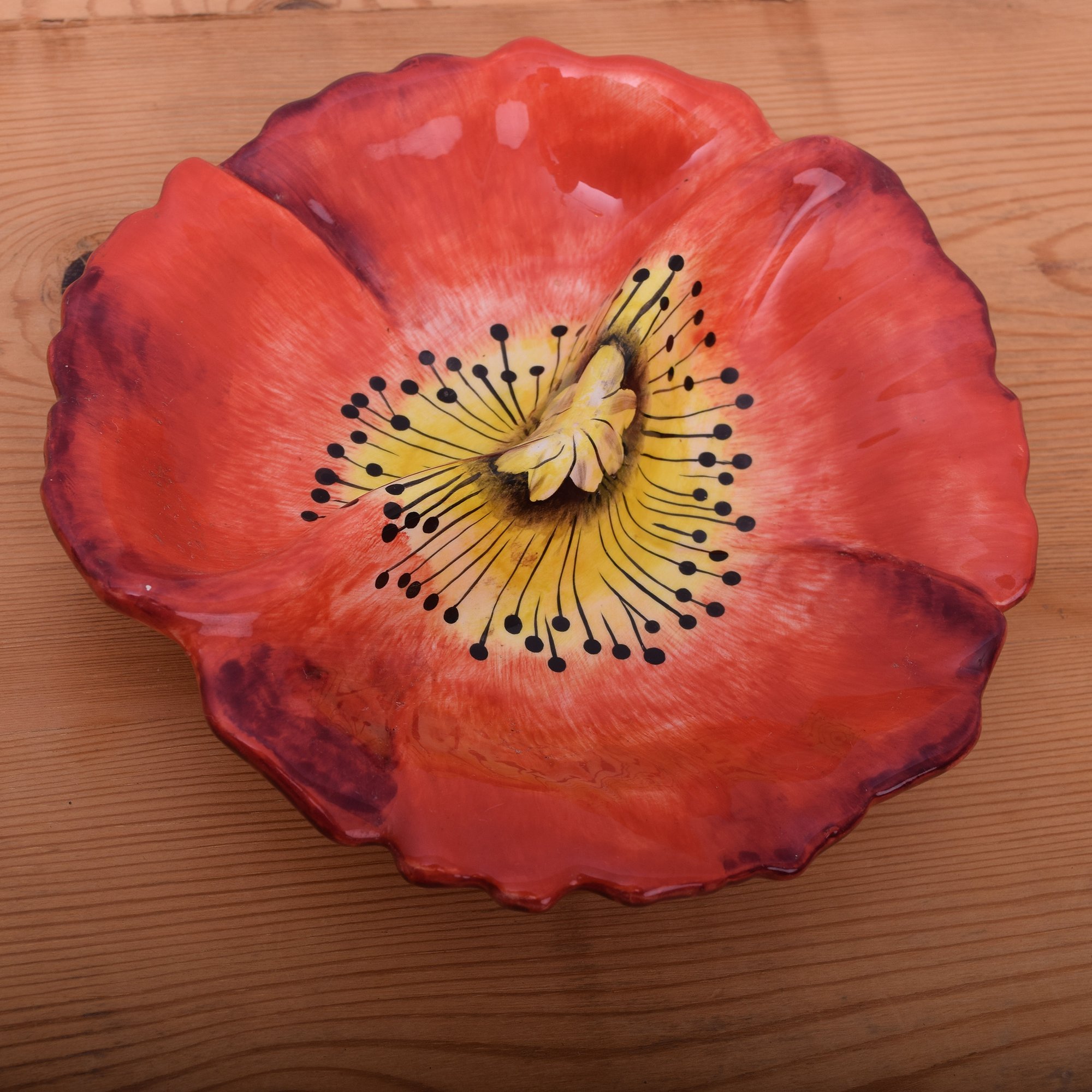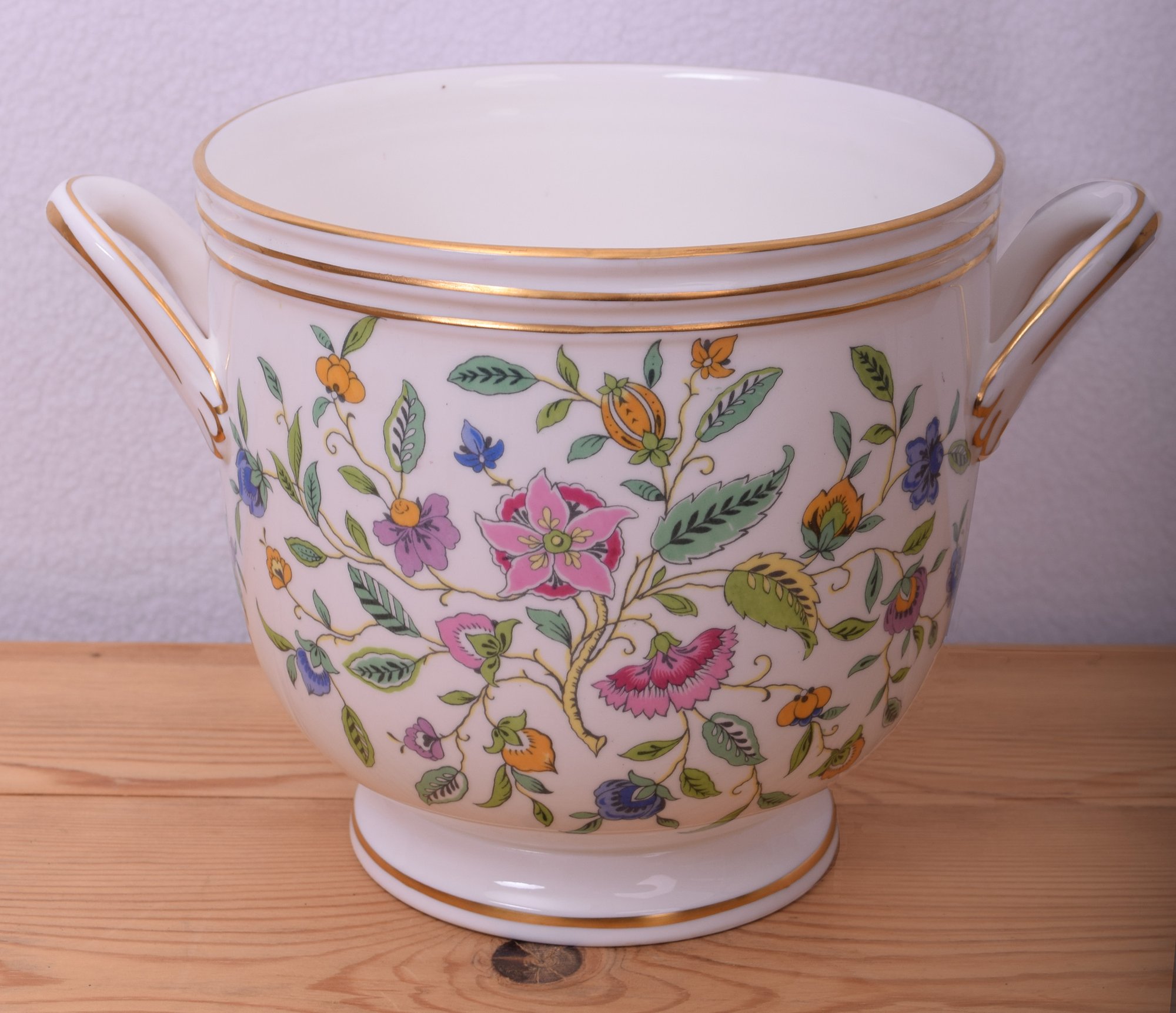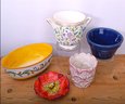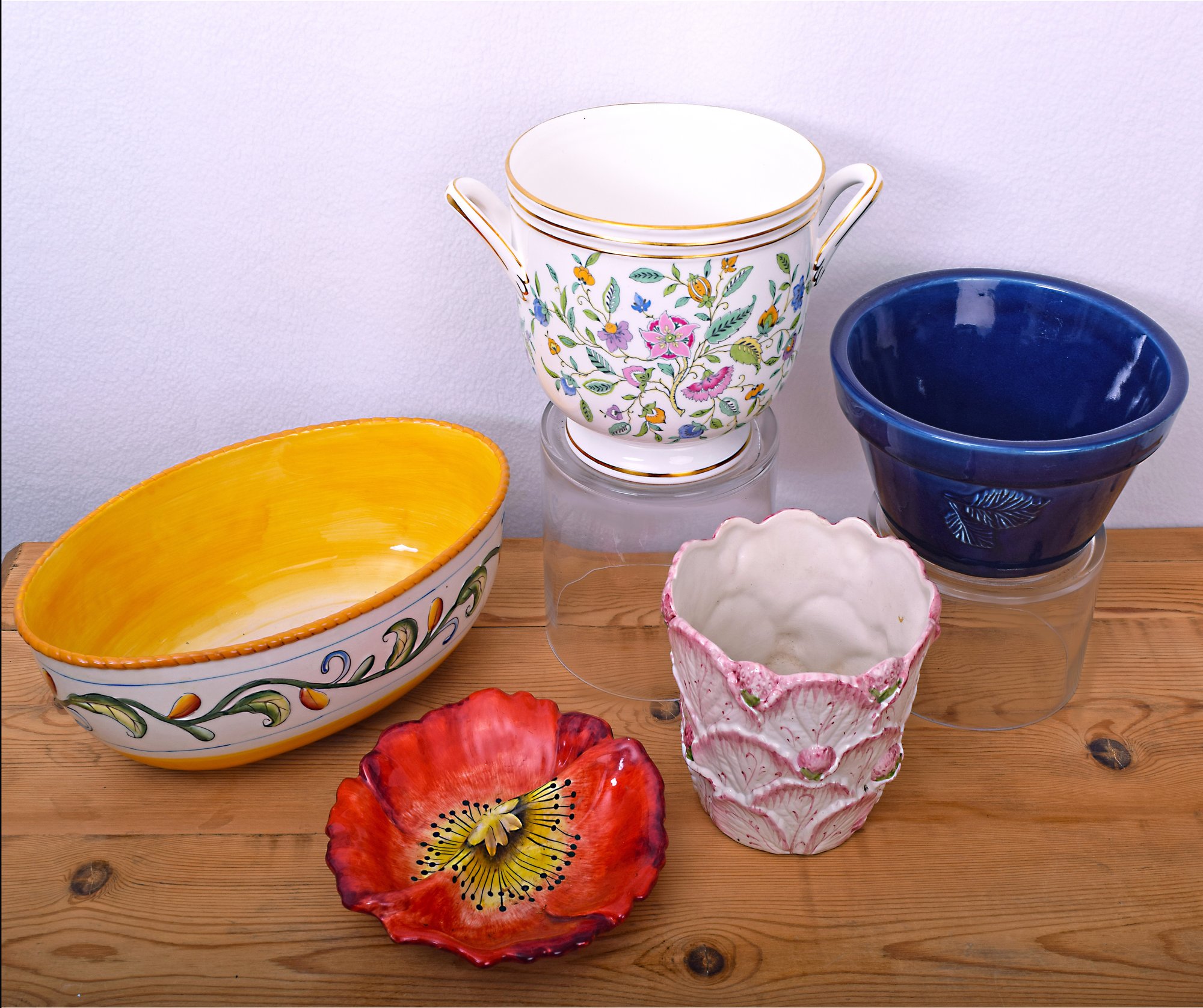 Lovely fine porcelain 2 handled floral planter from Minton, Vintage Poppy bi-segmented bowl from California pottery, Fitz & Floyd floral decorated oblong serving bowl and a navy blue planter from Ransbottom, and a white scallop edge planter with pick accents will surely bring a splash of color to any table.