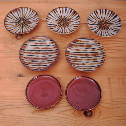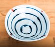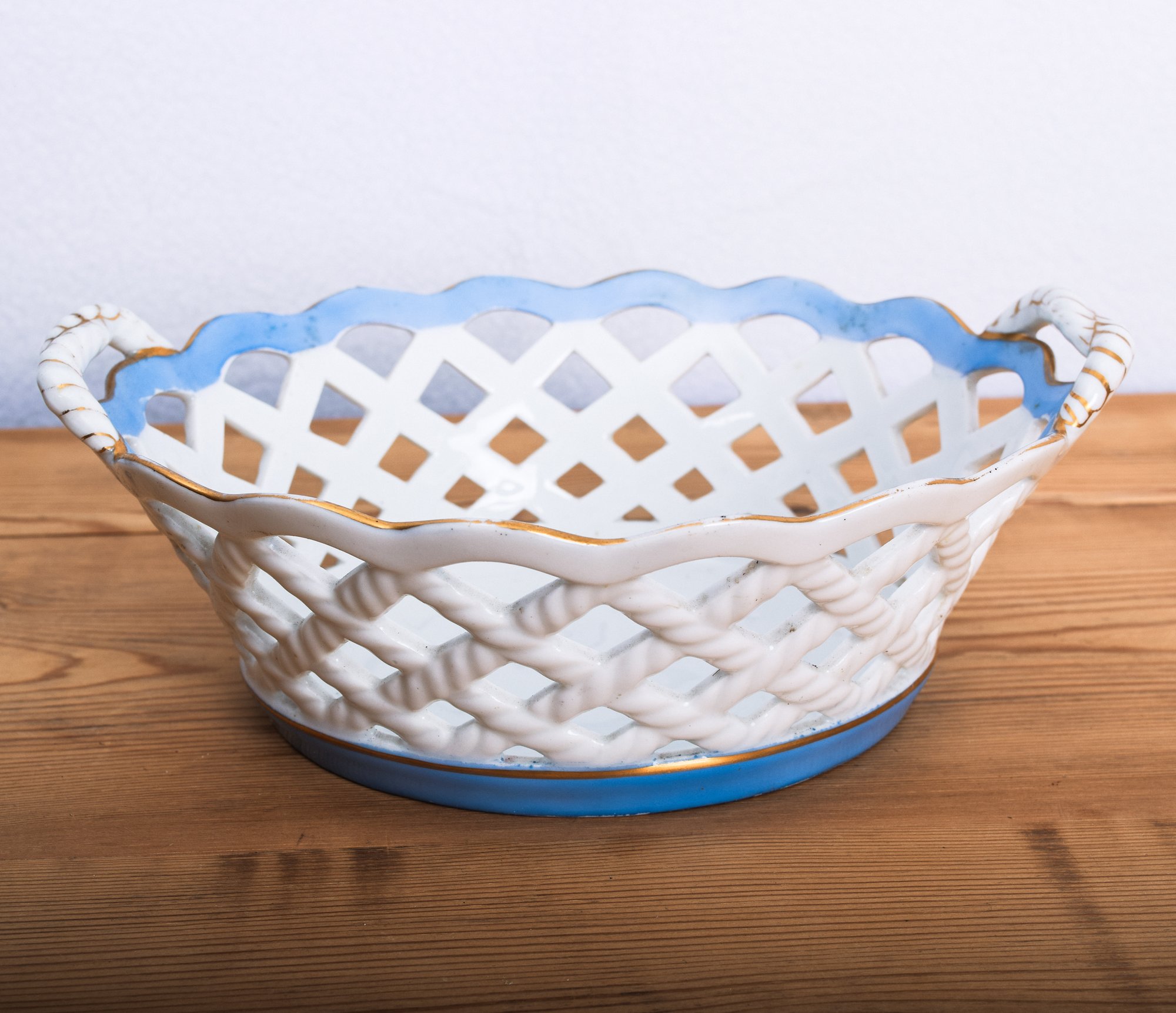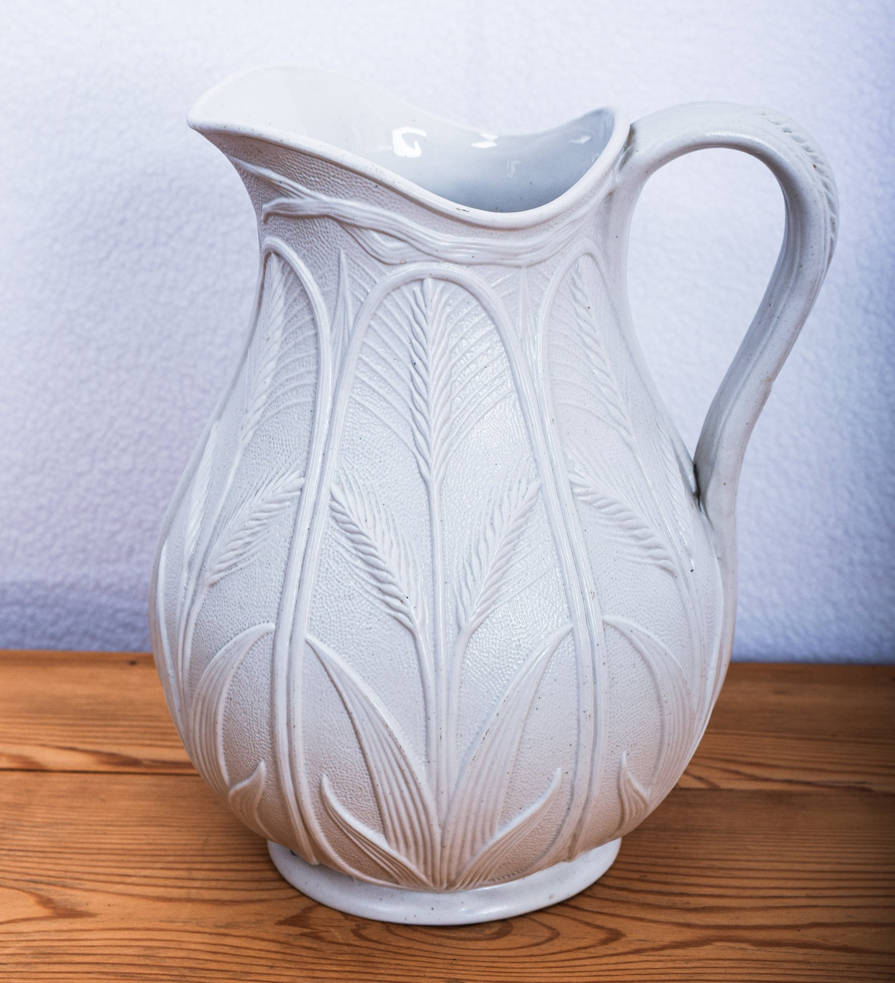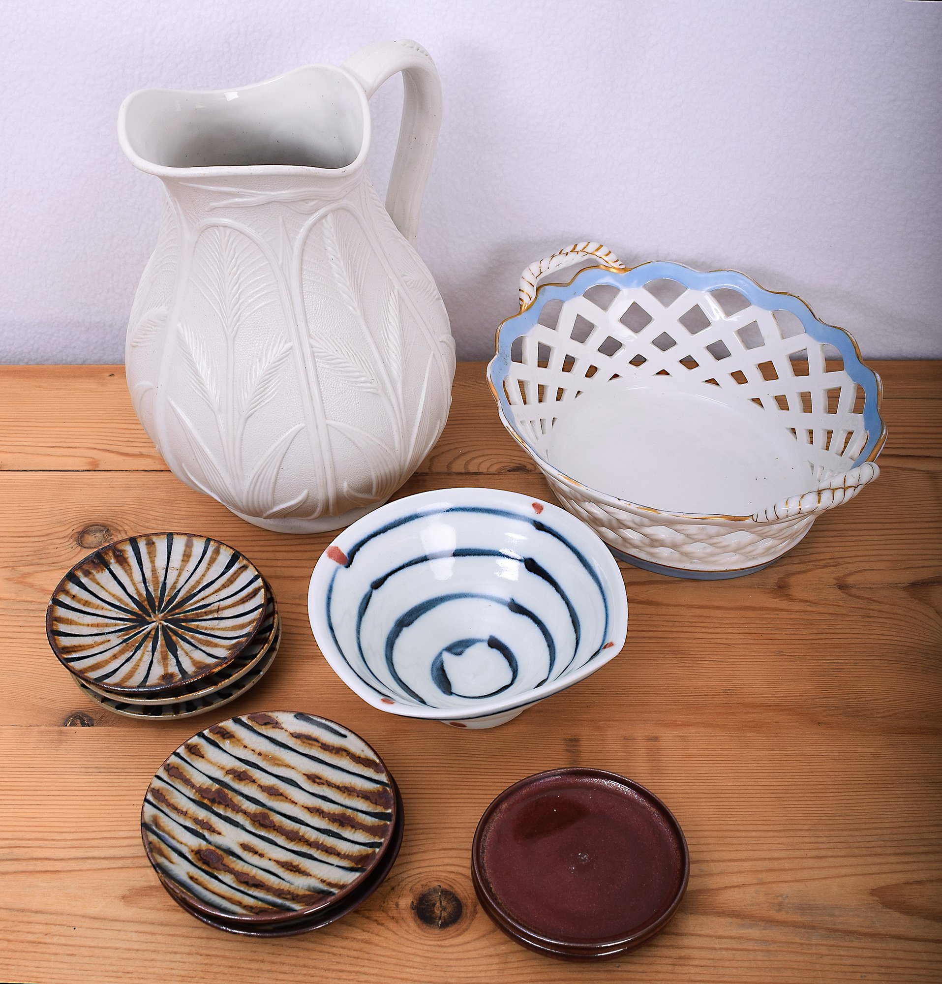 This grouping includes a white salt glazed pitcher with a wheat pattern, an antique oval white lattice bone china basket with a blue trim, a small art pottery bowl marked "Jaeger" and seven attractive Japanese small saucers. An interesting collection of ceramics.
