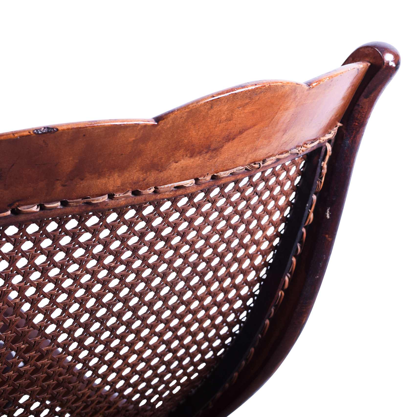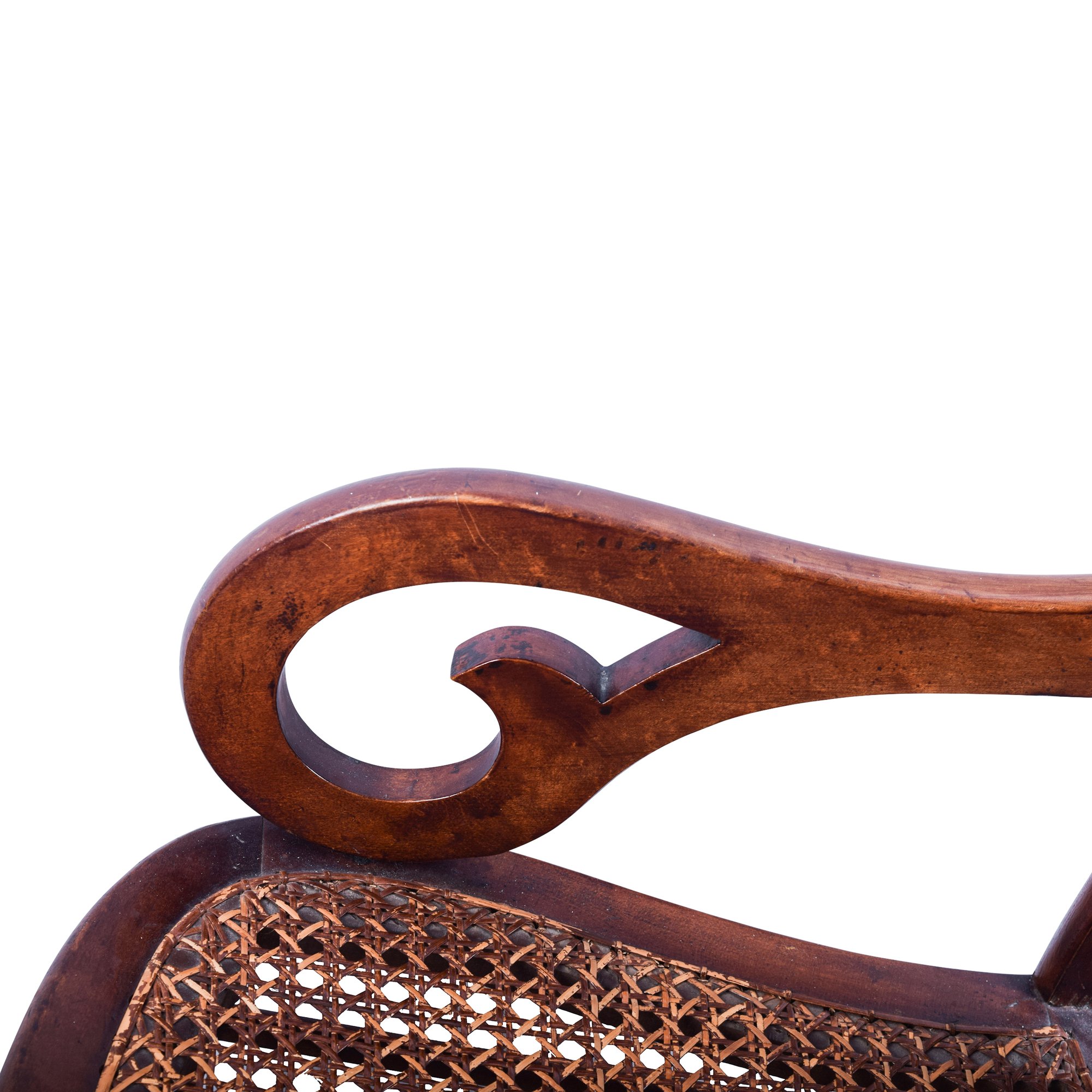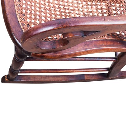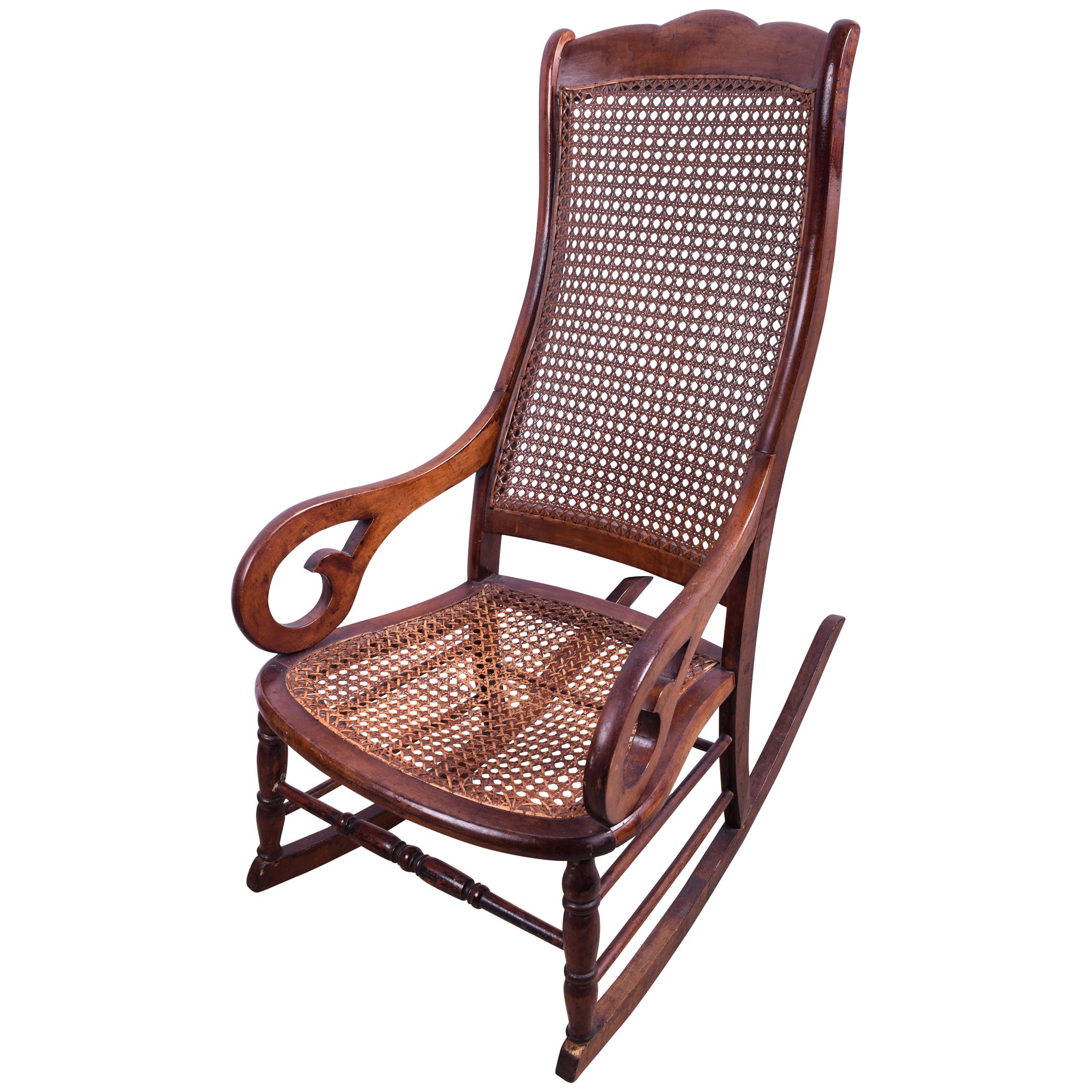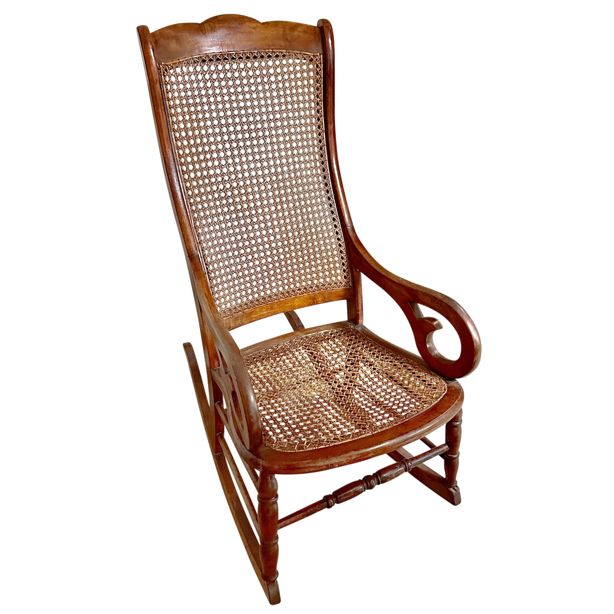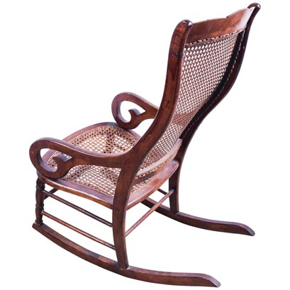 Lovely antique ladies' Rocker with caned seat and back, all caning intact and strong. Comes with custom back and seat cushions. Perfect for that sunny spot or front porch.