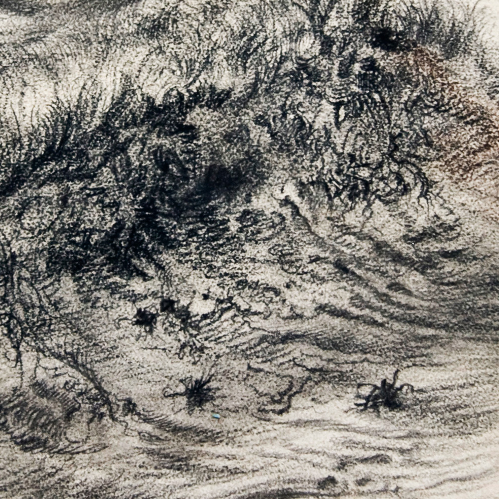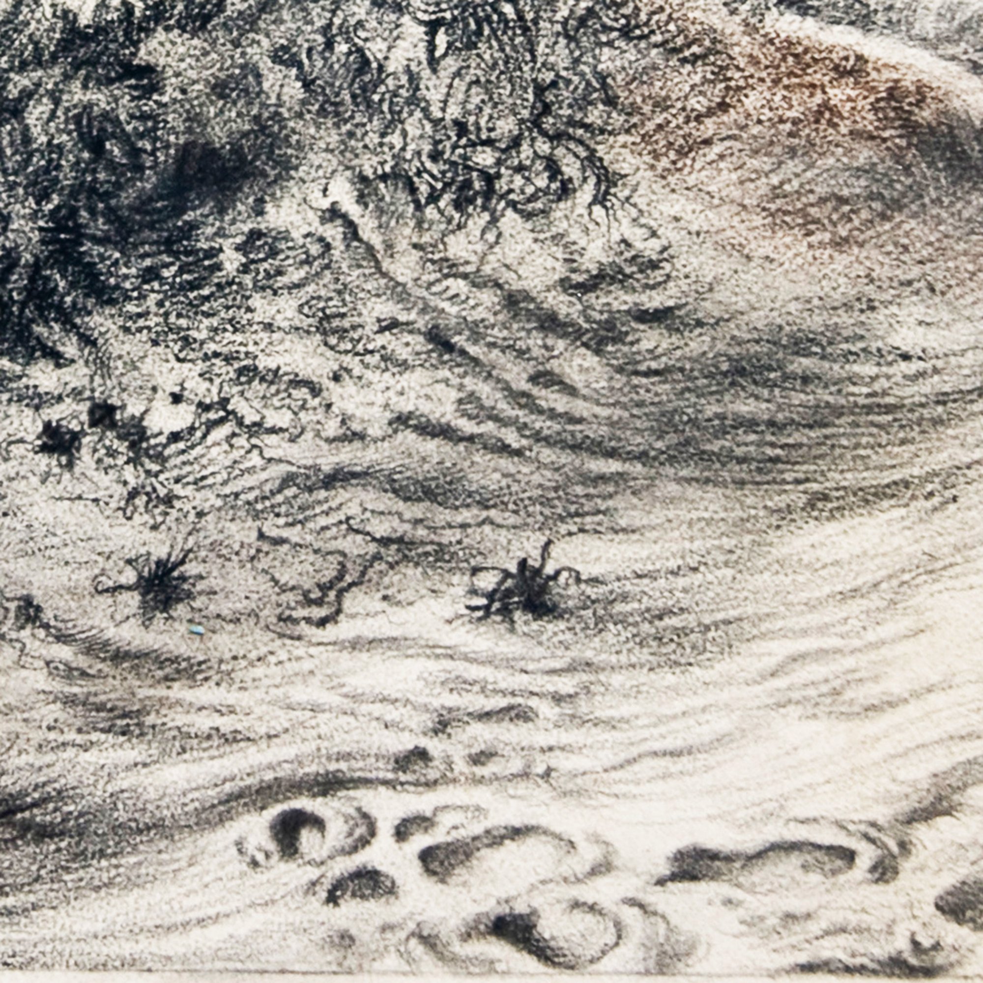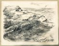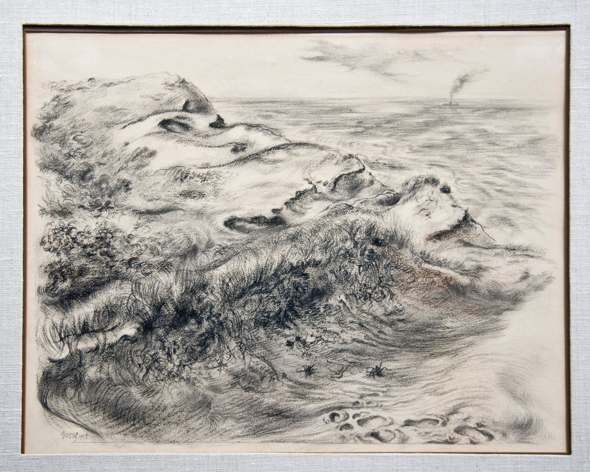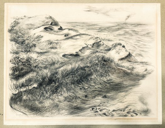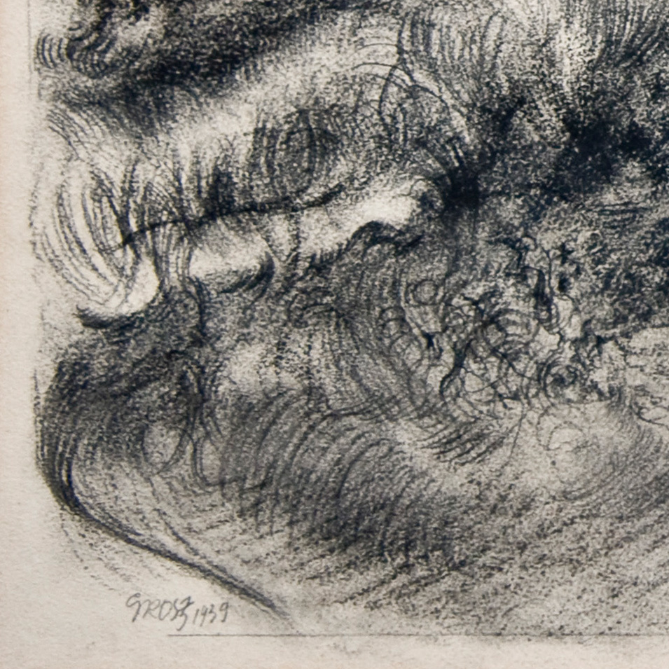 This framed original crayon / wax pencil drawing by German-American Georg Grosz (18903-1969) exhibits this important artist's mastery of drawing. In black with hints of gray and brown undertones, the subject is a Cape Cod beach sand dune with wind-swept grasses. The surfaces are defined by a variety of mark-making, built-up textures and finely-honed strokes. George Grosz is known for his paintings and prints featuring bitter characterizations of Berlin of the 1920s. After immigrating to the U.S., Grosz spent his final years in Berlin. Grosz left an immense legacy, and remains highly-influential to contemporary artists. His work is in the collections of major art museums world-wide. This is an opportunity to own a museum-quality, original drawing by an important, recognized master of 20th Century modern art!