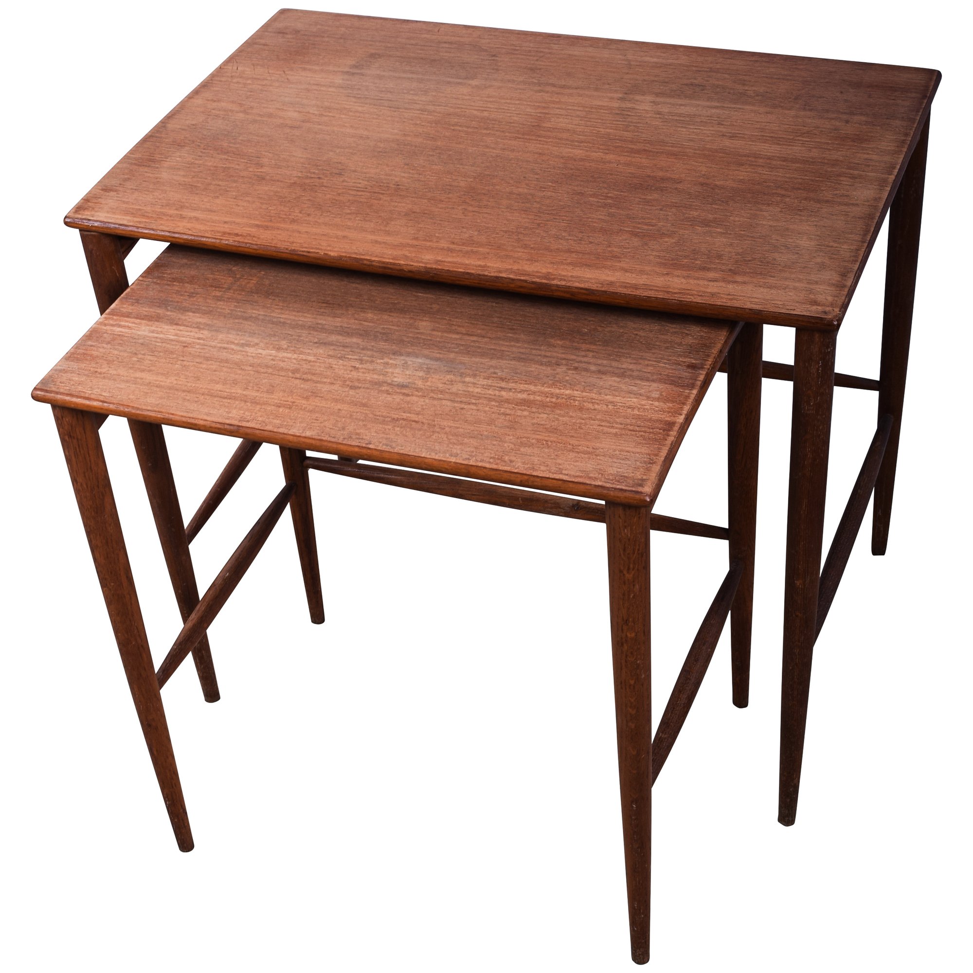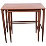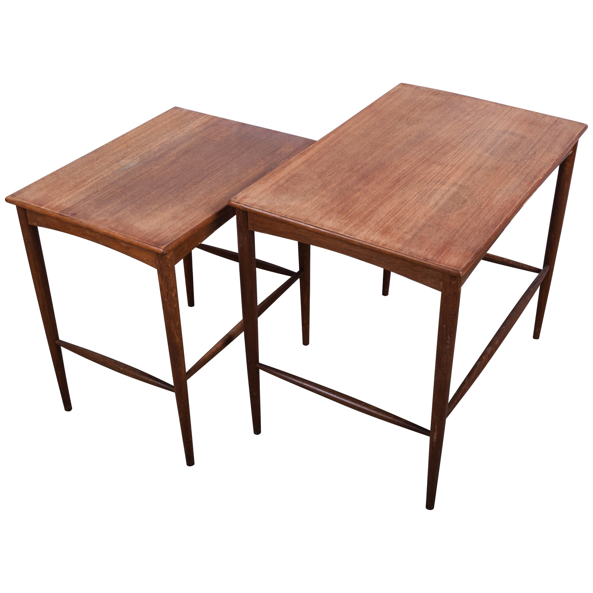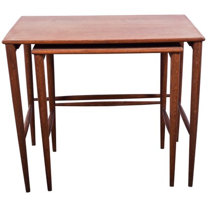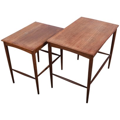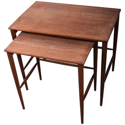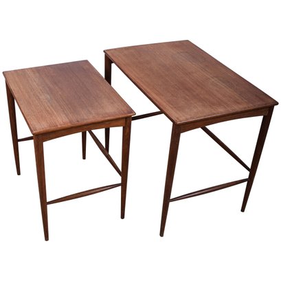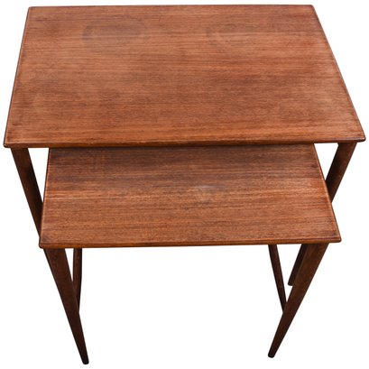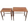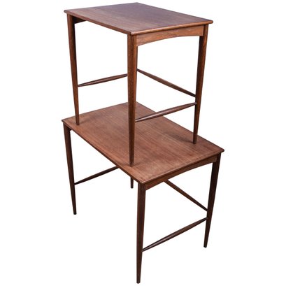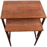 Set of 2 Folke Ohlsson Mid-Century Modern Teak Nesting Tables for Dux, C. 1960s, with characteristic clean, spare lines by one of the masters of Swedish Modern furniture design. Beautifully crafted on impossibly thin legs, lightweight and versatile. Smaller table measures 18 x 13 x18.5 fits under the larger, 23.5 x 15.5 x 19.5.