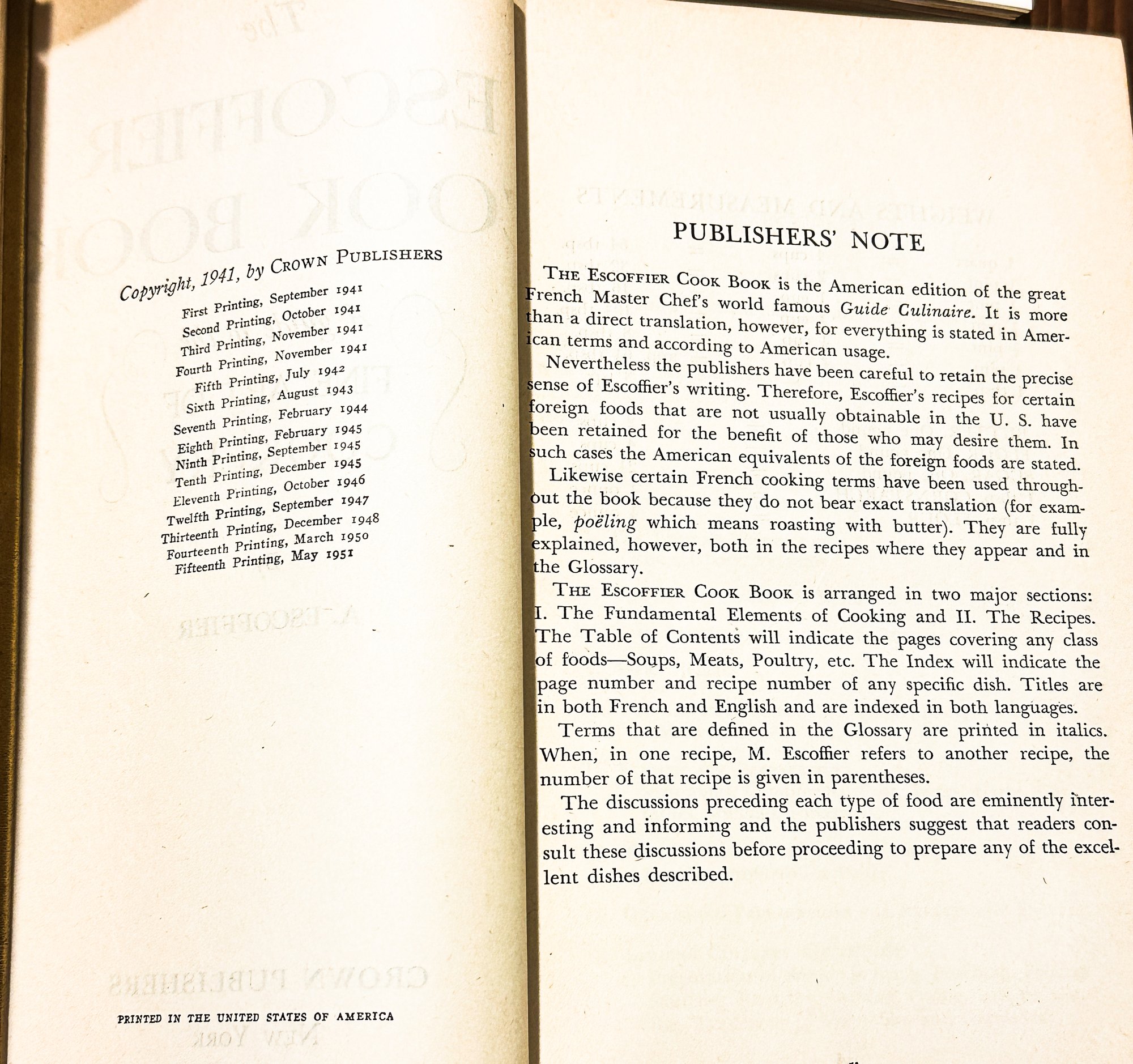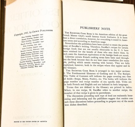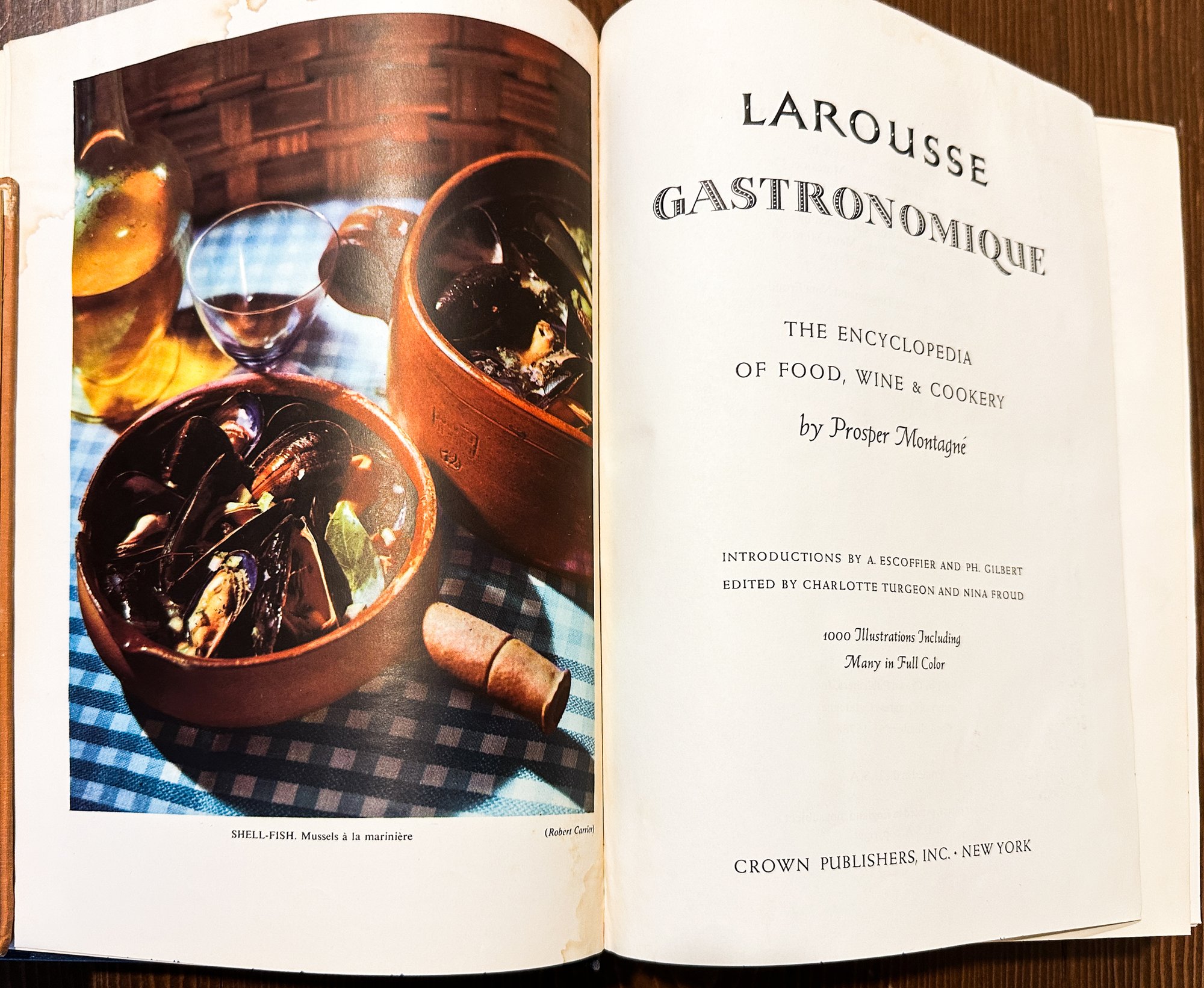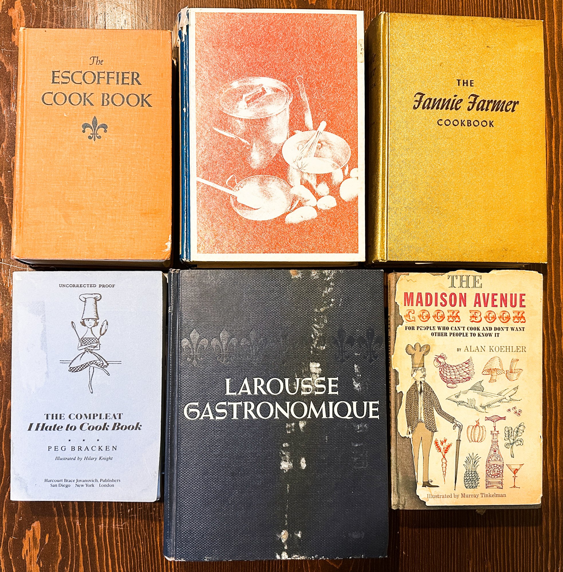 Six interesting vintage cookbooks:, The Escoffier cookbook, from Julia Child's kitchen, The Madison avenue cookbook, the compleat I hate to cook cookbook, The Fannie Farmer cookbook and the Larousse gastronomique!