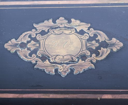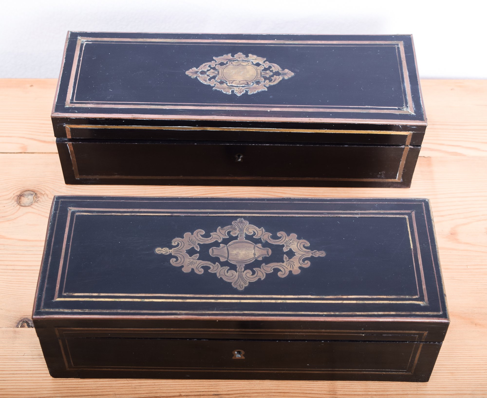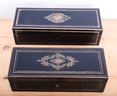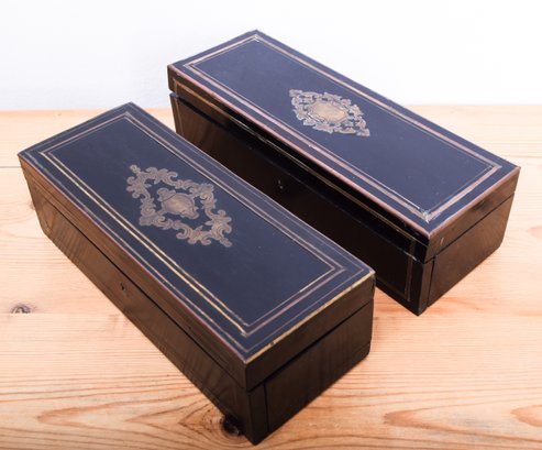 Two ebony antique glove boxes adorned with inlaid brass embellishment, and rosewood interiors. A fancy brass medallion is inlaid on the tops and the front hinges down for easy access. Dating from the 19th century, probably by a French manufacture.