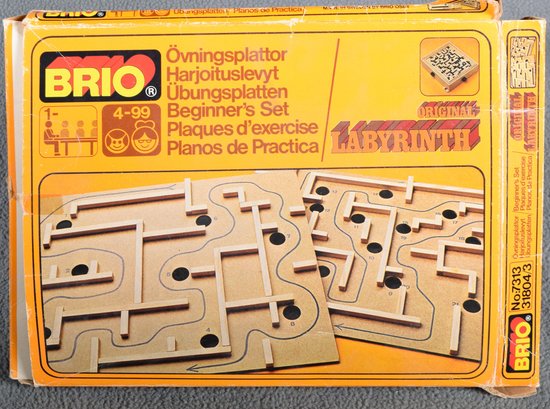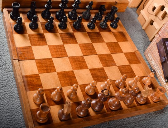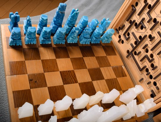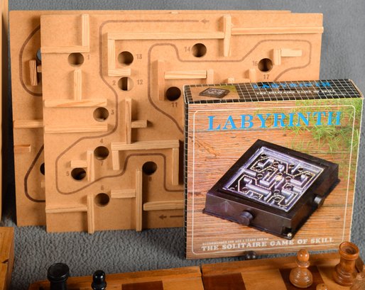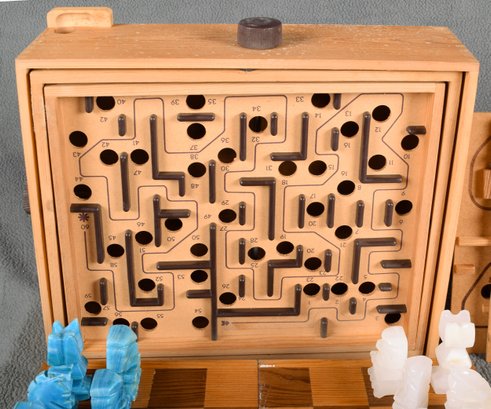 A vintage Aztec-style chess set (13.50" x 13.75") with hand-carved onyx pieces w/ inlaid board/storage case, a vintage chess set with hand-carved and turned wood pieces and board/storage case, a BRIO Labyrinth Game, a classic wooden balancing maze puzzle, a beginner and a solitaire version of the game.