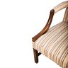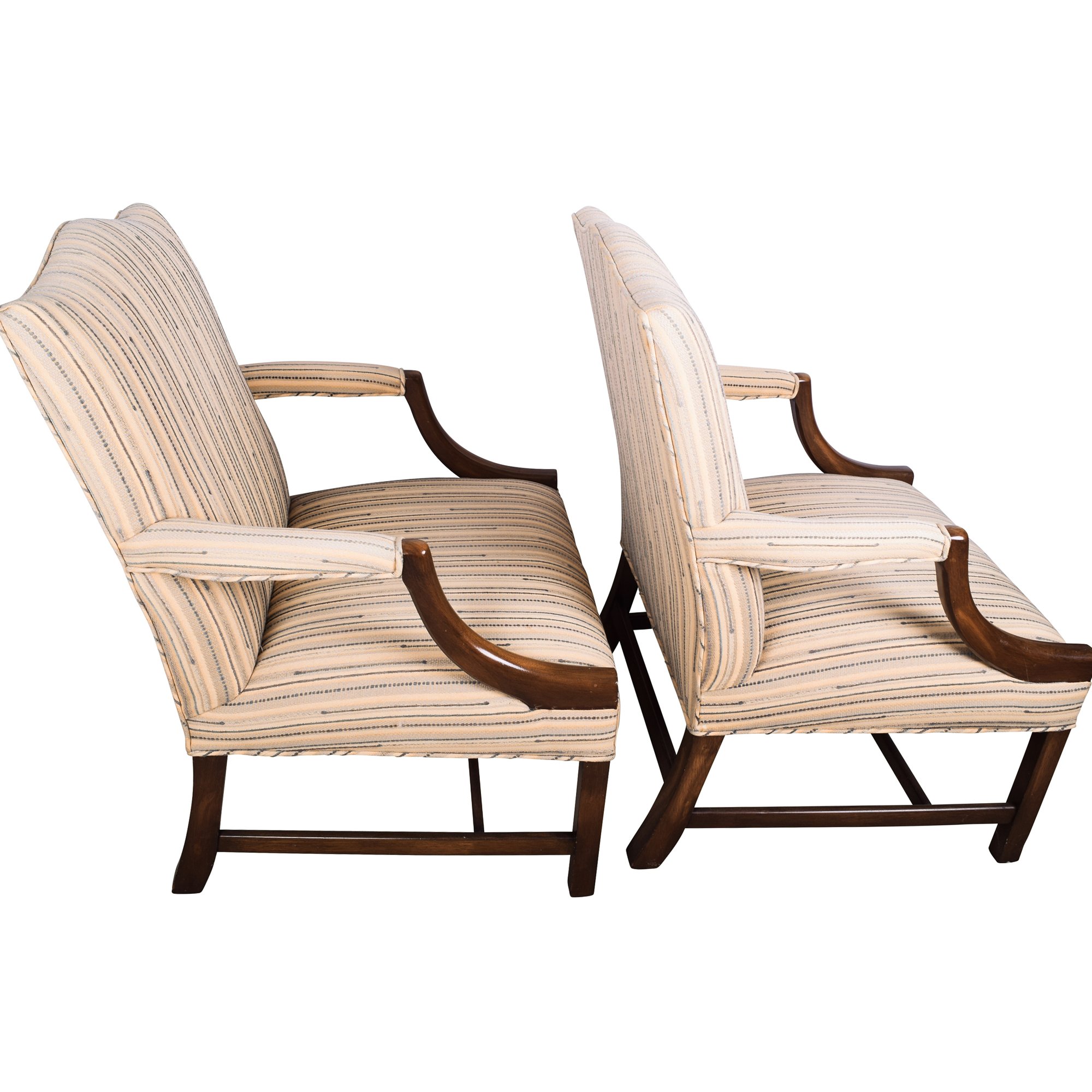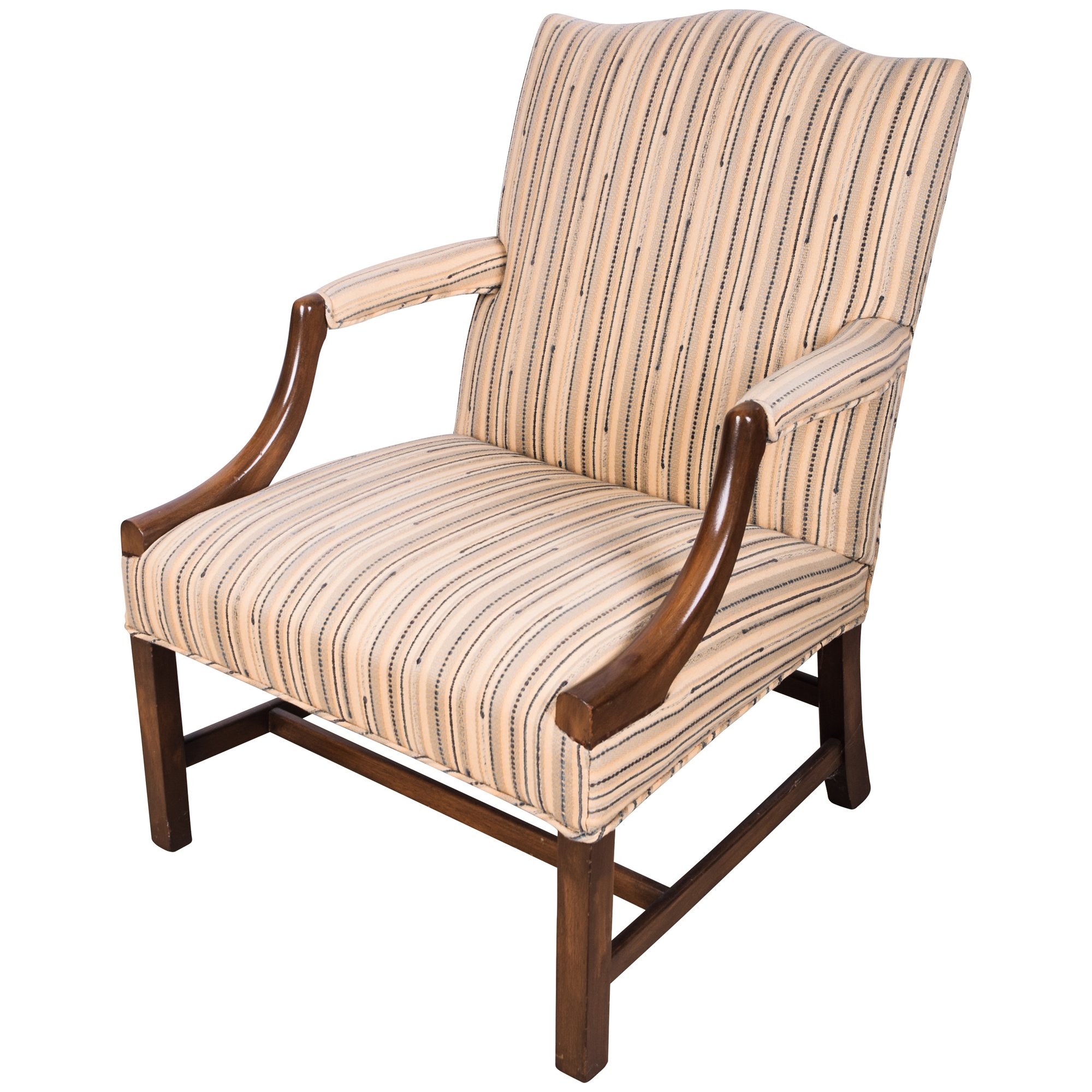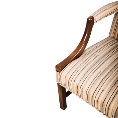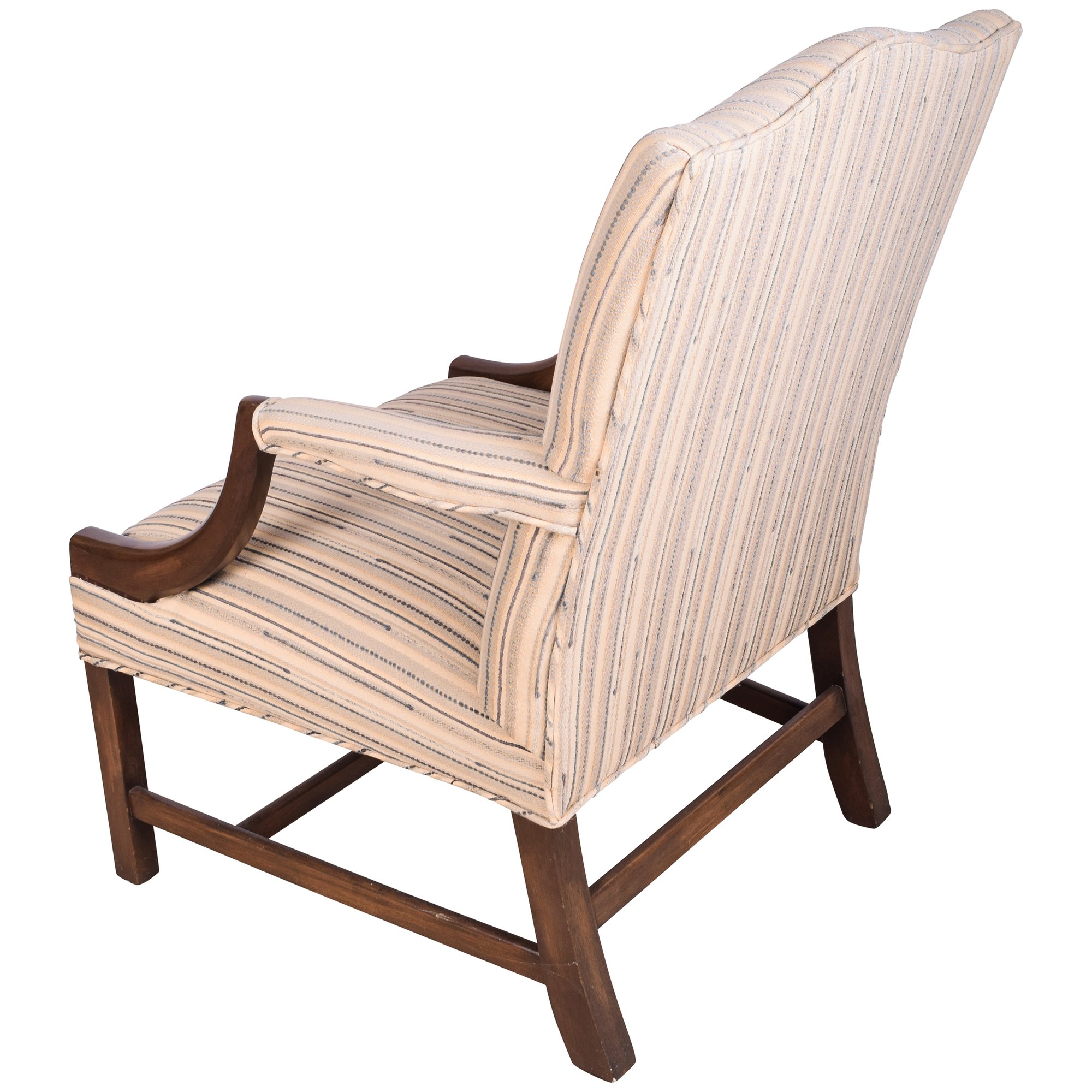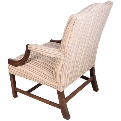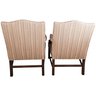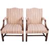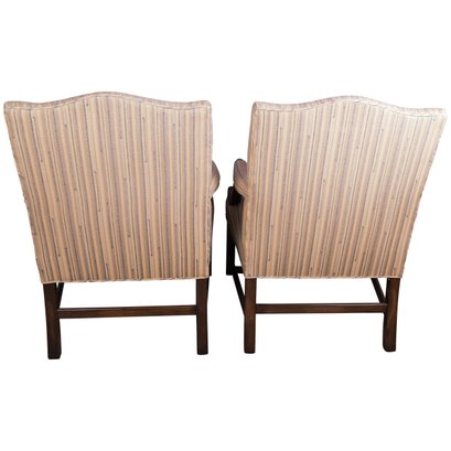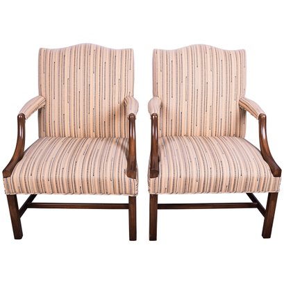 Classic luxury armchairs with camel-back, padded mahogany arms and squared legs, reupholstered in quality fabric with off-white/beige with tan and dark brown linear pattern with matching piping. These chairs' quality manufacturing and style points to the Kittinger manufacturing company. Very clean, with excellent spring support and condition, this stately pair brings an old-world style and sophistication to traditional interiors.