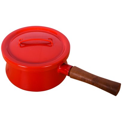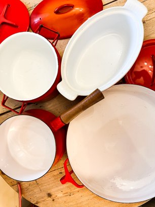 Vintage Dansk Kobenstyle Flame Cookware in red/orange, includes the Paella pan x 3", Medium casserole 8" x 4", Saucepan 8" x 4" with wood handle.Comes with Bonus flame-colored enameled caste-iron oval Dutch Oven by Descoware of Belgium, 10" x 6.5" x 4." Vintage Dansk cookware is proof that they don't make them like this any more! Manufactured with enameled glass on steel, these casseroles feature the distinctive Dansk design as invented by Jens H. Quistgaard. Their easy-cleanup, oven to table good looks and efficient heat-conducting surfaces make these vintage pieces preferable to new versions by modern cooks, (who don't mind a few nicks and wear.) These pieces are in very good condition with clean interiors and very minimal surface wear.