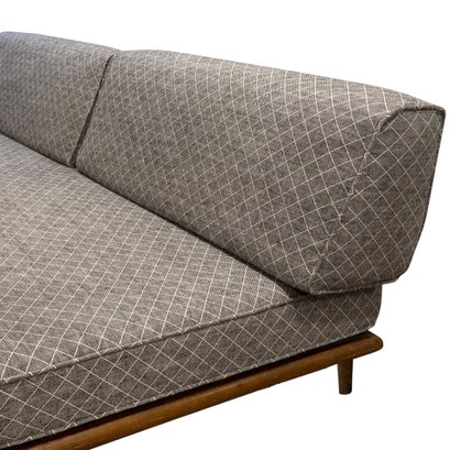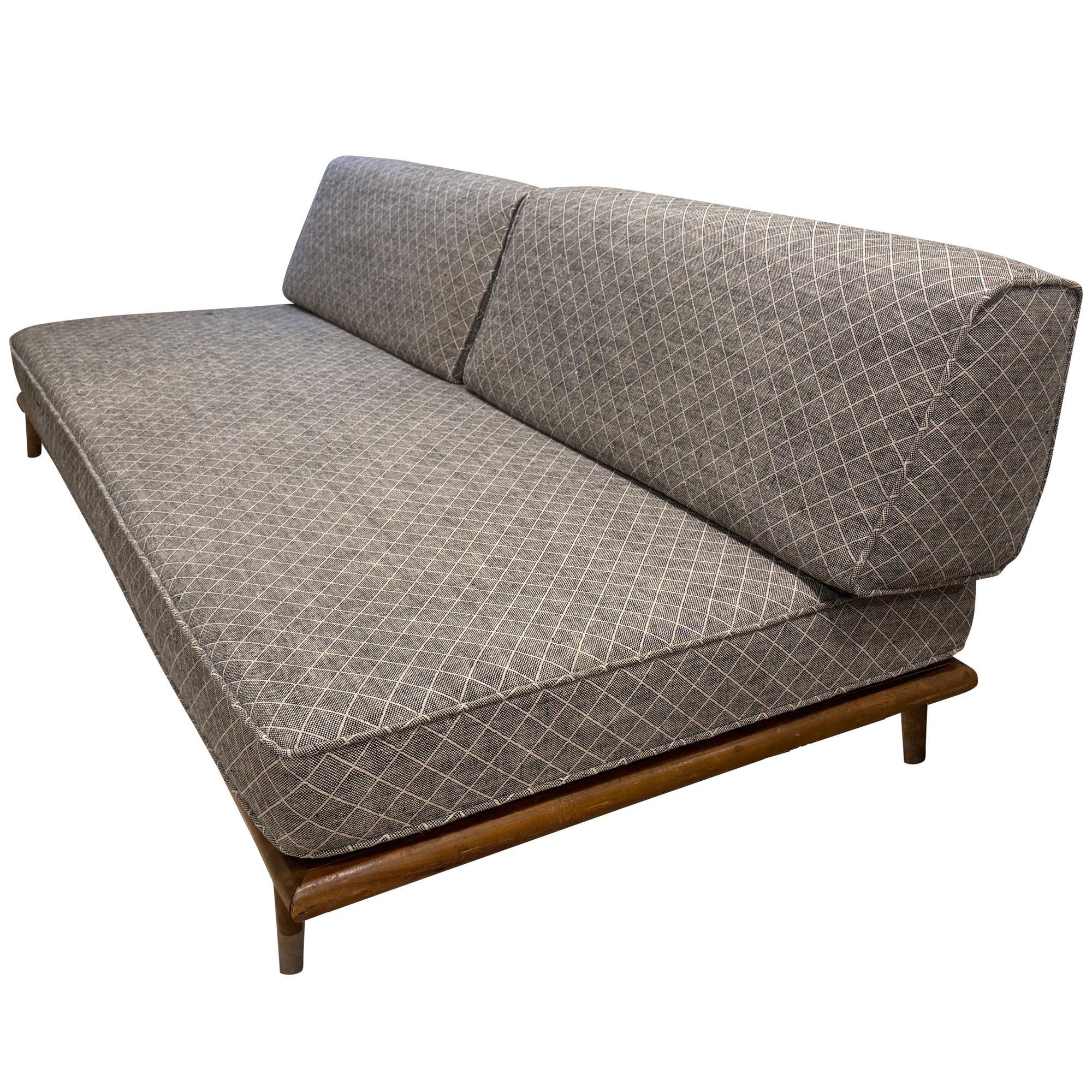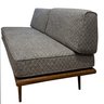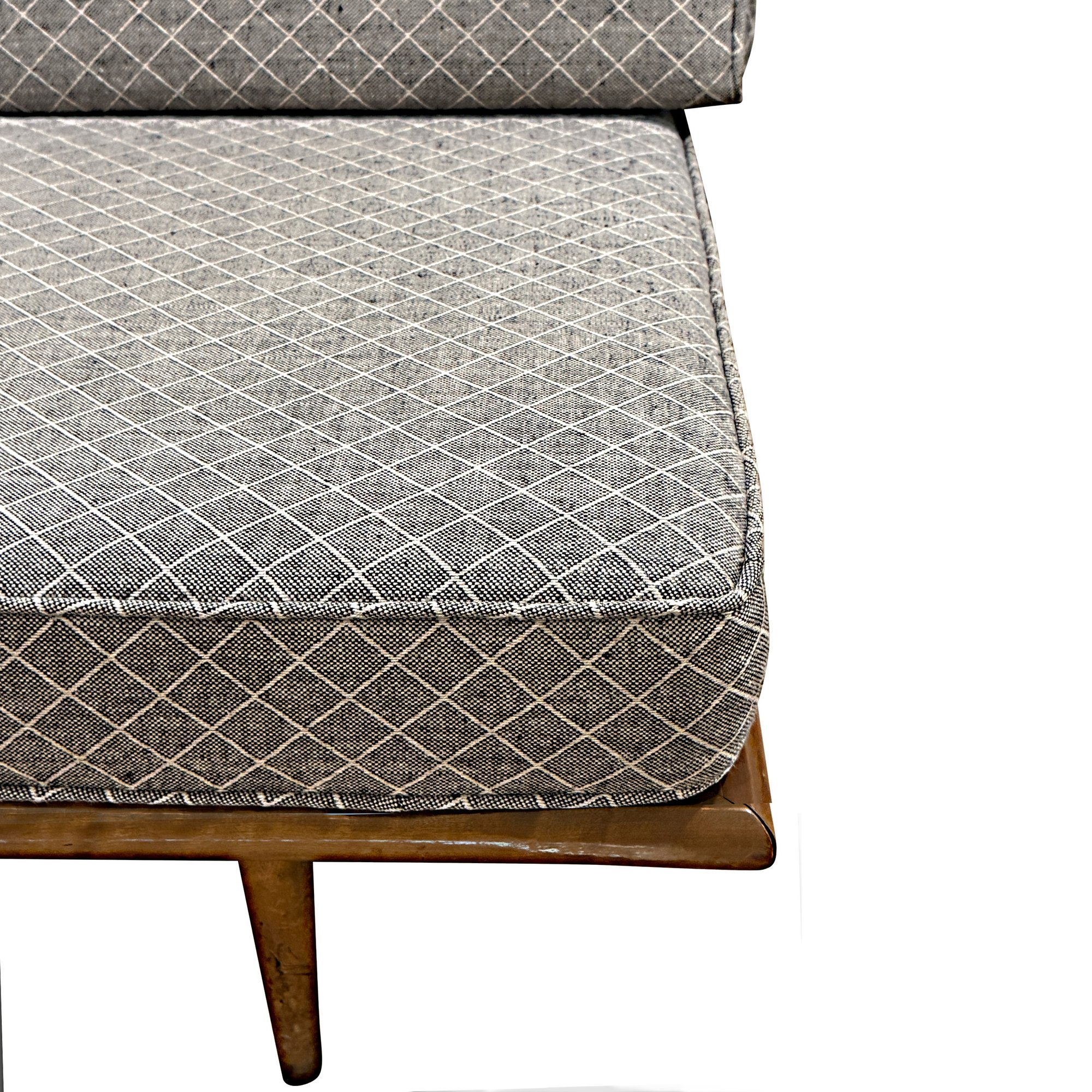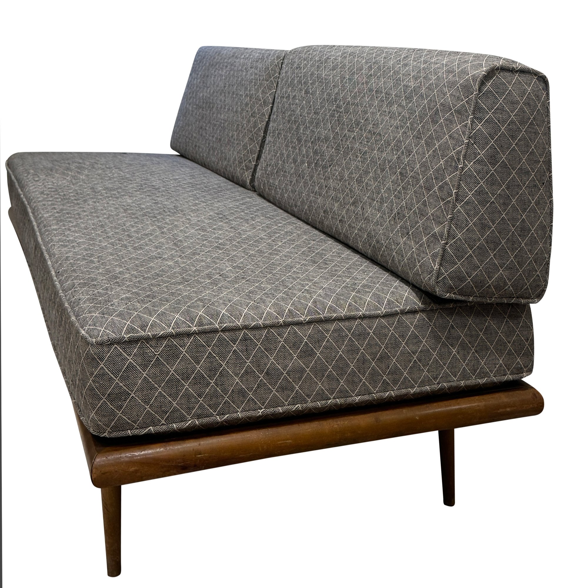 With its slim minimalist profile and tapered legs, and practical versatility, the Nelson Daybed has become a cornerstone of Mid Century Modern design interiors. A relaxing and stylish sofa with removable bolster cushions converts to a comfortable bed at night. A rare find in such good condition, the cushion and bolsters have been reupholstered in a quality vintage woven black and white fabric. All original walnut frame and metal springs, with Herman Miller label. Georg Nelson, one of the most influential designers of the 20th Century, designed this distinctive daybed in 1948, and it is still in production today.