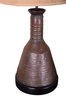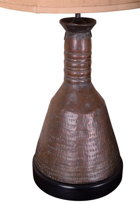This is a vintage copper lamp converted from a traditional handcrafted copper Persian vessel, mounted on an ebonized wood base, early 20th century. Excellent workmanship on this tall vintage one, tested and in working order.