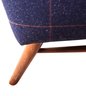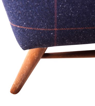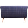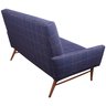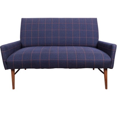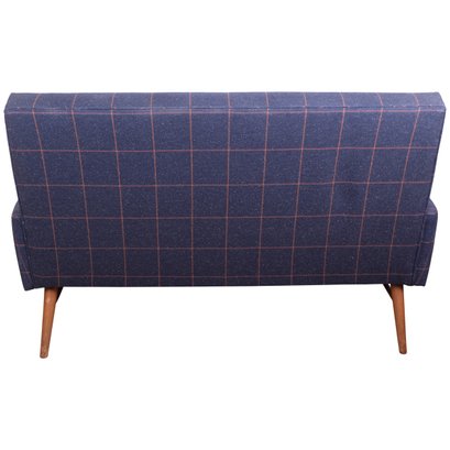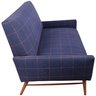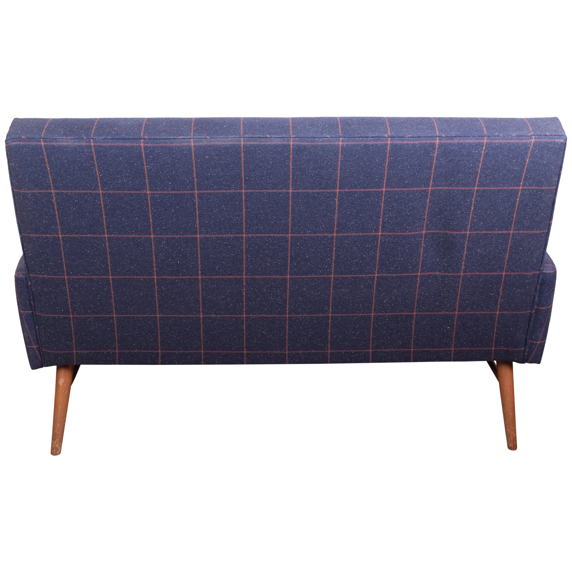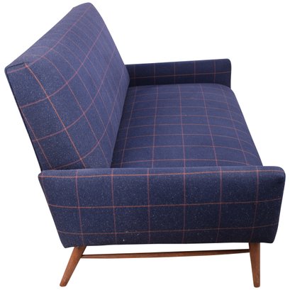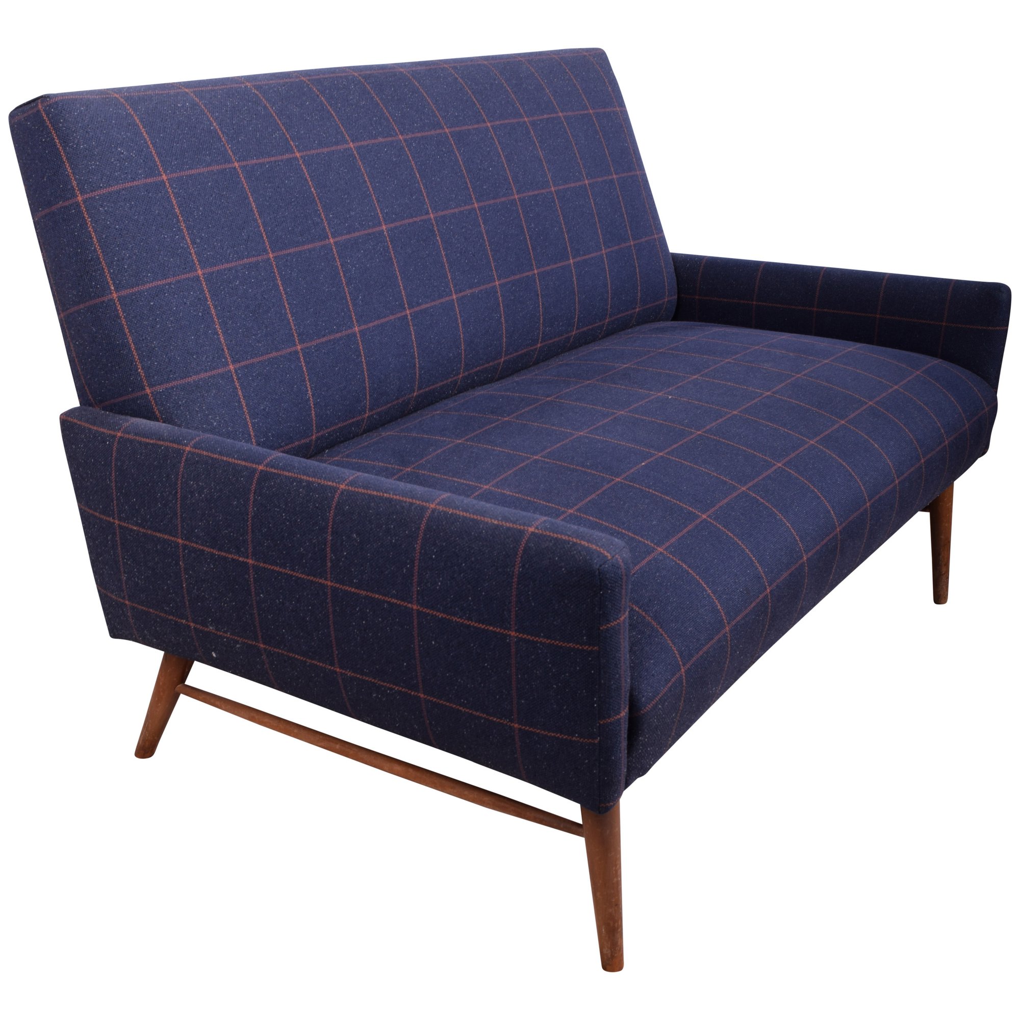 Classic lines on this graceful small settee, on 2 pairs of splayed bracketed legs and upholstered in tight navy blue plaid. In the style of Paul McCobb, the influential and prolific American furniture designer of the Mid-Century Modern era.