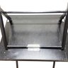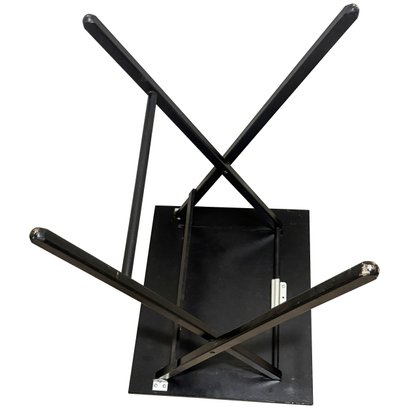 Vintage set of folding snack / TV tables with holding rack (two set of 3) with very good, lacquer-like black surface, good condition, lightweight frame that appears delicate, but is actually very sturdy. The top locks open with a spring clip, preventing accidental closure. These are good-looking, handy little snack tables that have been "dressed up." Size listed is per table.