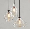 Great pottery barn light, brand new in box. It came with one broken glass shade so it only has two in damaged usable shaded with it. The largest one is missing. Light has never been hung and has the original box. Made of blown glass and a steel frame with hand applied distressed antique bronze finish.