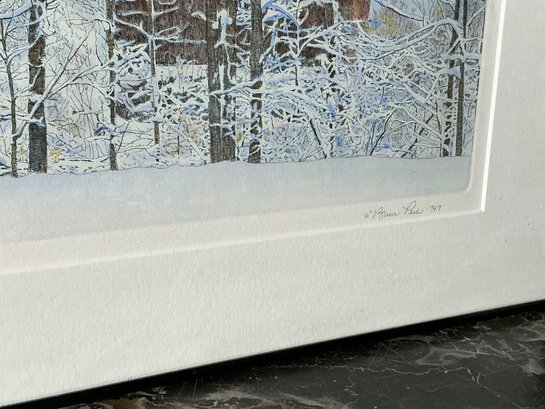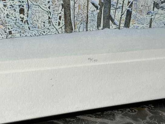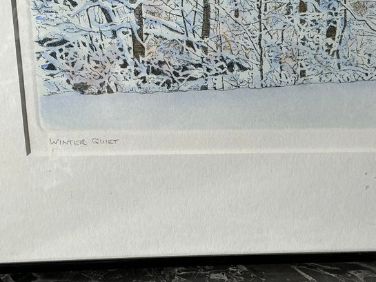 Beautiful Bruce Peck Etching signed and numbered 43/150 “Winter Quiet” excellent condition. Measures 22.5 inches tall x 28 inches long.