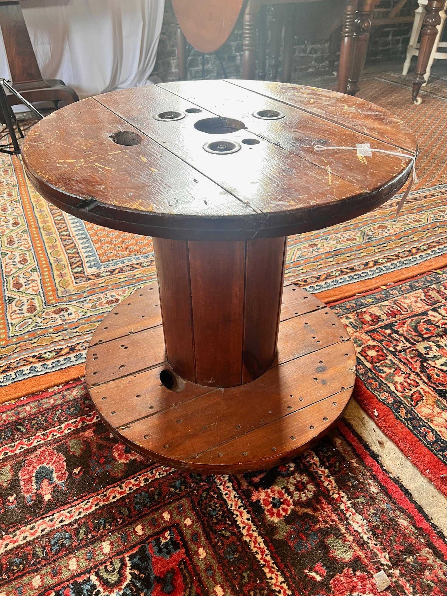 Vintage solid wood electrical spool on wheels. In very good used condition. Great display or movable small work station.