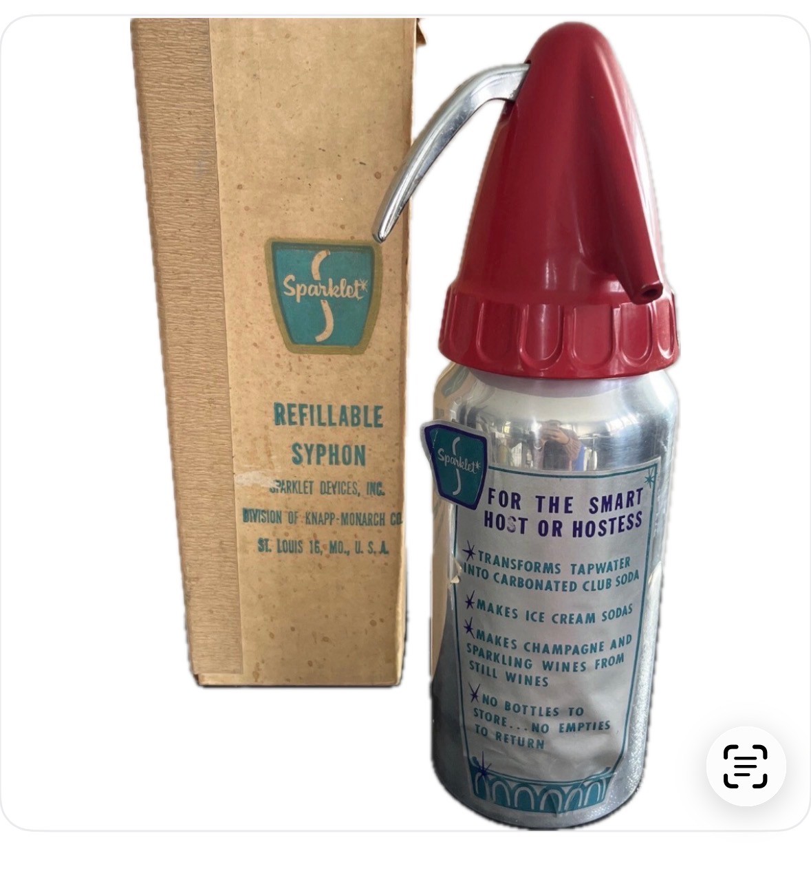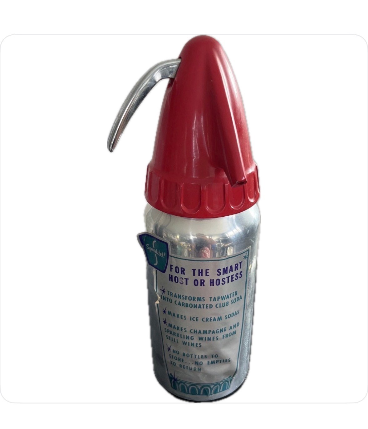 This vintage 1950's "Sparklet" Atomic Carbonator is a must-have for any barware collector. Made of metal and plastic, this original piece was manufactured in the United States. It has the ability to turn wine into champagne and is guaranteed to impress any guests. Whether you're hosting a party or just looking to add some vintage charm to your home bar, this piece is sure to impress. Don't miss out on the opportunity to own a piece of barware history.