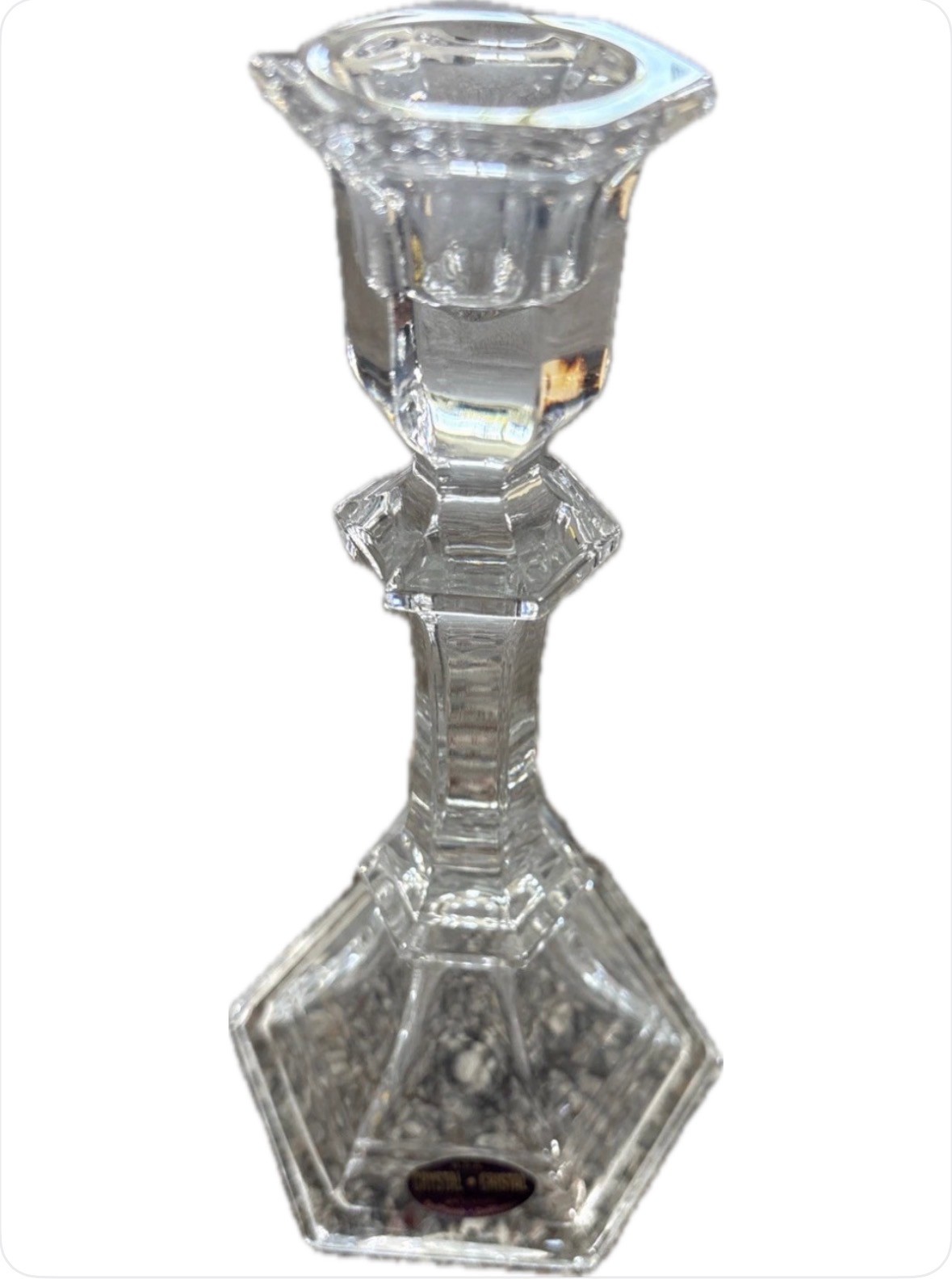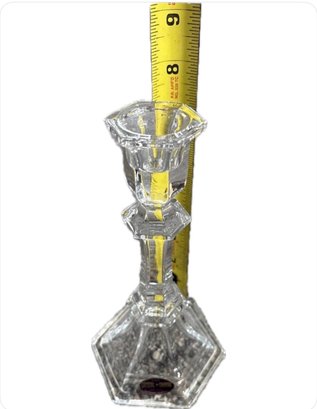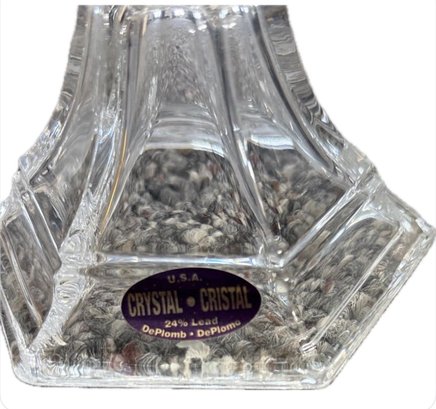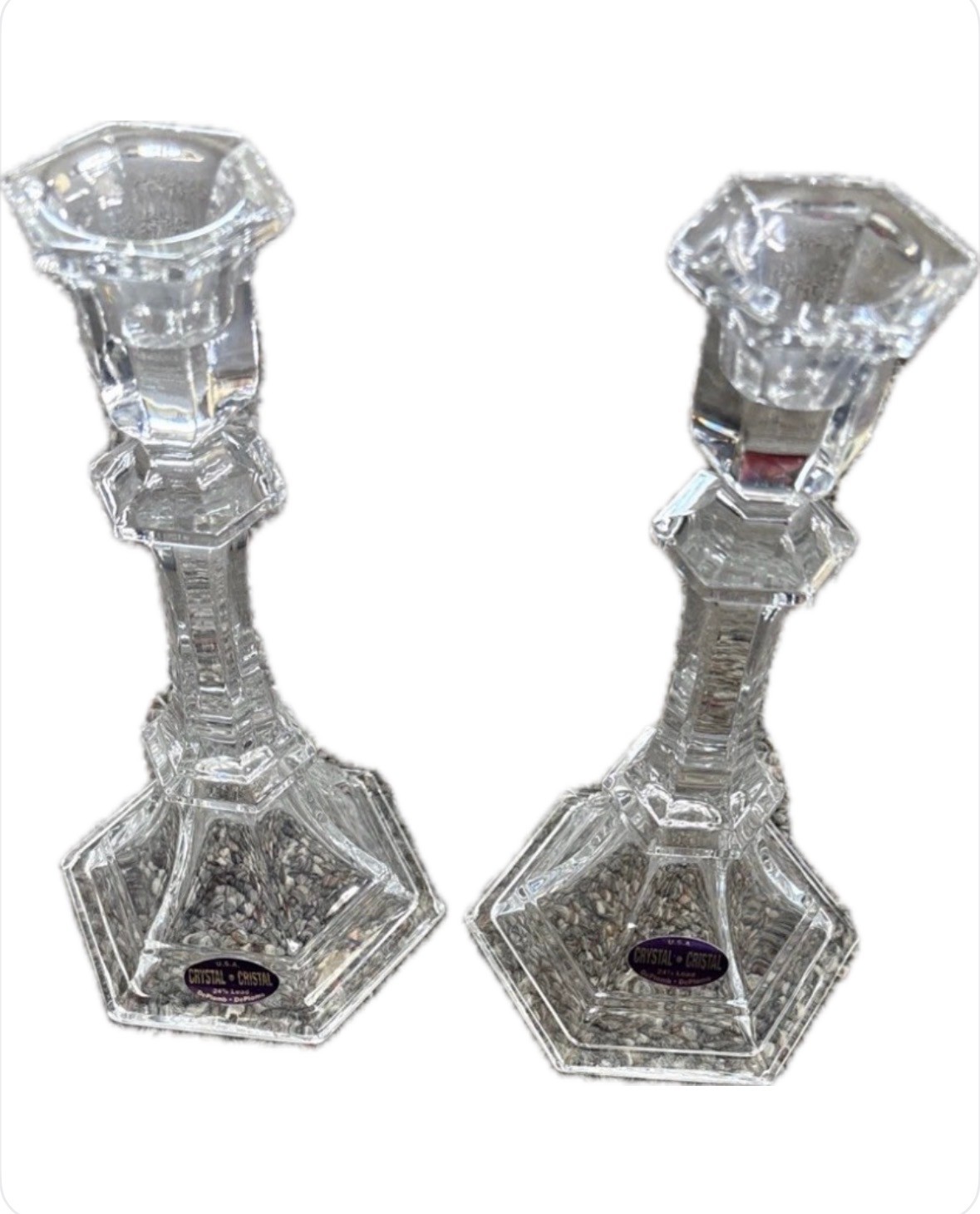 This product is a pair of 24 lead crystal candlesticks made in the USA. The candle holders are chunky in size and clear in color, with a beautiful crystal design that adds elegance to any space. These decorative collectibles are perfect for adults looking to add a touch of sophistication to their home or collection. Each candlestick is made of high-quality glass and features intricate crystal details, making them a stunning addition to any home decor.
