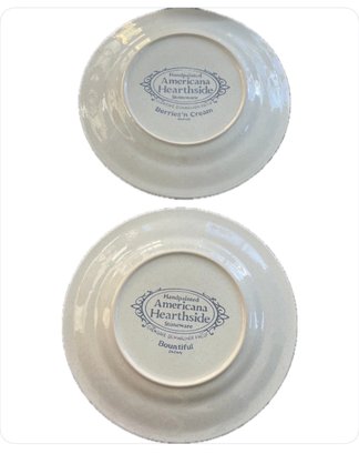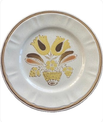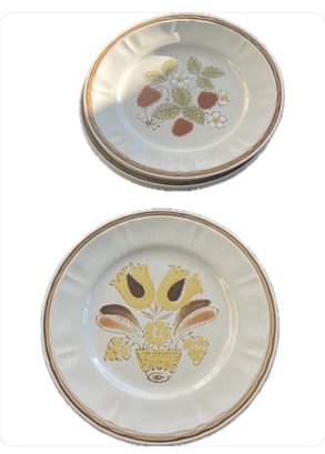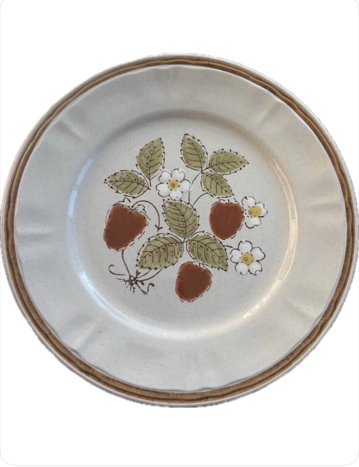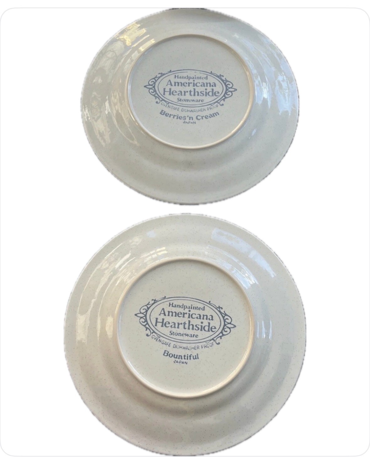 This American Hearthside dinner plate is a must-have for any collector of vintage pottery. The plate features a delightful berries and cream pattern that is sure to add a touch of retro charm to any dinner table. Crafted from durable stoneware, this four-piece set is perfect for all occasions and is sure to impress your guests. The plate measures 10 inches in diameter and features a round shape with a printed backstamp. Made in Japan during the 1970s, this original piece from the Hearthside product line is a true gem. Whether you're an antique collector or simply looking for a unique addition to your dinnerware collection, this American Hearthside plate is sure to impress. Four plates total, 3 Berries n Cream and 1 Bountiful