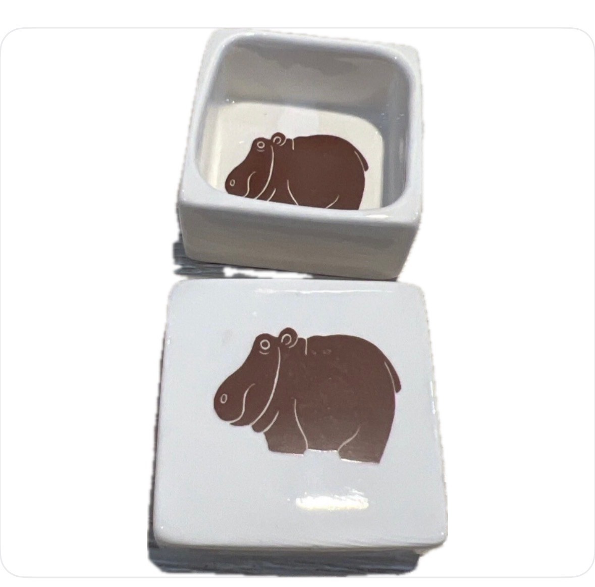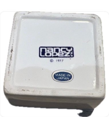 This vintage Nancy Lopez jewelry box is a unique addition to any collection. With a square shape and glossy finish, it is made of ceramic and porcelain materials in a beautiful white color. The box features a hippo subject, paying homage to the famous African animal. Measuring at 2 inches in length and width, and 1.5 inches in height, this small jewelry box is perfect for all occasions. It comes boxed and is a part of the Nancy Lopez collection, manufactured in Japan in 1977. The box is a perfect fit for anyone looking for a decorative piece that is both functional and stylish