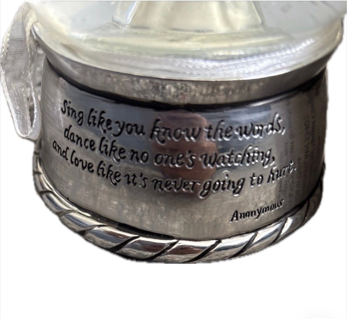The product is a brand new silver toned angels snowglobe musical featuring a round shape and medium size. Made of silver and glass, this unique snow globe plays music and is part of a collection of snowglobes. The design includes angels as the subject and is themed around music, making it a perfect item for all occasions. This original piece is a beautiful addition to any collection or as a special gift for someone who appreciates unique and musical decor.