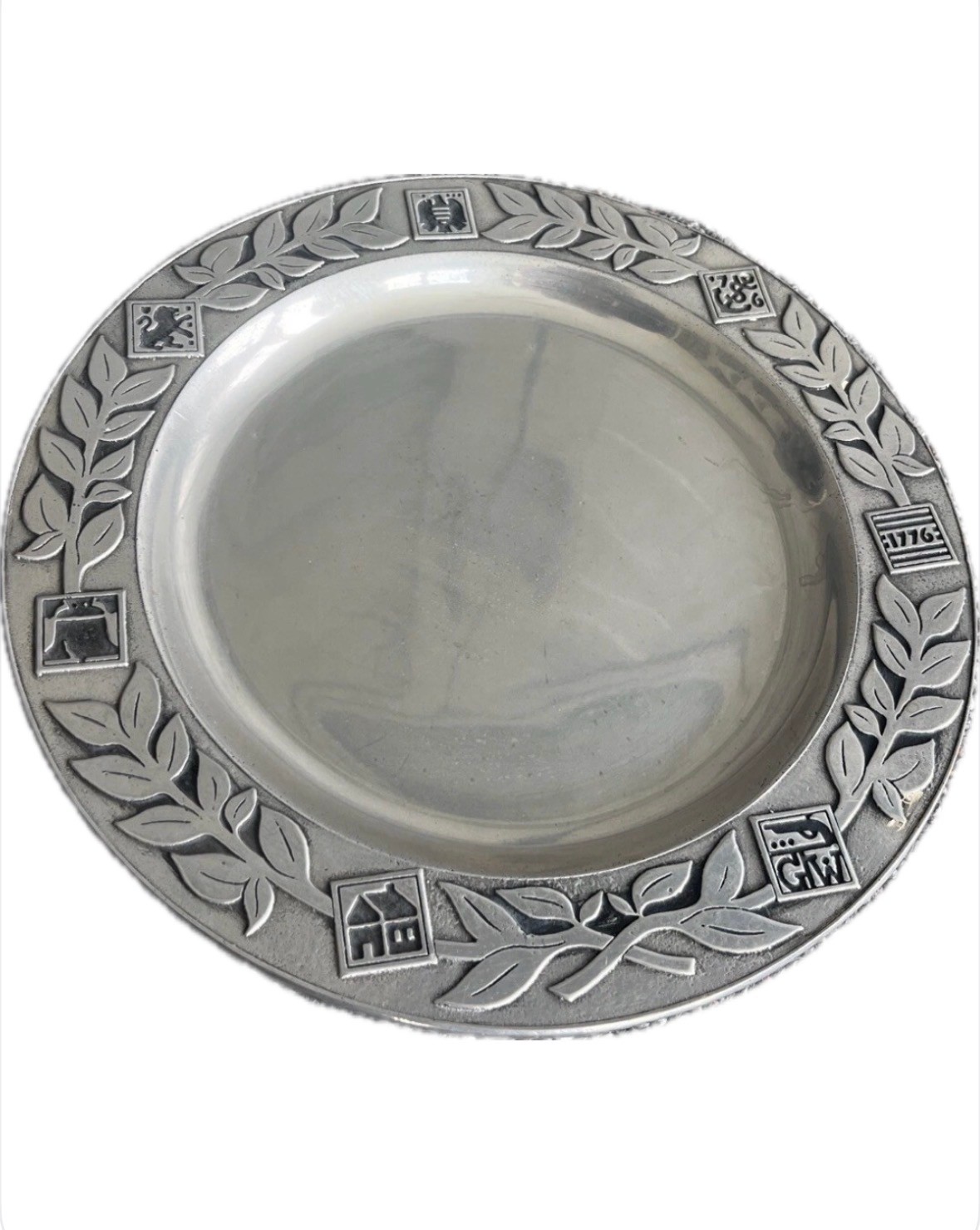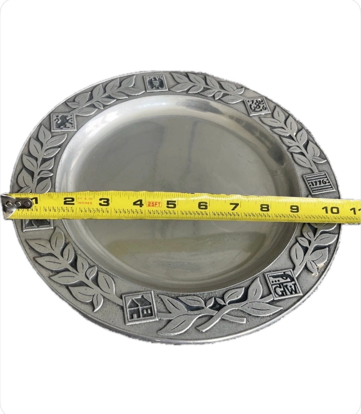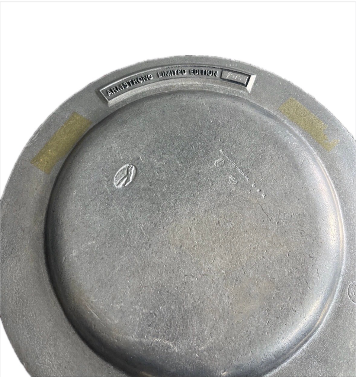 This limited edition Armstrong Pewter Plate from Wilton is a true gem for collectors of metalware. Made in the United States and crafted from high-quality pewter, this plate is a testament to the craftsmanship and attention to detail that went into producing this piece. The plate measures 10 7/8 inches in diameter and features intricate designs that are sure to catch the eye of any admirer. It is the perfect addition to any collection of pewter objects and is sure to impress guests and admirers alike. Whether you are a seasoned collector or just starting out, this limited edition Armstrong Pewter Plate from Wilton is a must-have.