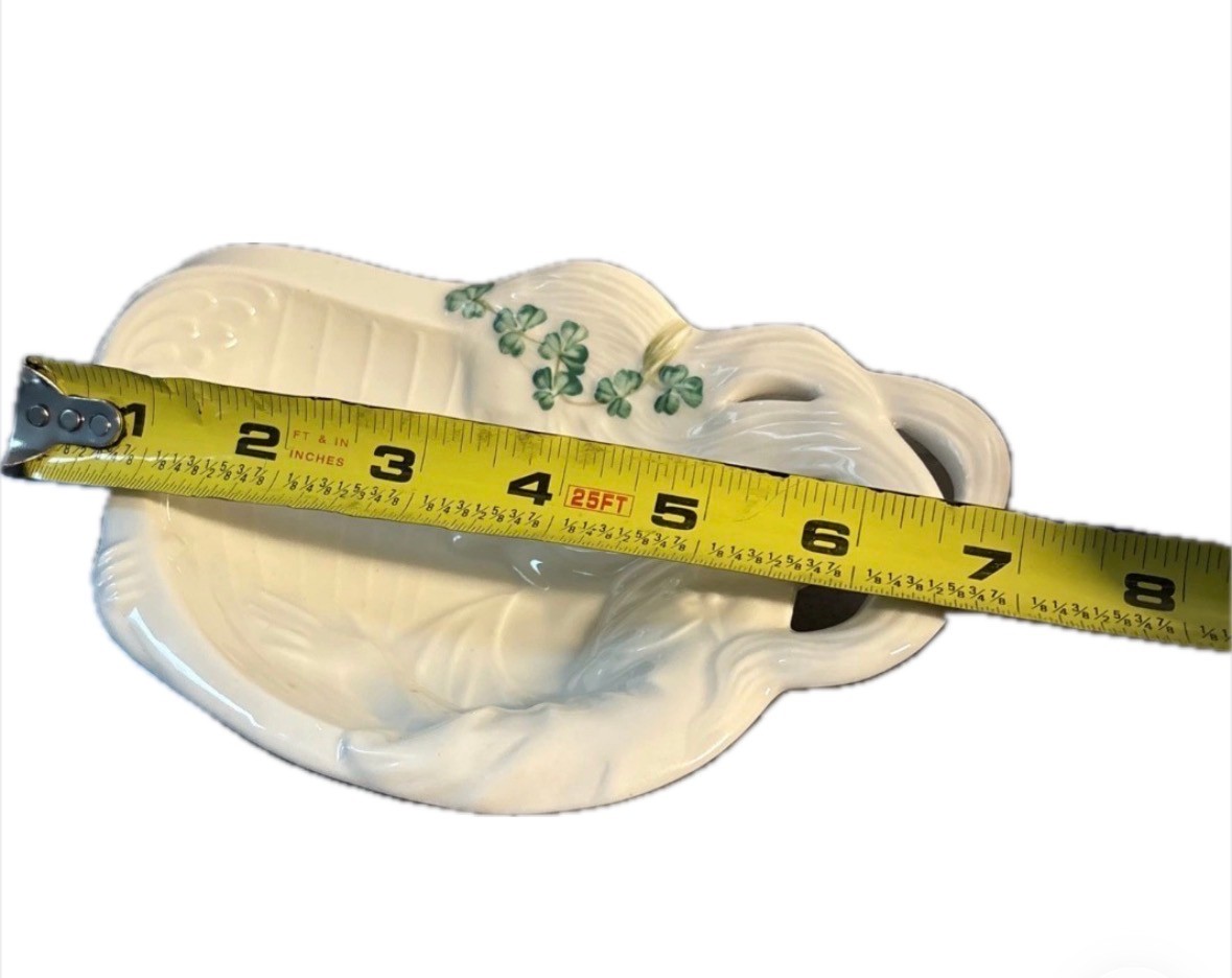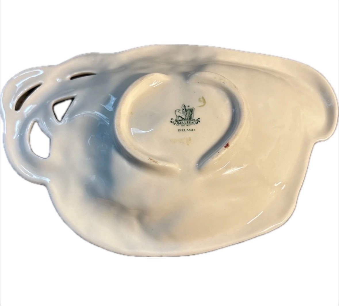 This elegant Belleek tray is a must-have for any collector of art pottery. The oval shape and intricate details of the design make it a beautiful piece to display, and the porcelain material ensures its durability. The tray features a woman with a harp, adding a touch of sophistication to any home decor. It is perfect for use as a decorative piece or as a functional tray for serving candy or trinkets