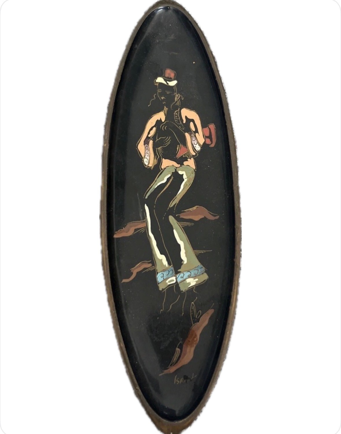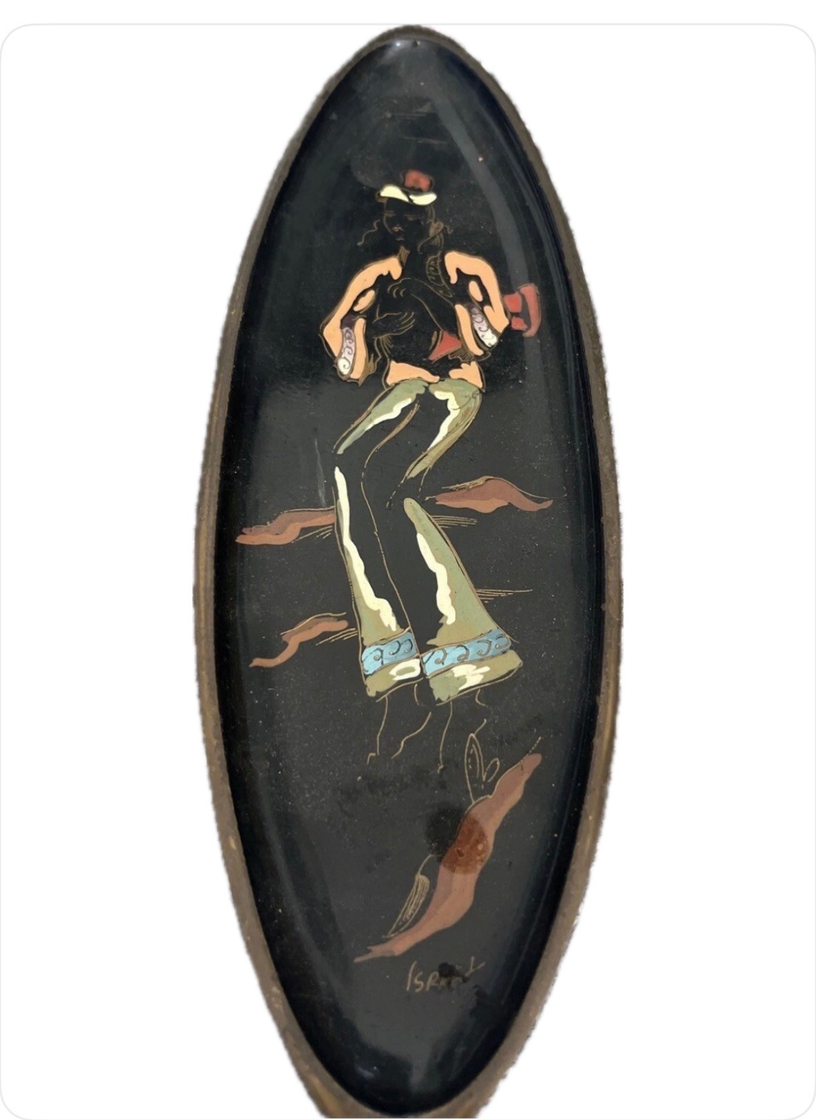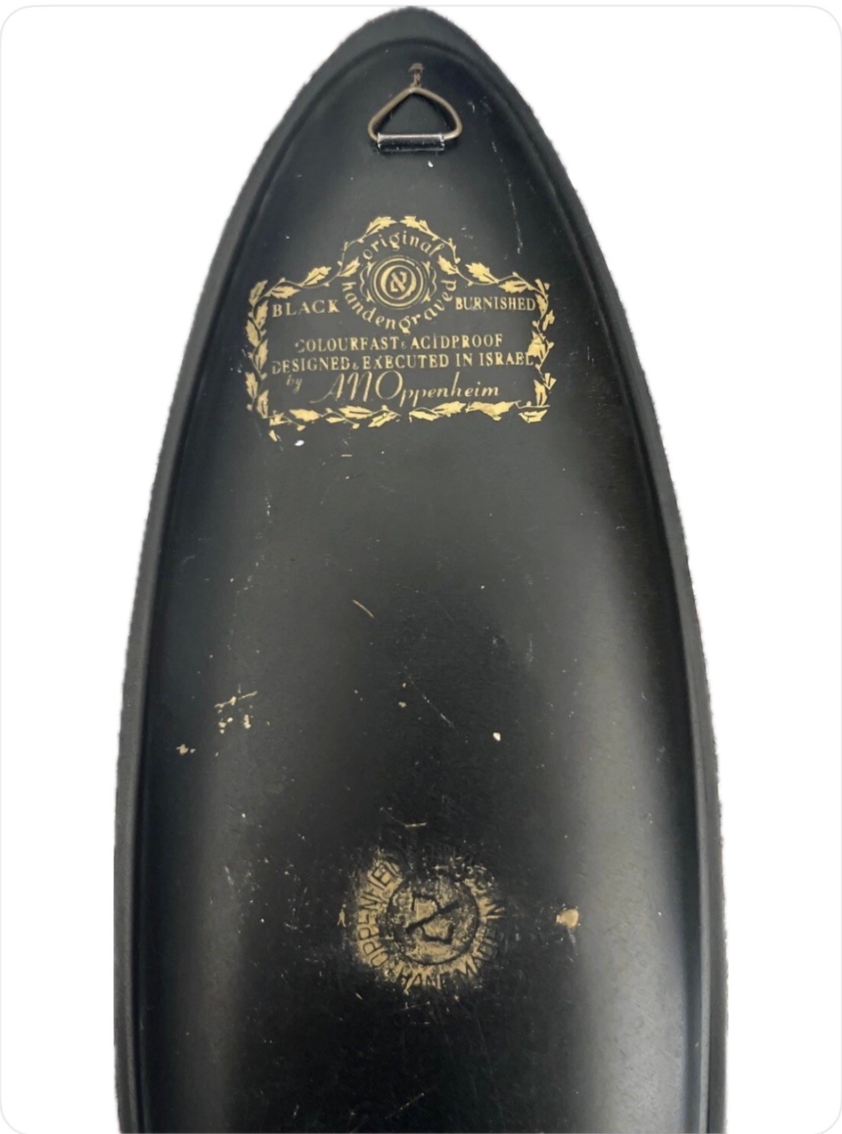 This black burnished wall plaque is a stunning piece of home decor made in Israel by A.N. Oppenheim. The plaque features a sleek metal design and is perfect for adding a touch of elegance to any room. Ideal for those who appreciate high-quality craftsmanship, this plaque is a must-have for any home decor enthusiast. Its color and material are sure to complement any interior design style, making it a versatile and timeless piece. Add this beautiful plaque to your collection today and elevate the look of your home